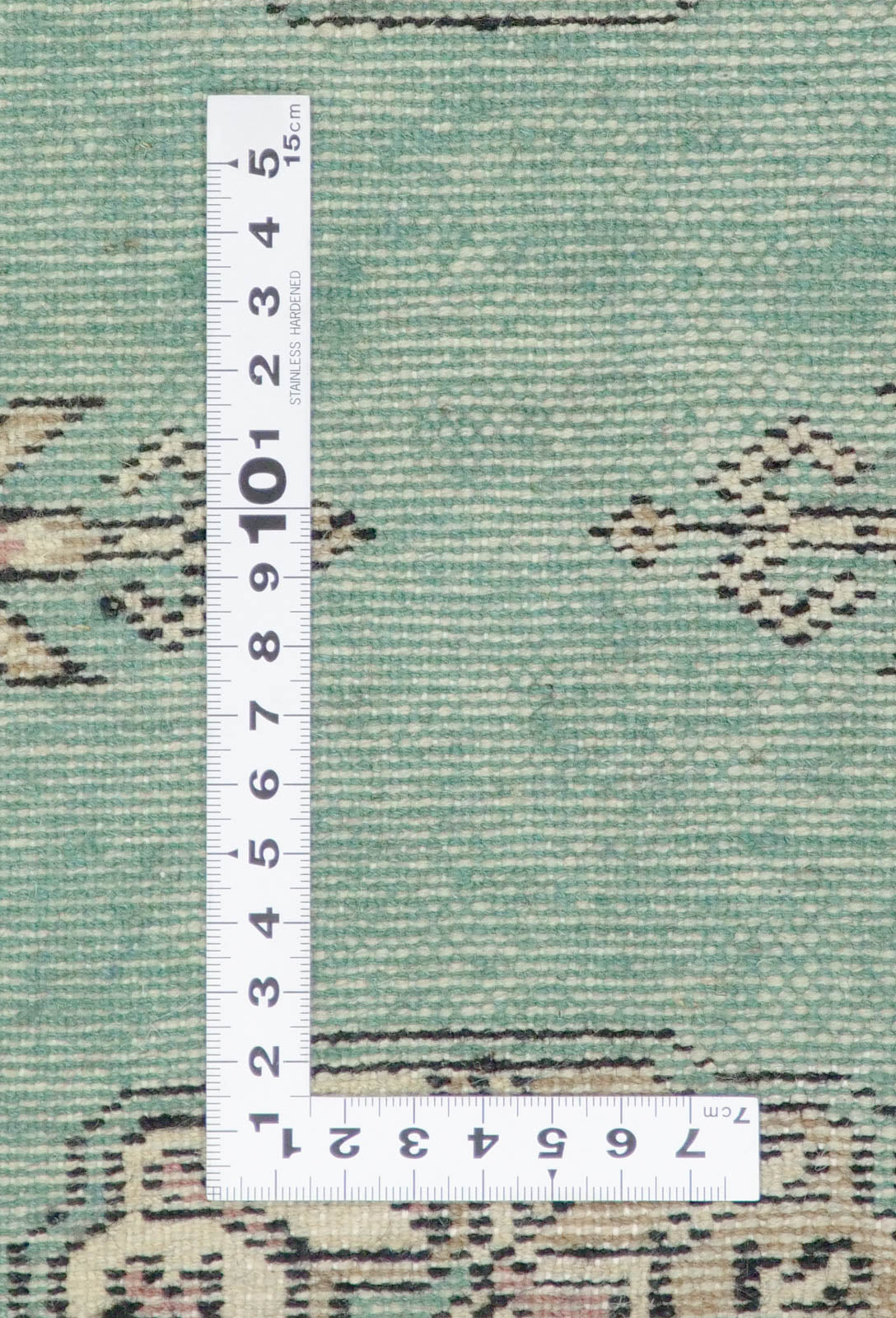 こちらの絨毯は、パキスタンのパンジャーブ州、ラホールで織られた手織りの絨毯です。ブルーを混ぜたようなグリーンをベースカラーにパキスタン絨毯の特徴である幾何学模様が美しくデザインされました。