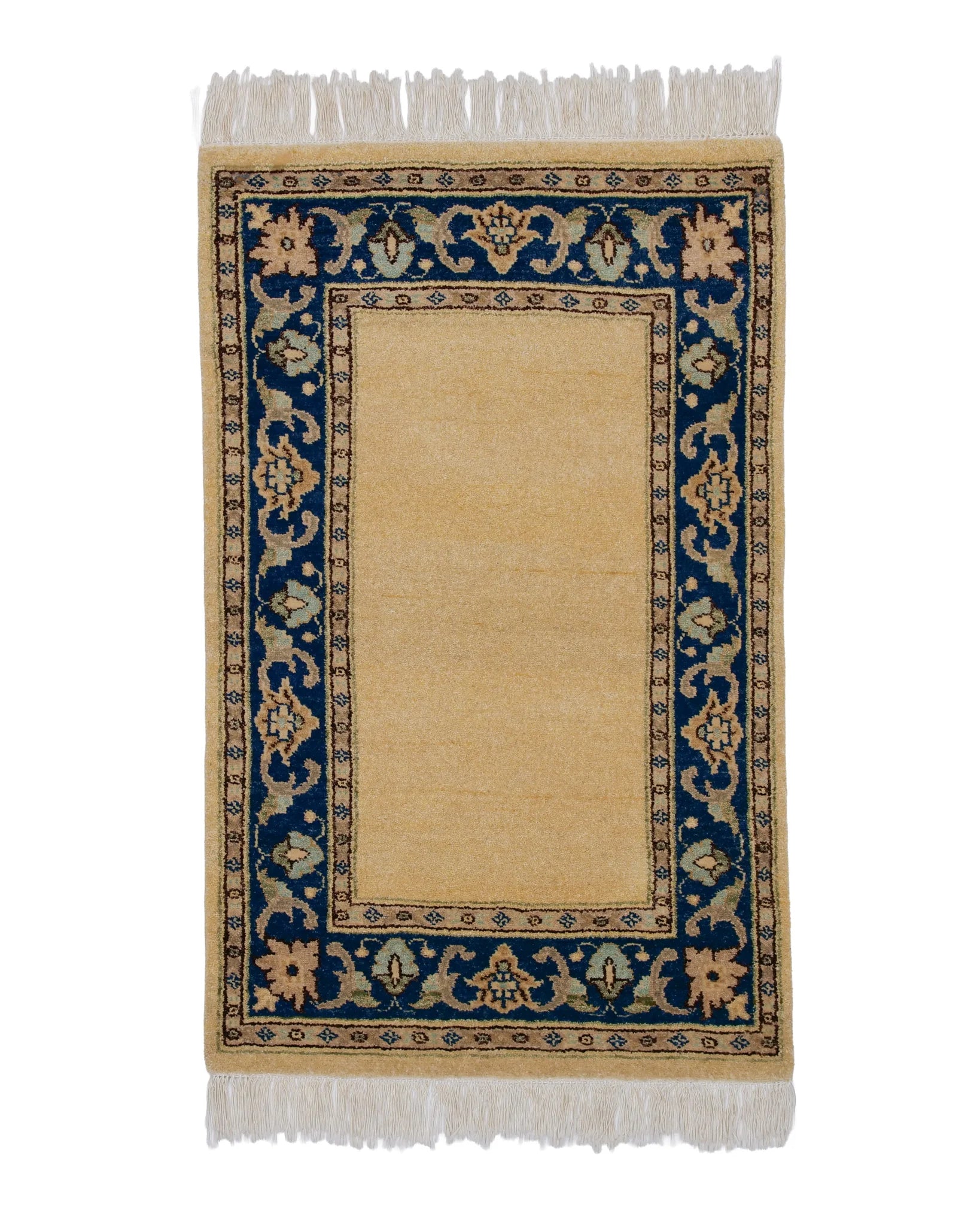 落ち着いた黄色の地に、深い藍色の縁取り。草花モチーフが丁寧に織り込まれ、クラシックでやさしい印象に。