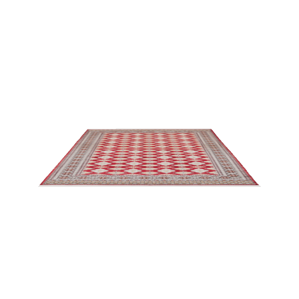 こちらの一枚は、赤を基調に、整然とした幾何学模様が精密に織り込まれています。