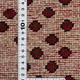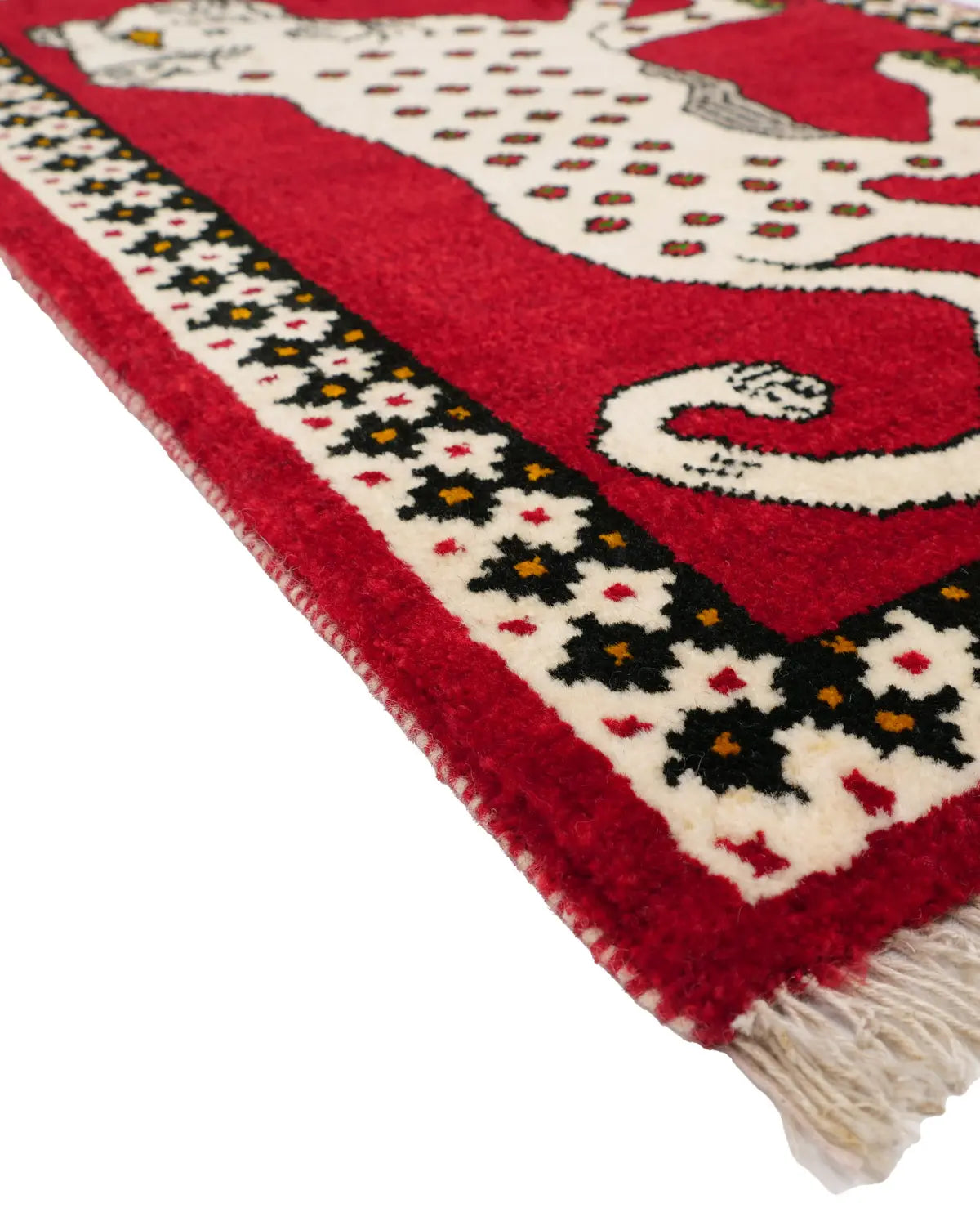 クラシカルな赤色をベースに、中央にはまるで飛び出してきそうなヒョウの絵柄が織り込まれ、縁には幾何学模様がアクセントを加えています。