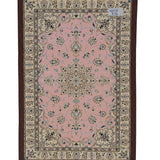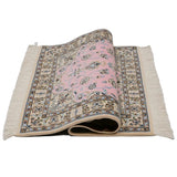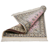 模様を際立たせるため、白い縁取りにはシルクが使用され、その光沢が絨毯の模様を立体的に引き立たせています。