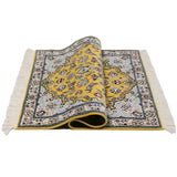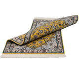 模様を際立たせるため、白い縁取りにはシルクが使用され、その光沢が絨毯の模様を立体的に引き立たせています。