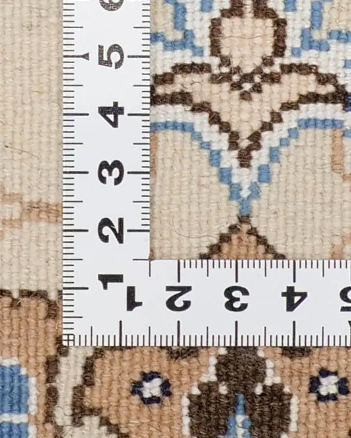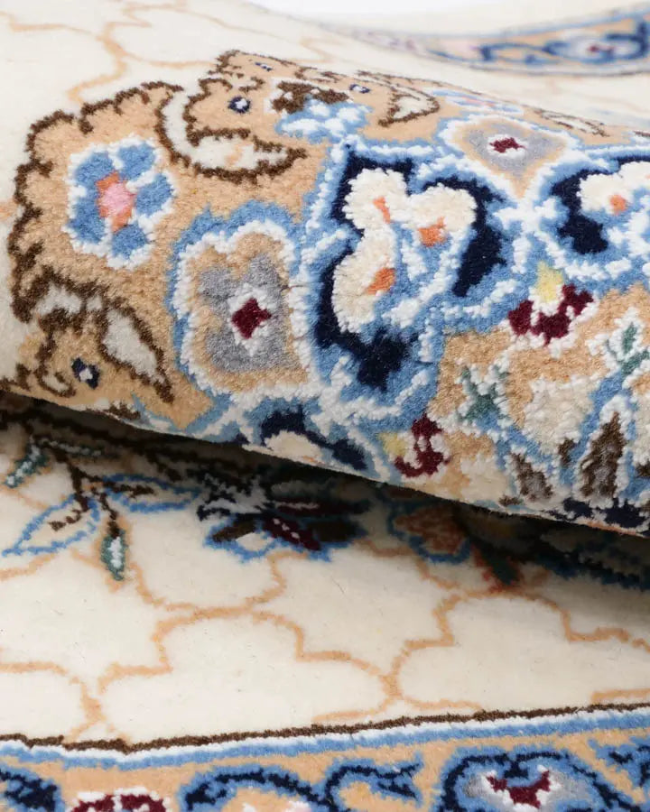 ナイン産ペルシャ絨毯は、柔らかい羊毛を使用し、シルクで模様を縁取ることで立体的に浮かび上がるのが特徴です。色調はベージュを基調にブルーやグリーン、アイボリーなど落ち着いた配色が多く、日本の住宅にもよく合います。