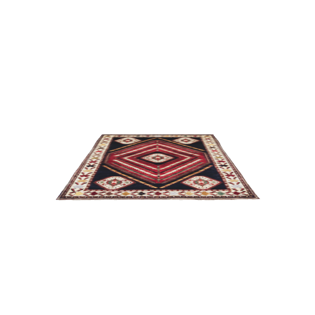 中央に大きなひし形のメダリオンが配され、その周囲には幾何学的な文様が並び、力強さとリズム感のあるデザインに仕上がっています。