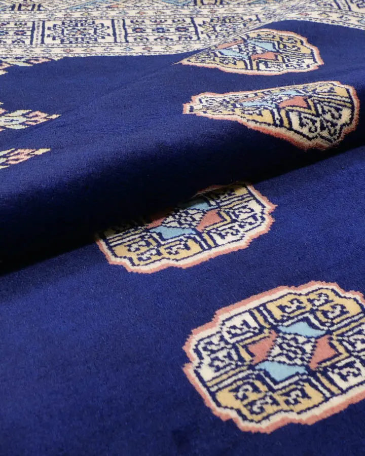 The base color is deep blue, with a row of oval patterns called the "Bohara pattern" in the center.
