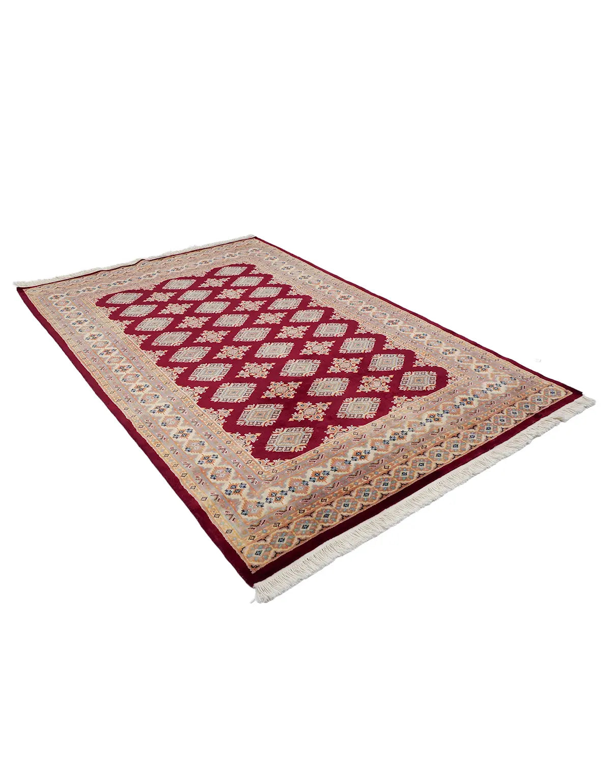 ラホール産パキスタン絨毯 ウール製 赤地の幾何学模様ラグ