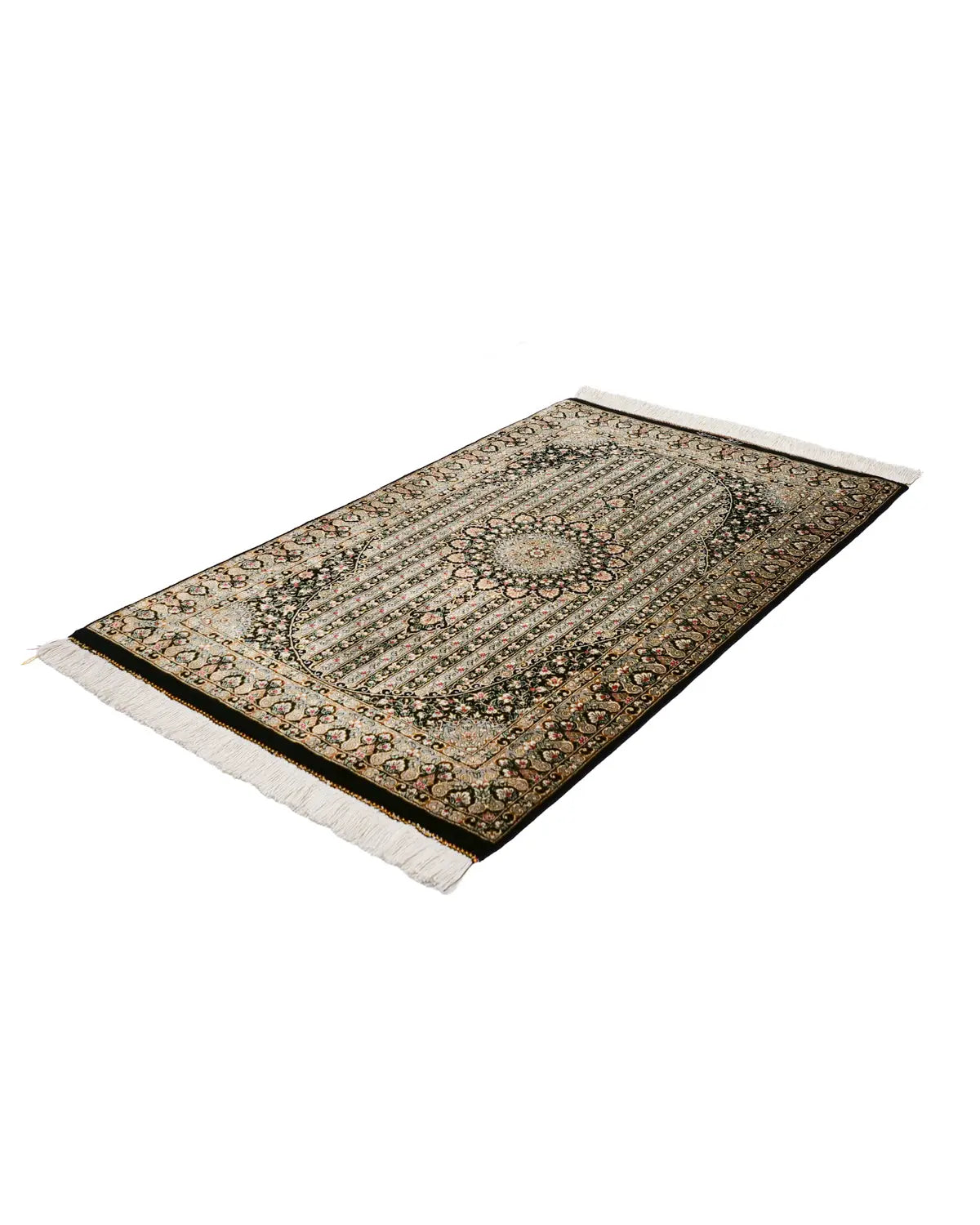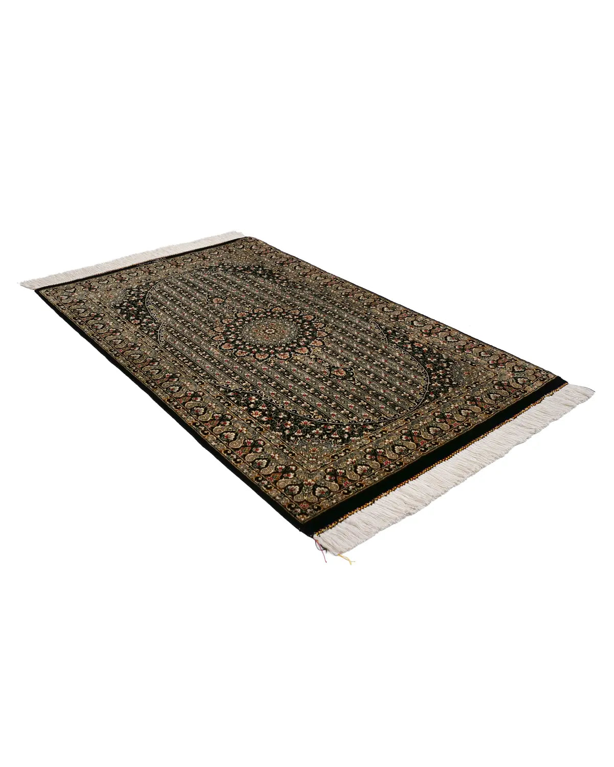 クム産シルクペルシャ絨毯 黒色 花形メダリオン