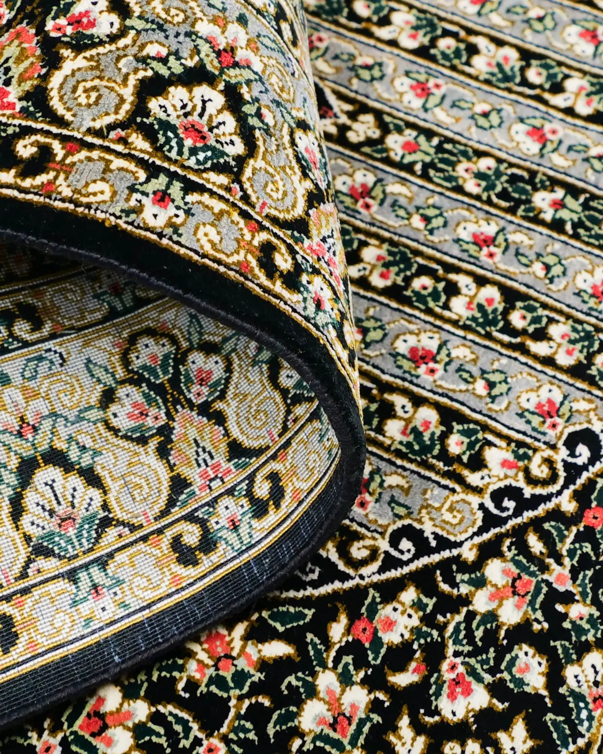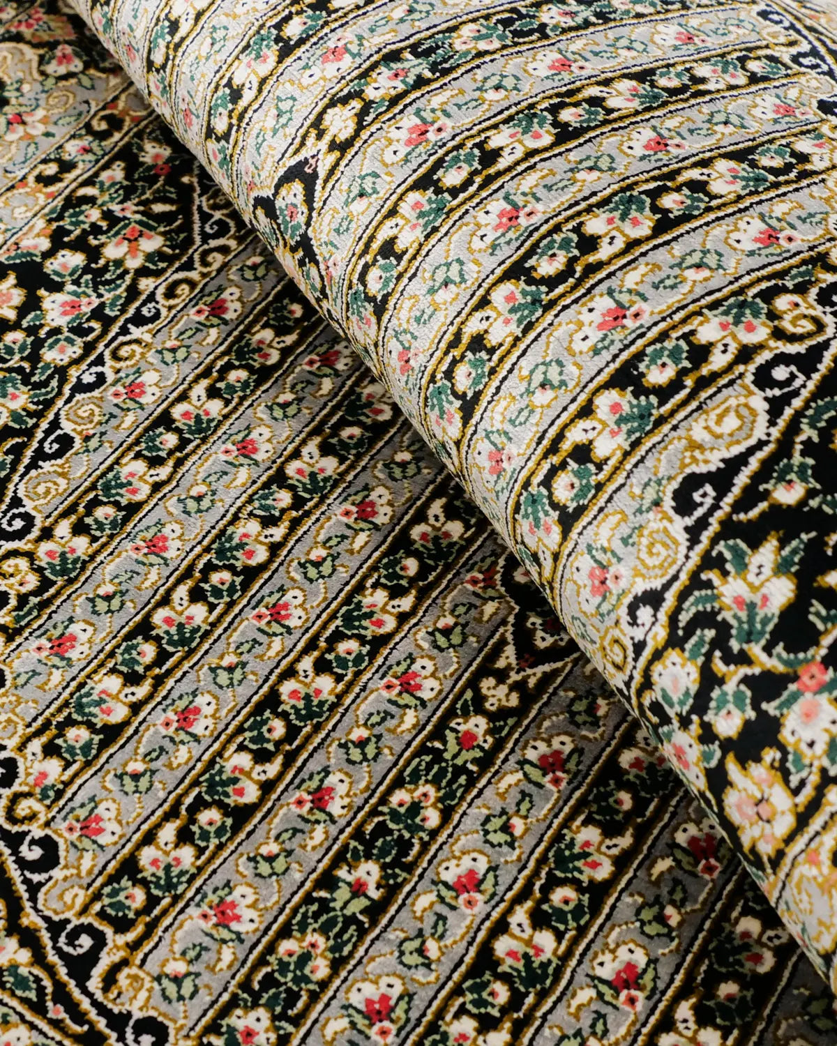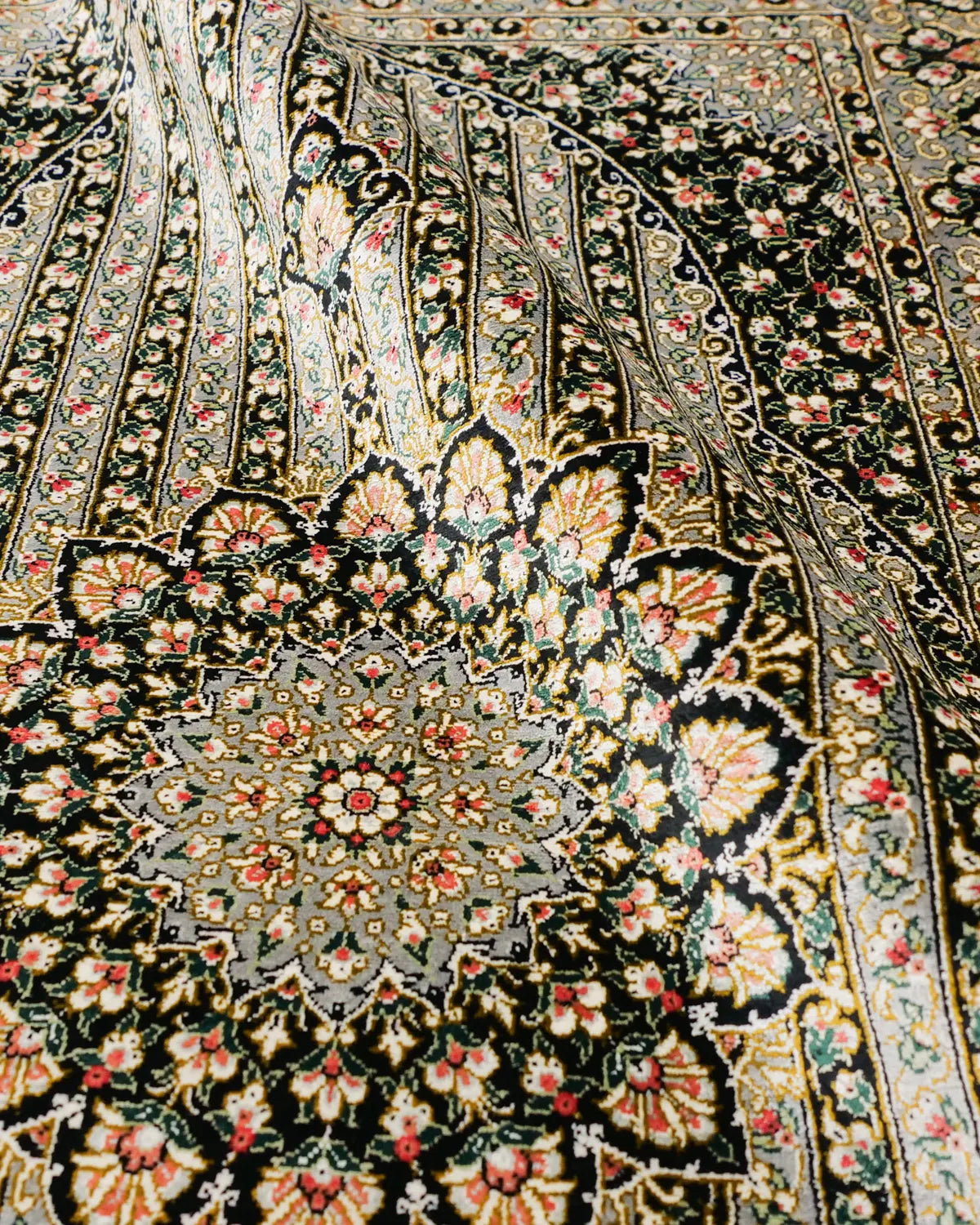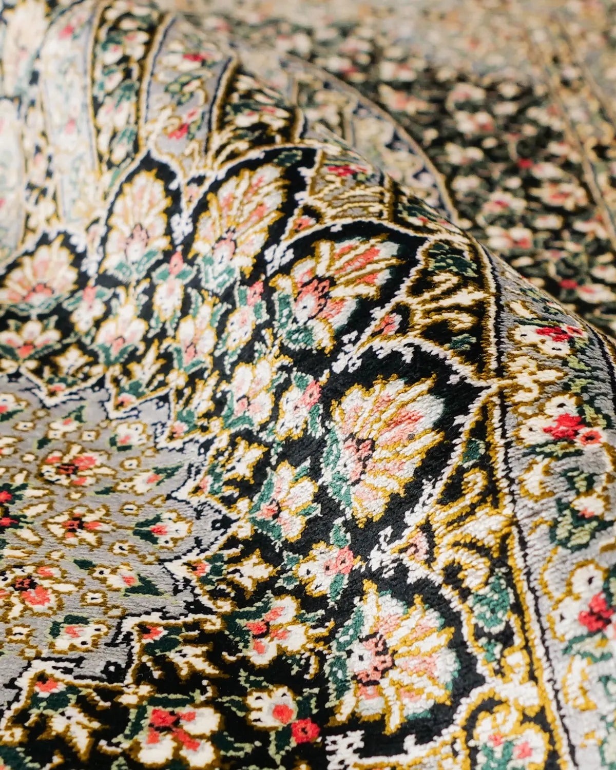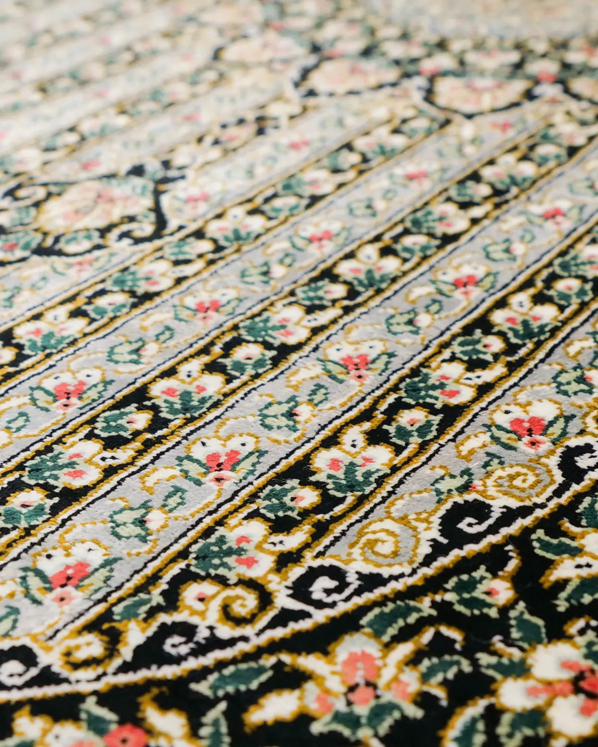 黒地ペルシャ絨毯 シルク製 クム産 花模様