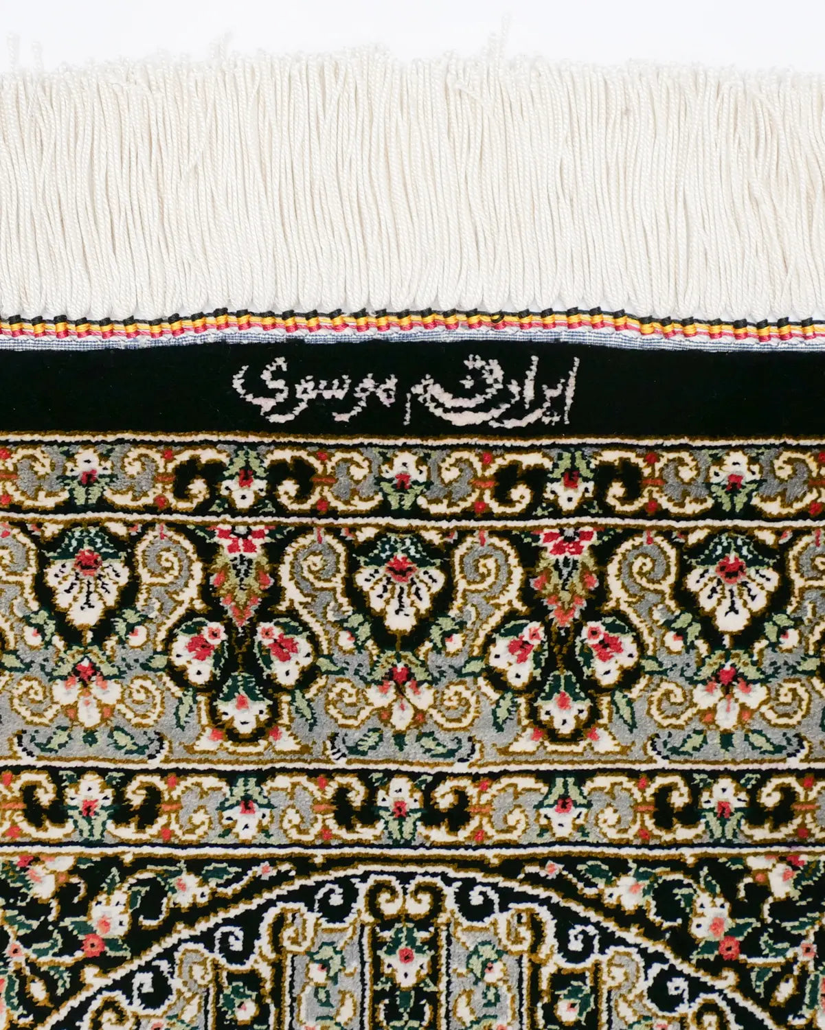 ペルシャ絨毯 ムサヴィ工房 クム産 シルク 黒地 メダリオン文様