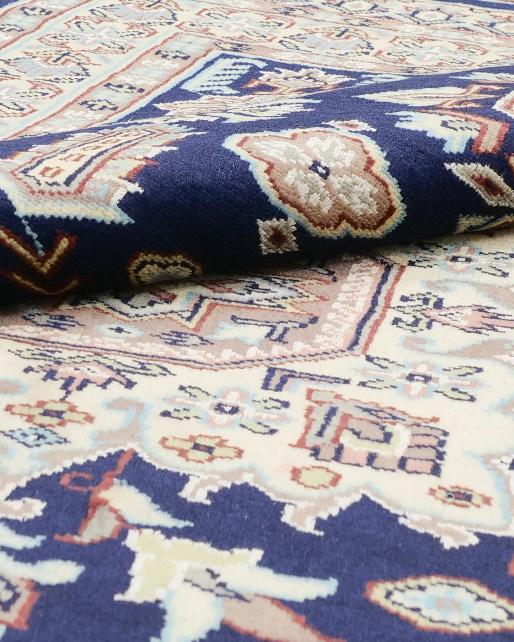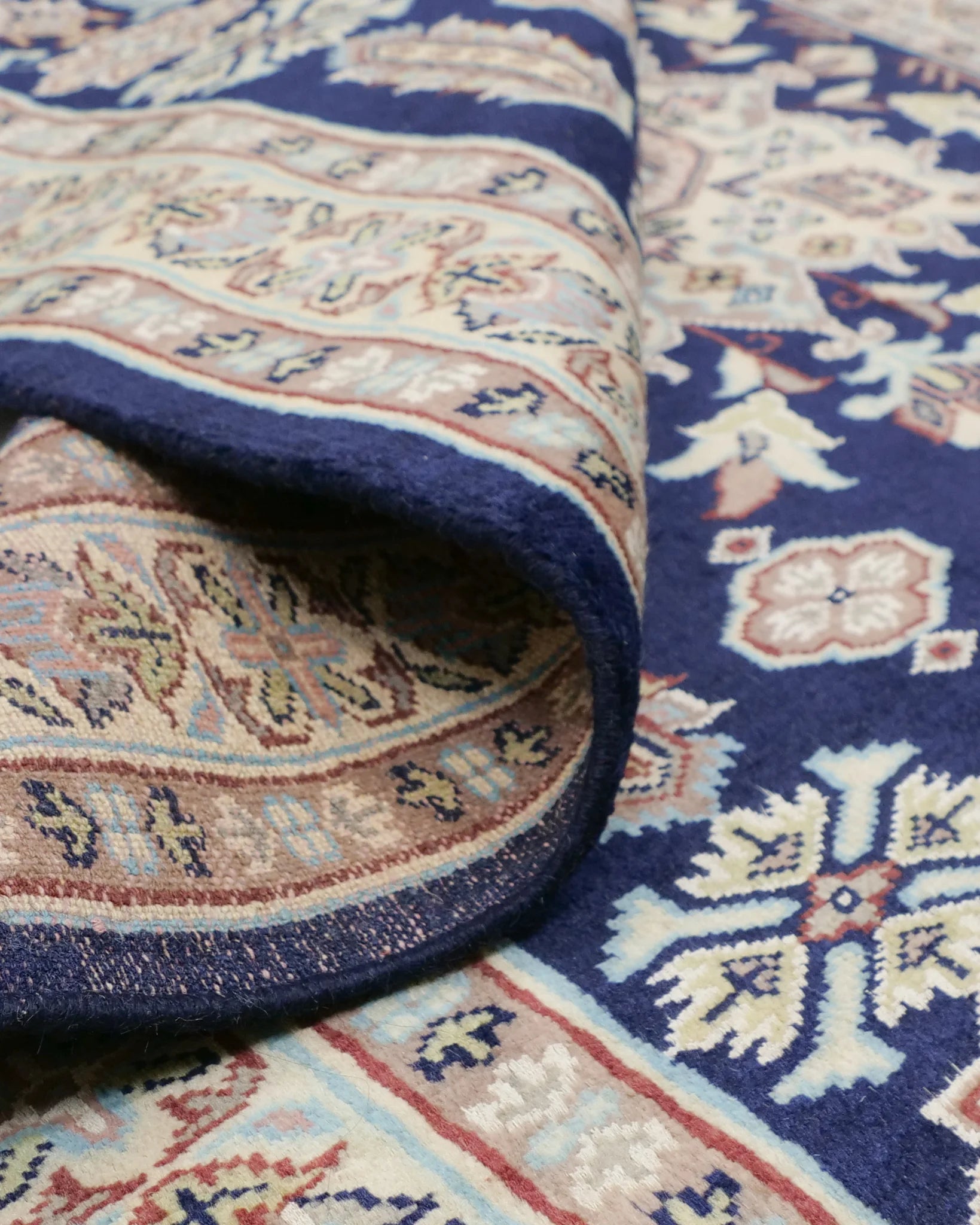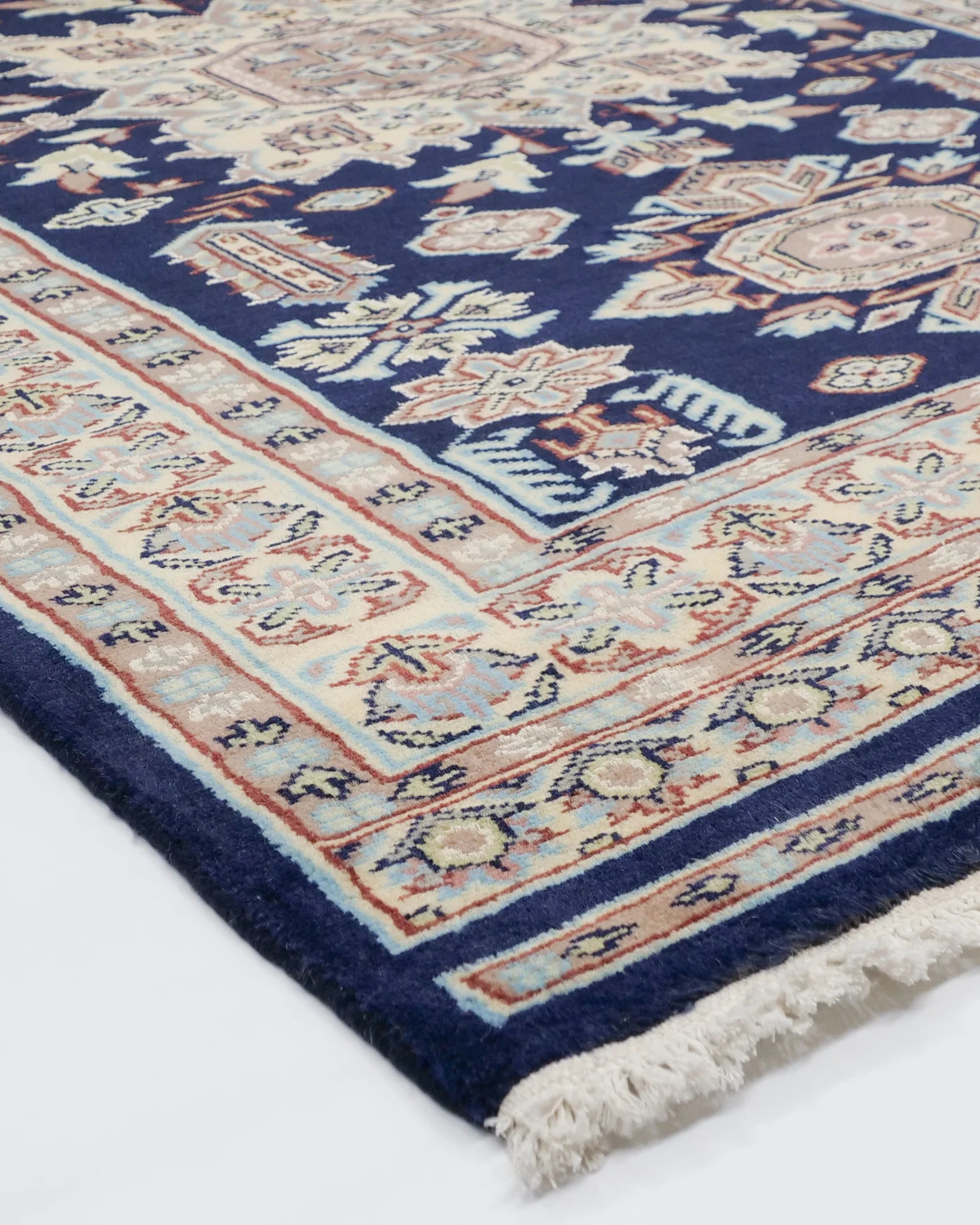 深みのあるネイビーブルーに花と幾何学模様が織り込まれたパキスタン絨毯