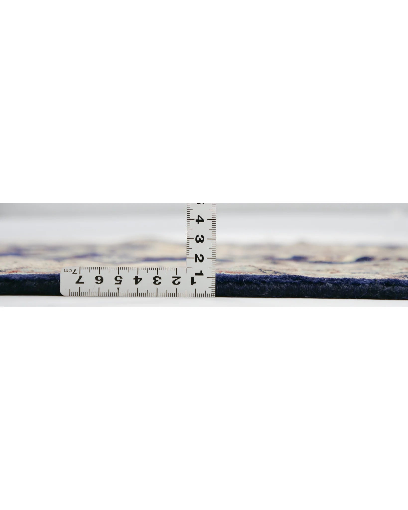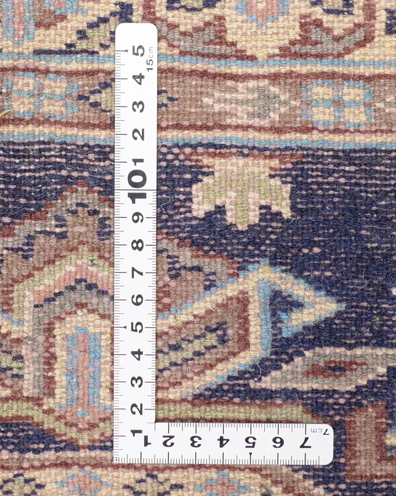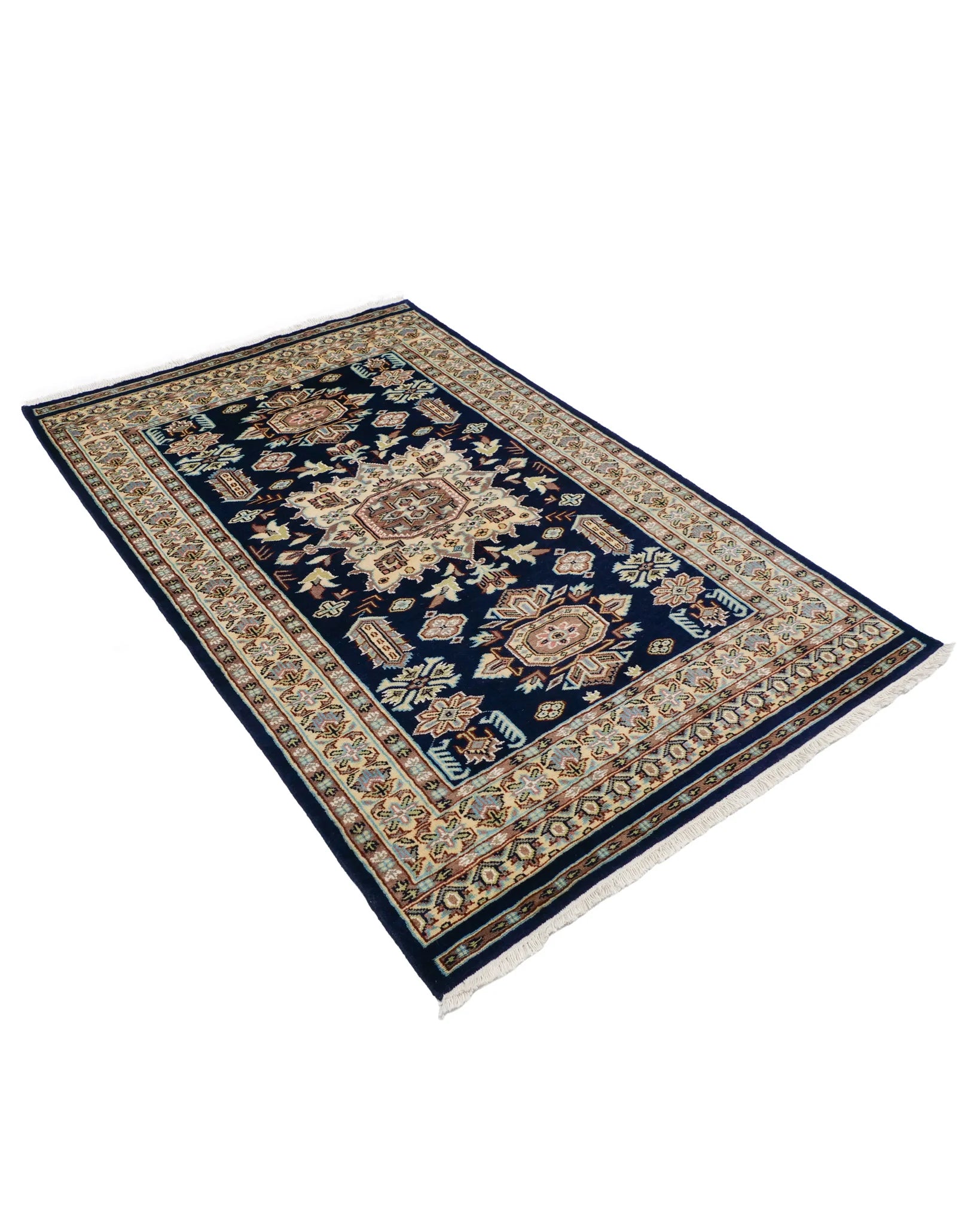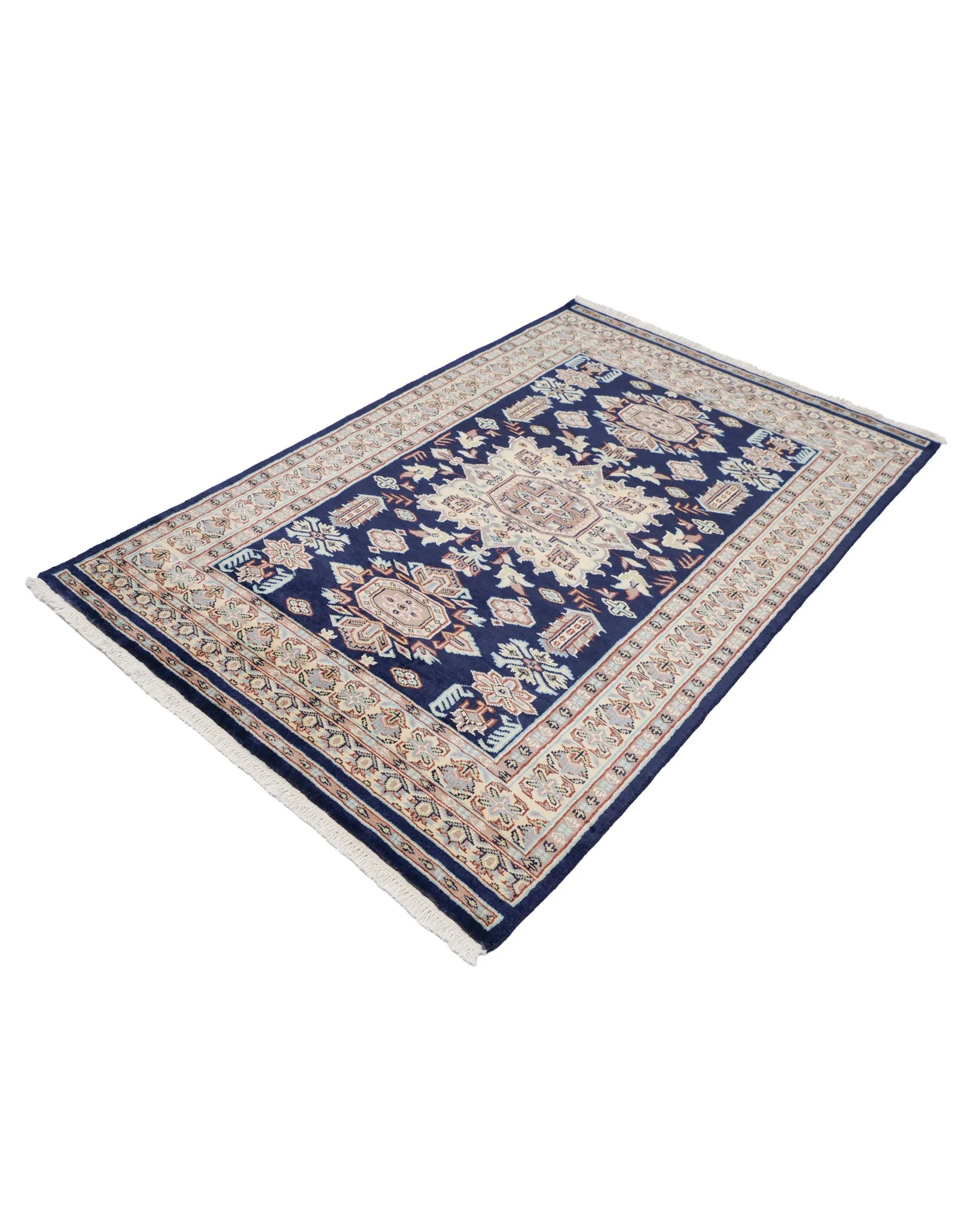 深みのあるネイビーブルーに花と幾何学模様が織り込まれたパキスタン絨毯