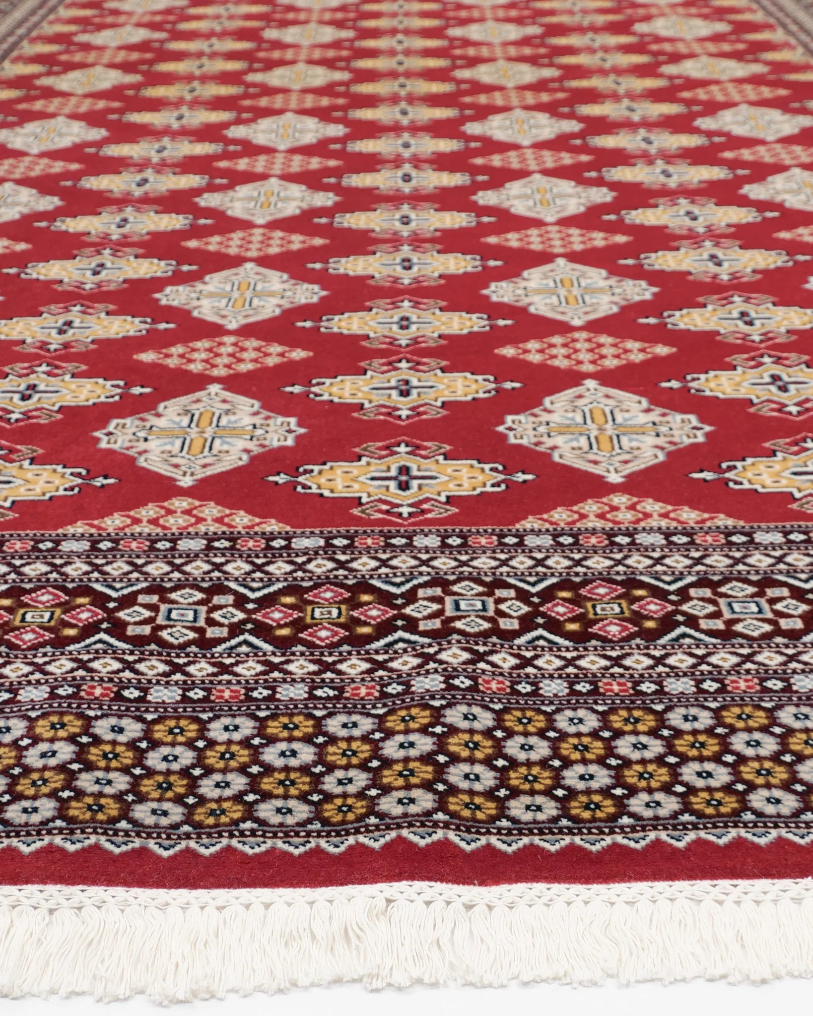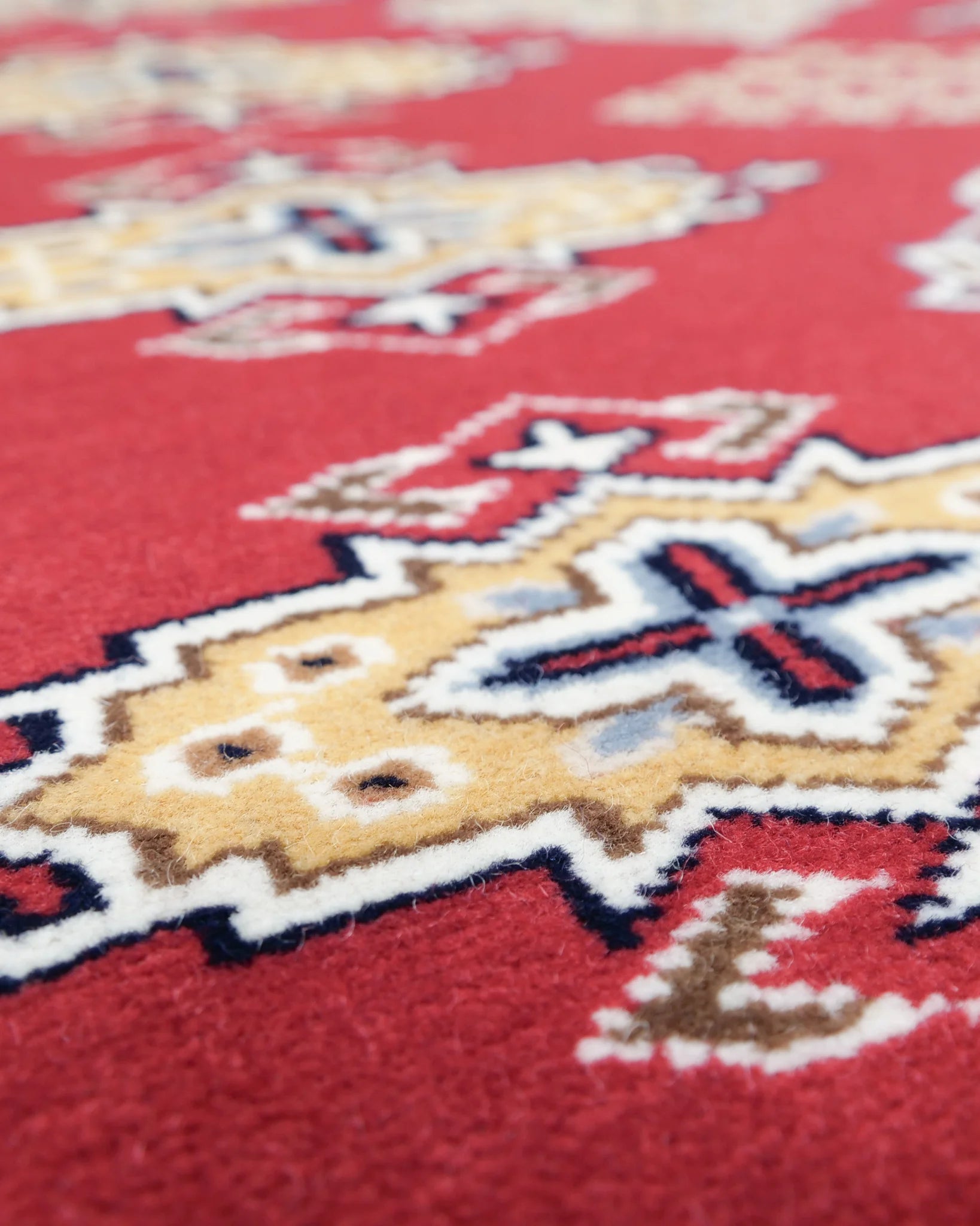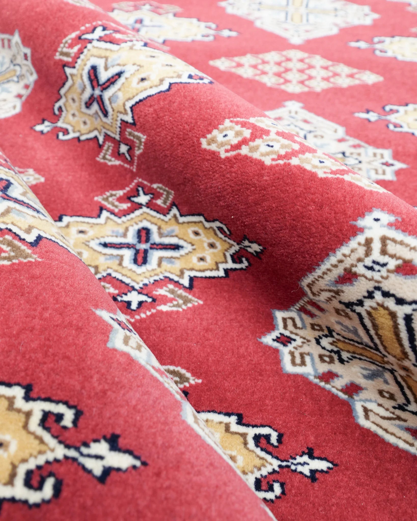 こちらの一枚は、赤を基調に、整然とした幾何学模様が精密に織り込まれています。