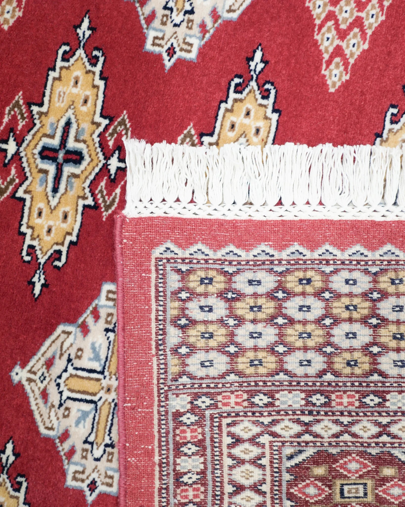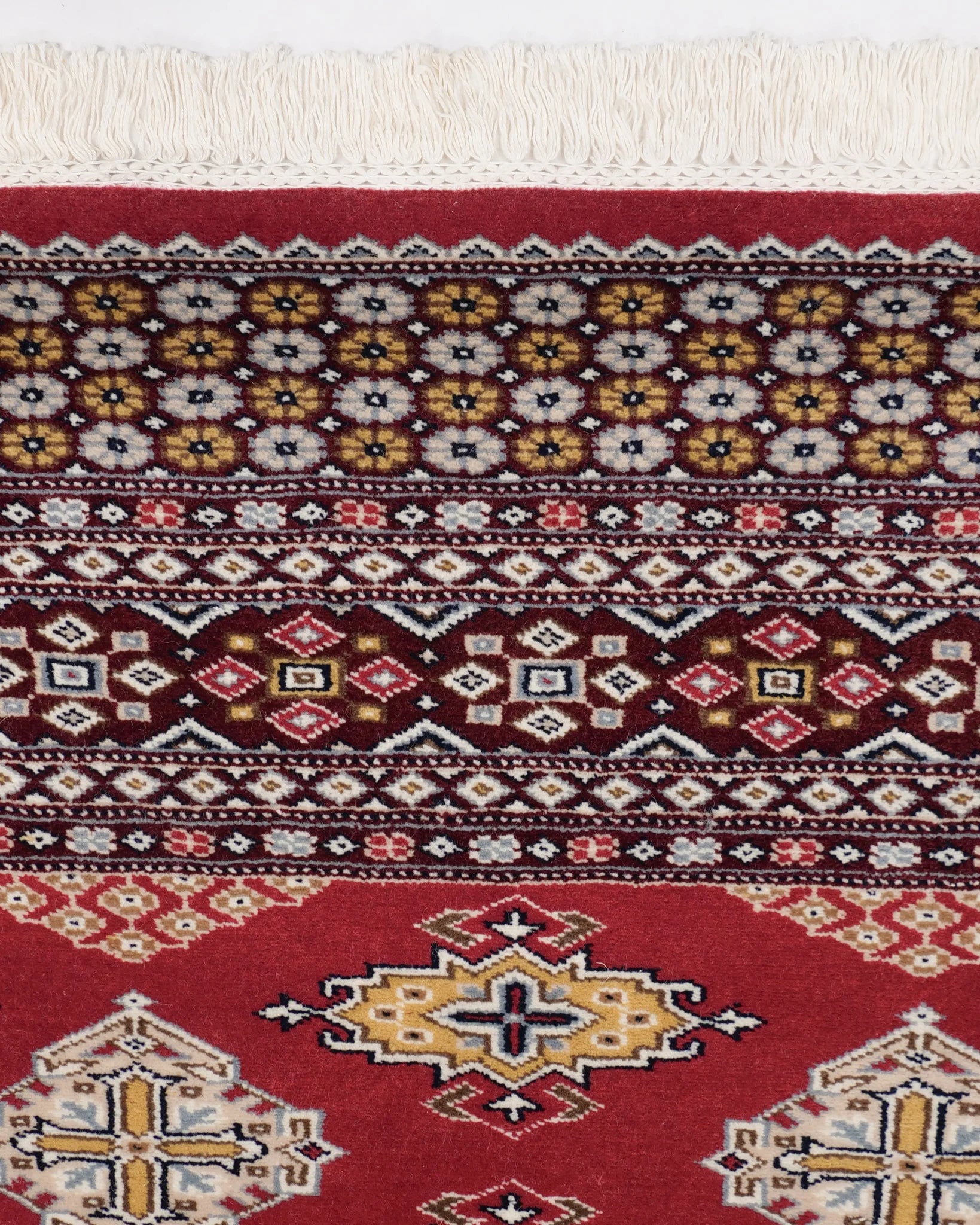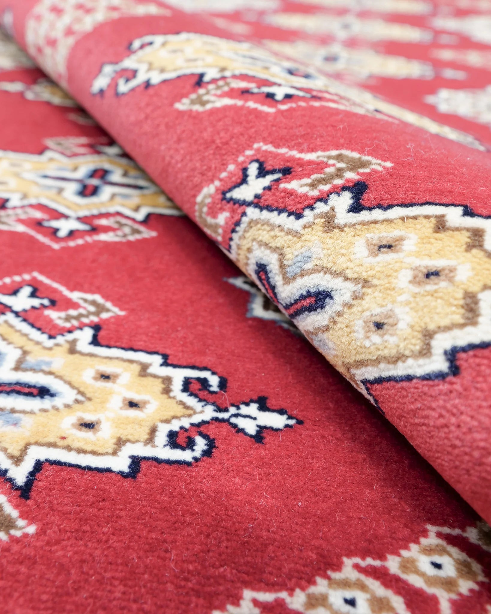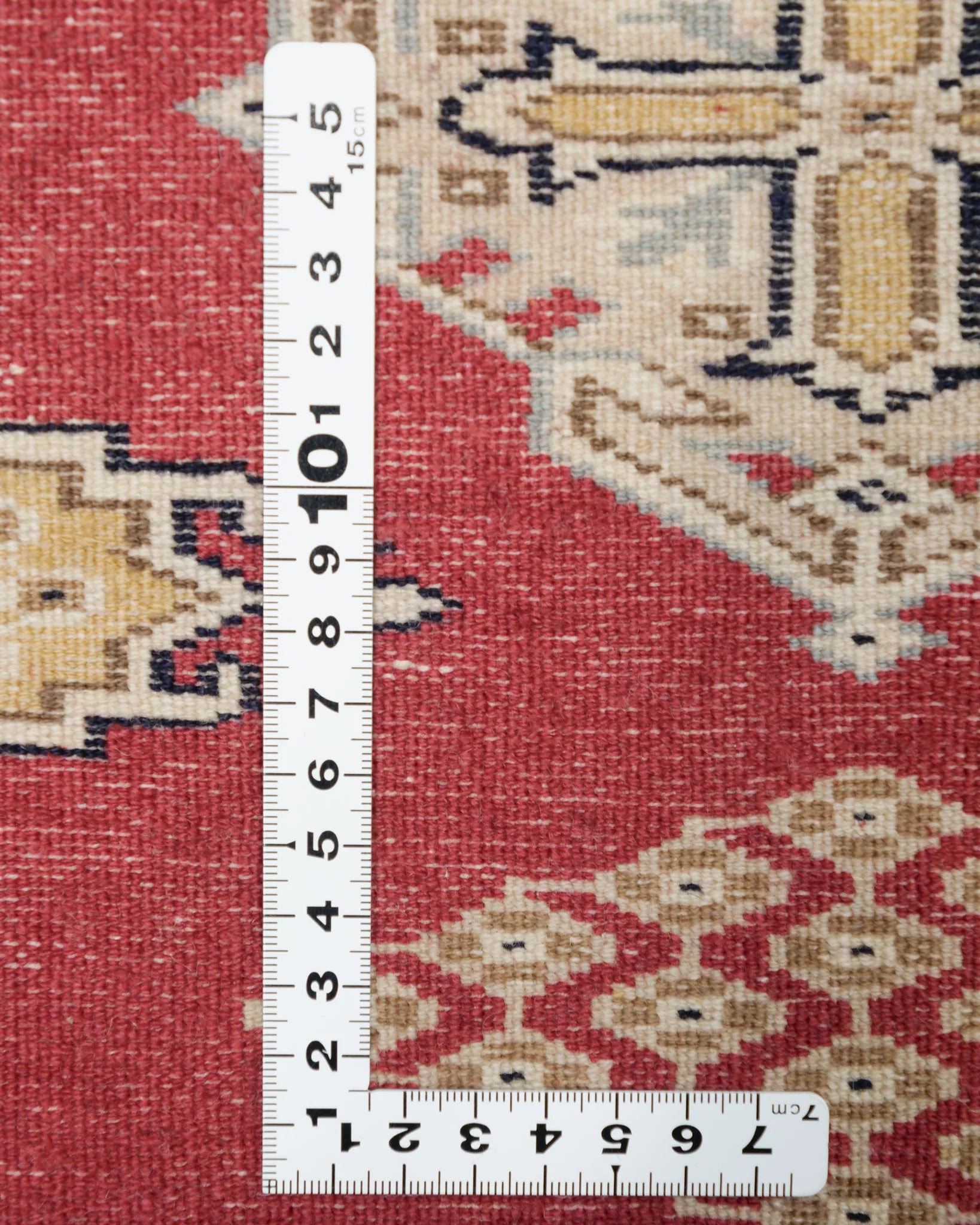 こちらの一枚は、赤を基調に、整然とした幾何学模様が精密に織り込まれています。