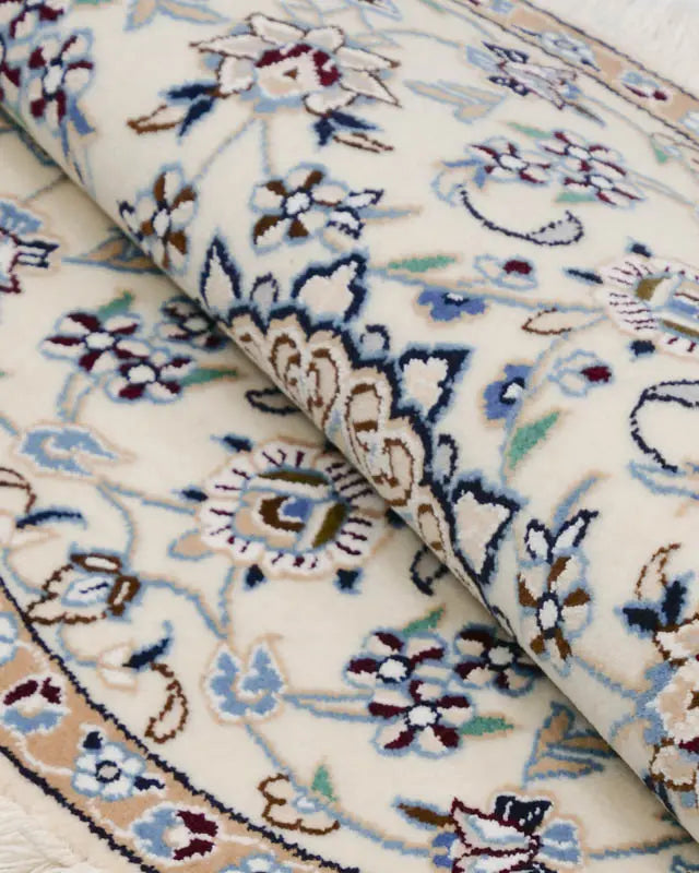 Nain Persian carpets are known for their use of soft wool and intricate patterns delicately outlined in silk, giving the designs a three-dimensional appearance. Featuring a calming color palette centered around beige, with accents of blue, green, and ivory, these carpets blend effortlessly with a wide range of interior styles.