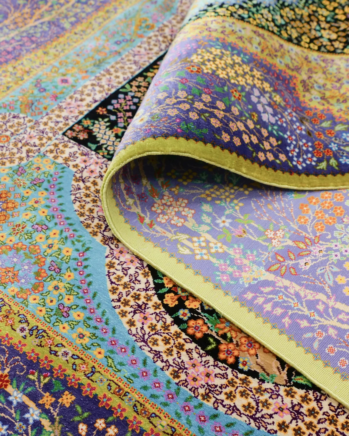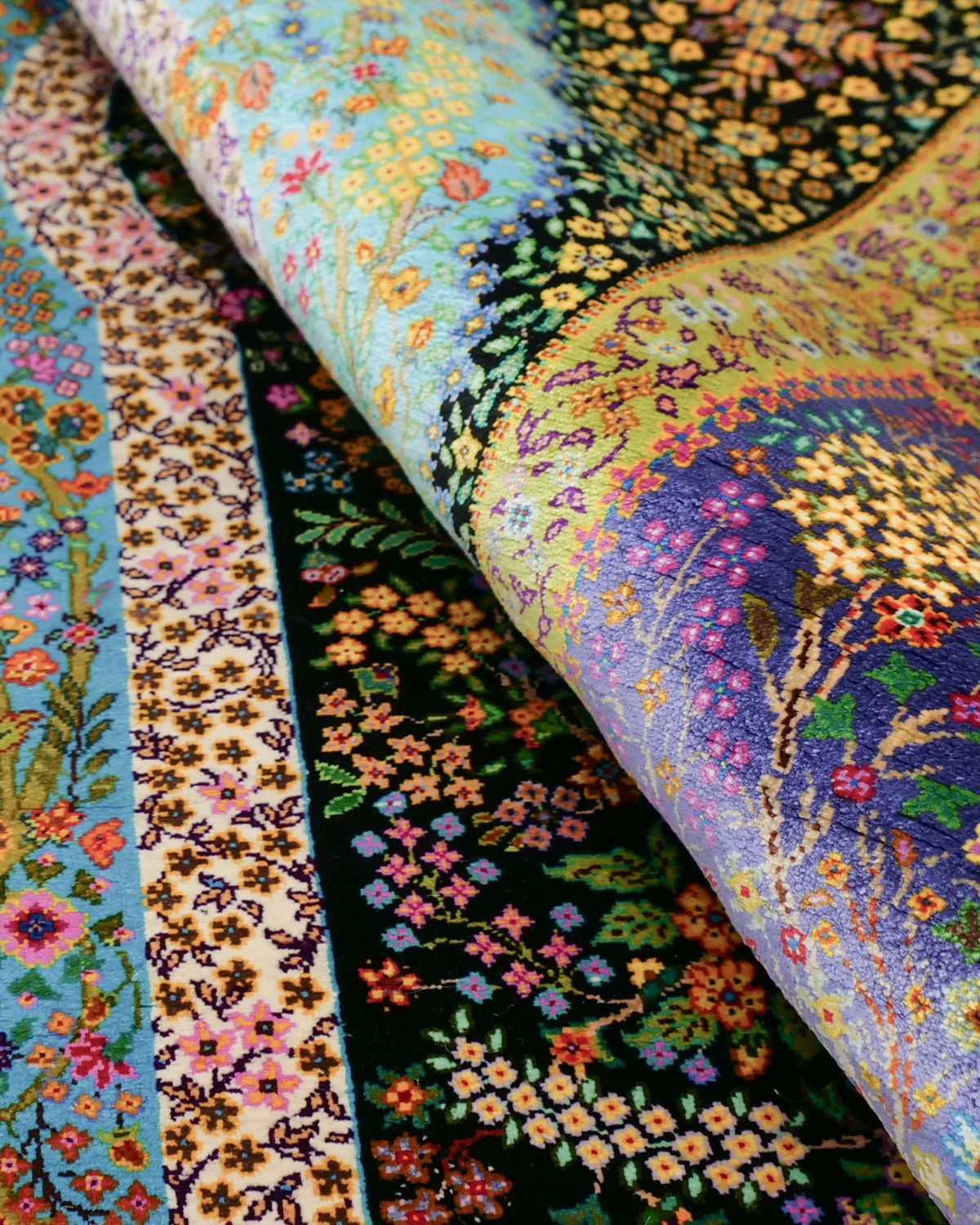 Qom is located about 100 kilometers south of Tehran, the capital of Persia (modern-day Iran). Renowned for their exceptional quality, Qom Persian rugs—woven from the finest silk—are considered among the most luxurious in the world. Each piece is meticulously handwoven by skilled artisans, making every design truly one of a kind. These silk rugs are known for their soft, smooth texture and a refined, elegant sheen that enhances the beauty of their intricate patterns and rich colors.