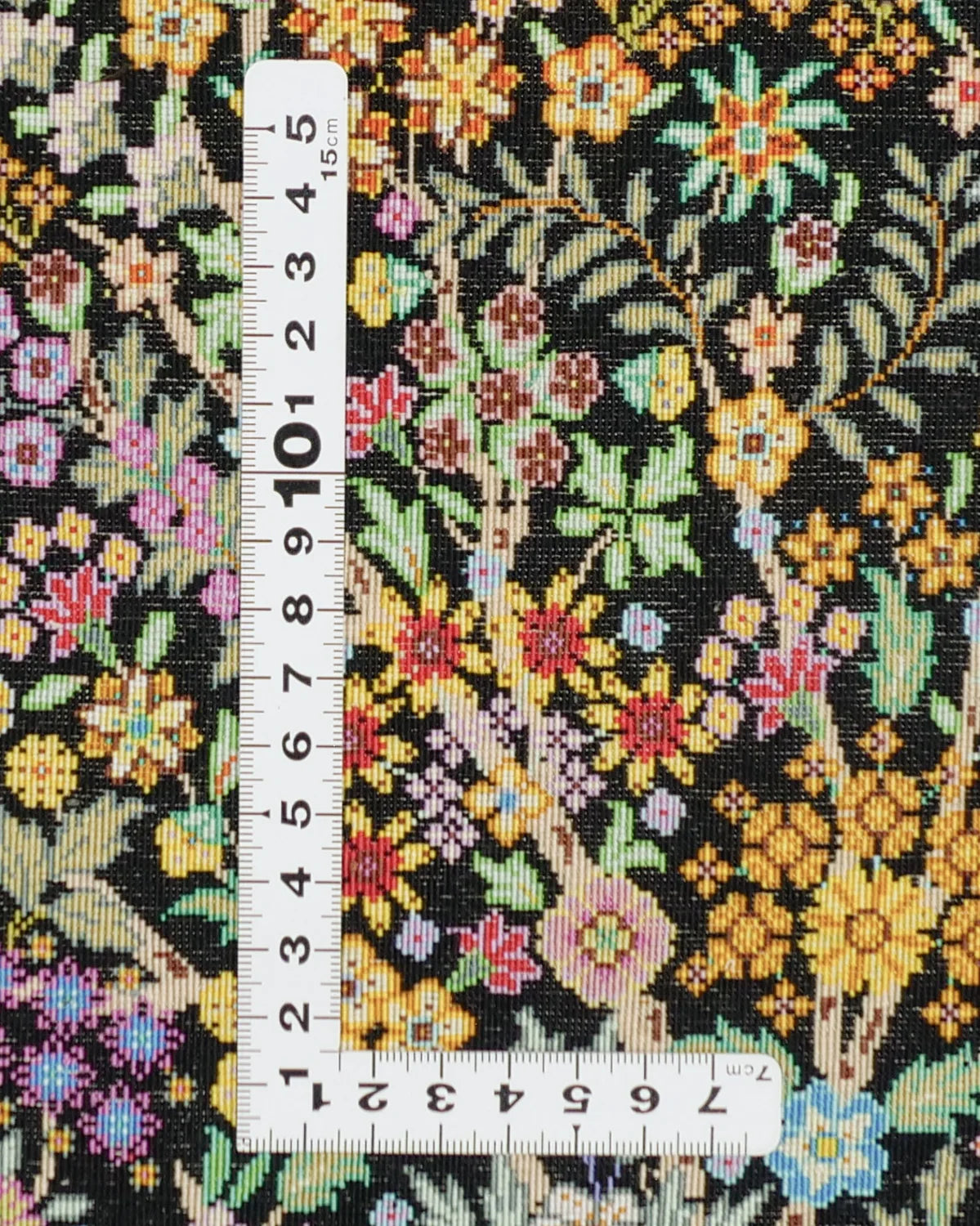 無数の花々が咲き誇るように配された模様は、色数の多さとその細密な表現が際立ちます。