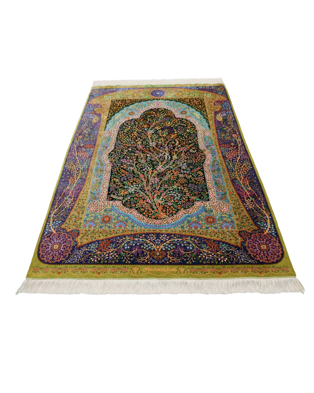 クム産シルクのペルシャ絨毯 エサギ工房 黄緑の生命の樹デザイン