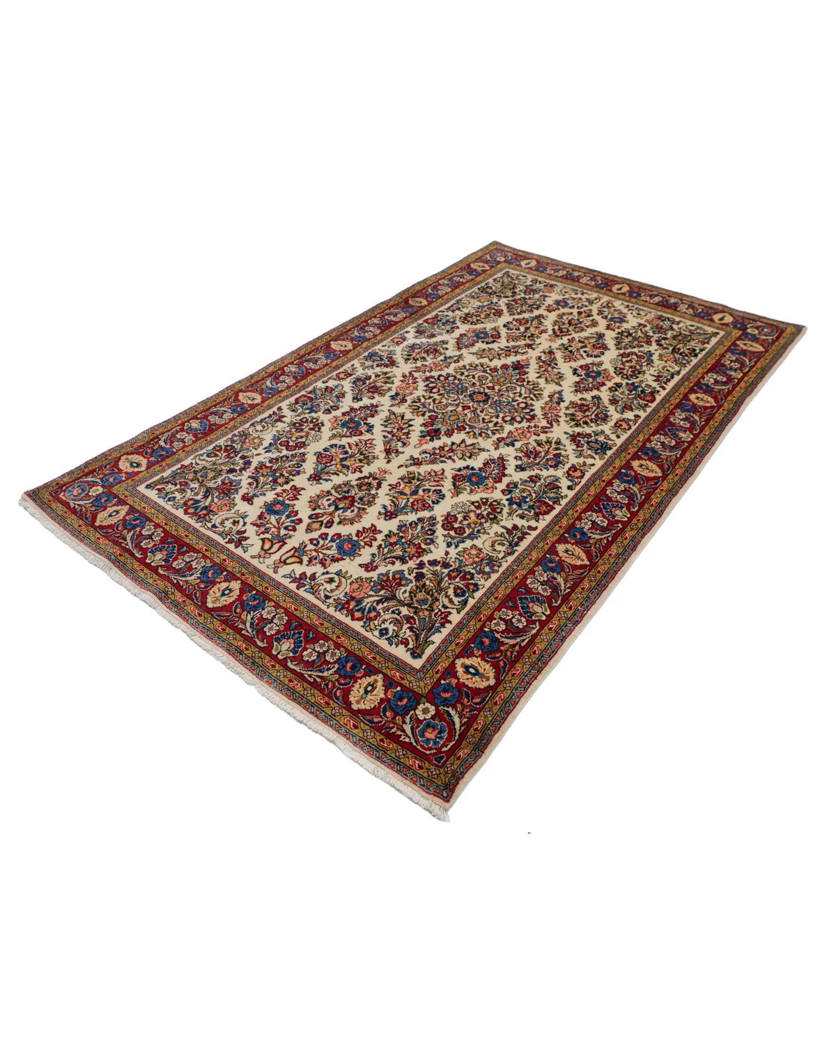 サルーク産の手織りペルシャ絨毯 生成りの地に赤と青の花束文様が散りばめられた