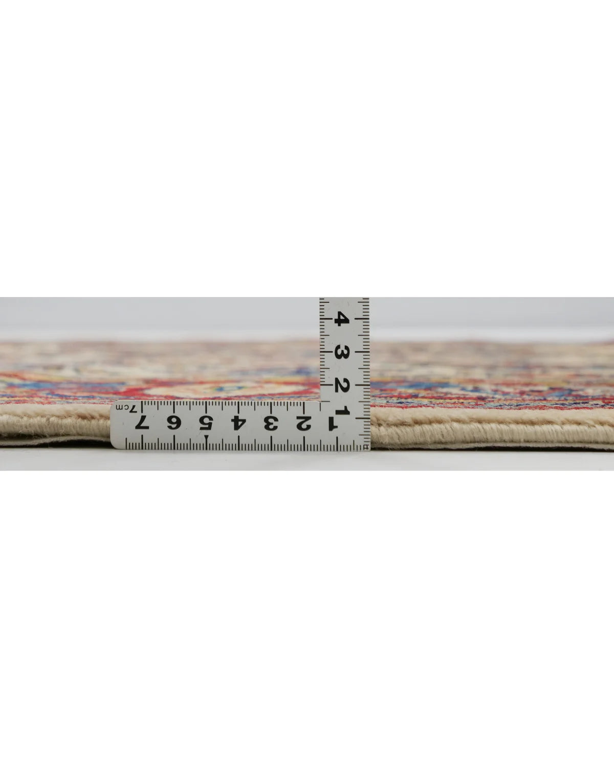 サルーク産ペルシャ絨毯 赤いボーダーと生成りの地に咲く多彩な花束模様が映える一枚の厚みがわかる写真