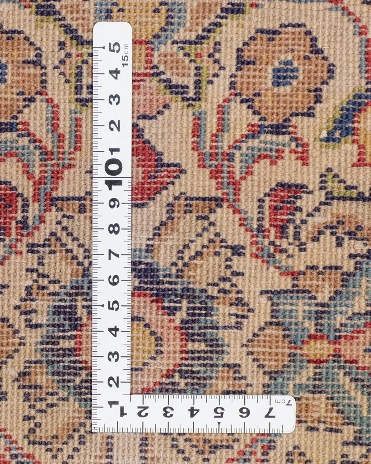 サルーク産の手織りペルシャ絨毯 中央メダリオンから放射状に広がる花束デザインの織り密度が分かる写真