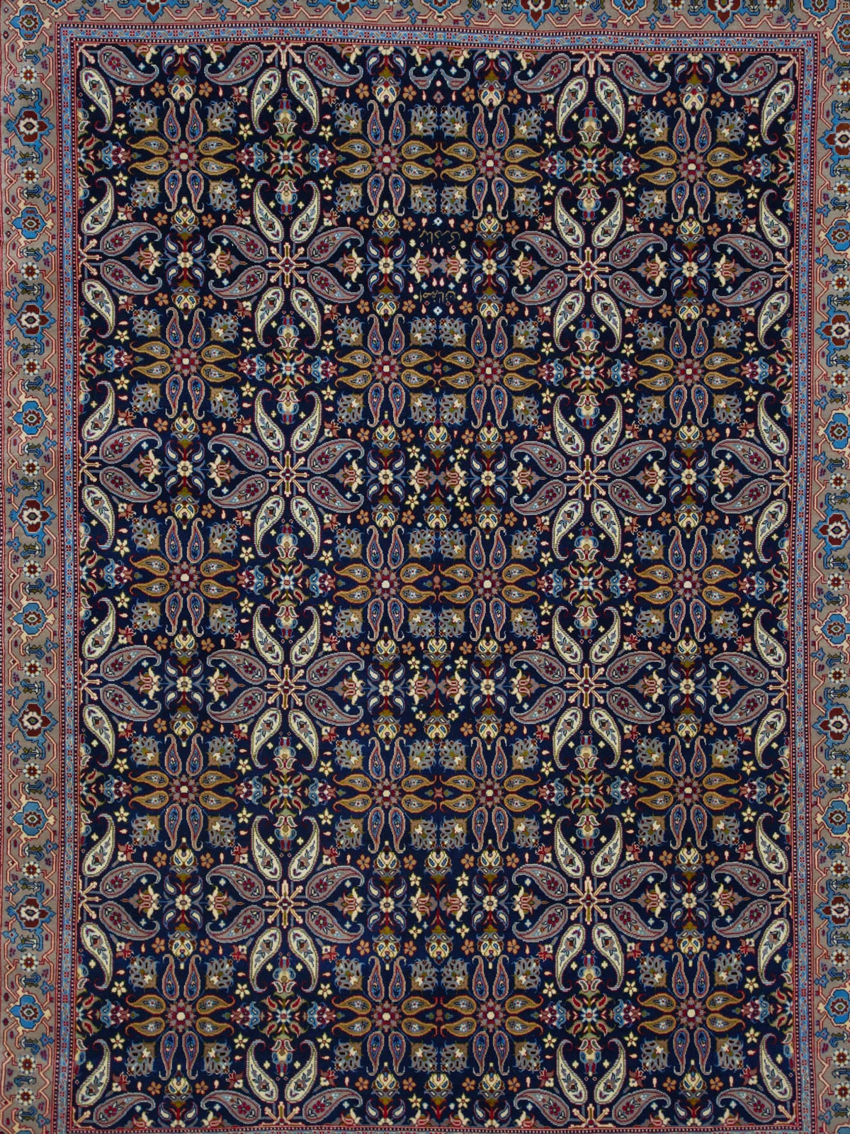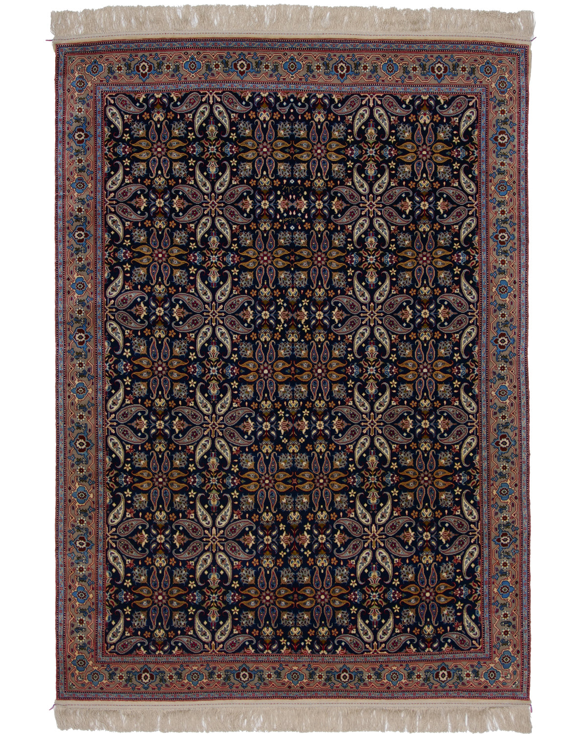 8つのペイズリー(ボテ)を花のように配した「ハシュトゴル(八つの花)」の構図。濃紺のフィールドに、細やかな草花文様とボテ柄が端正に並ぶ一枚。