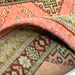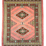 This carpet is a fine quality carpet woven in Lahore , Pakistan. It has a retro pink base.