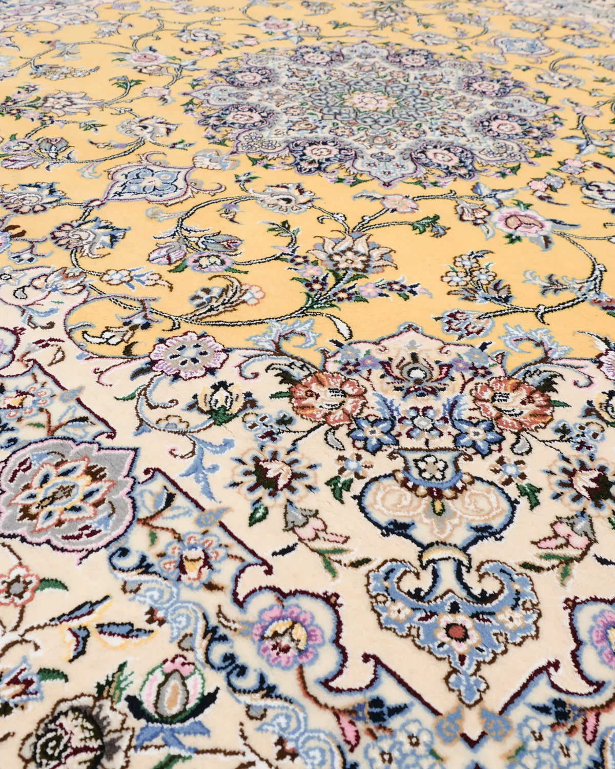 アイボリーとサフランイエローを基調としたナイン産手織りペルシャ絨毯