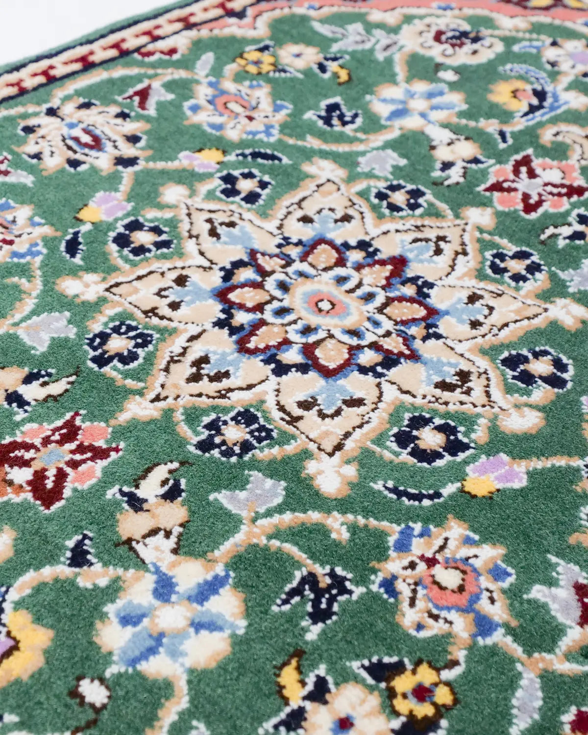 This is a handwoven Persian rug, meticulously crafted by skilled artisans in the Nain region of Iran.