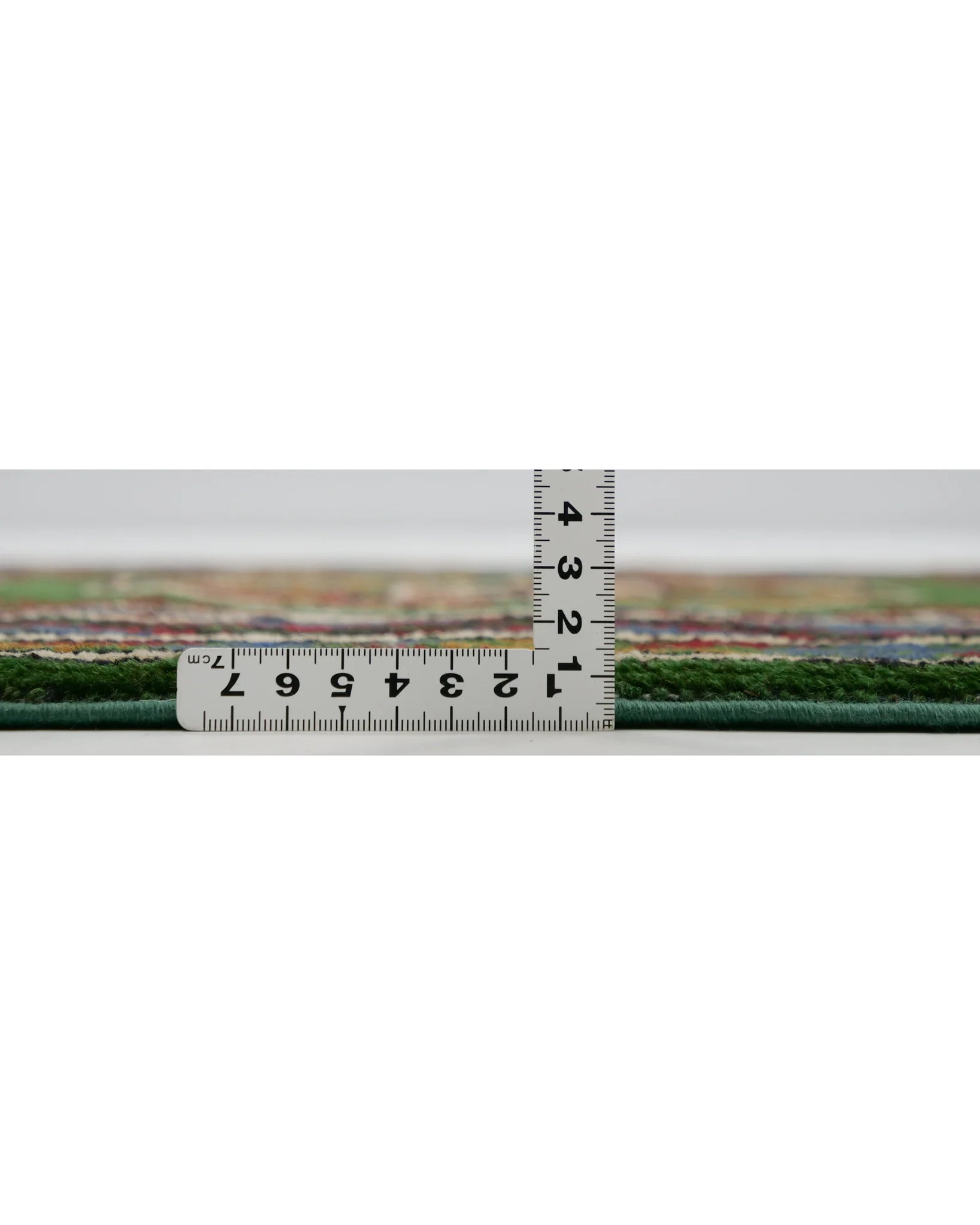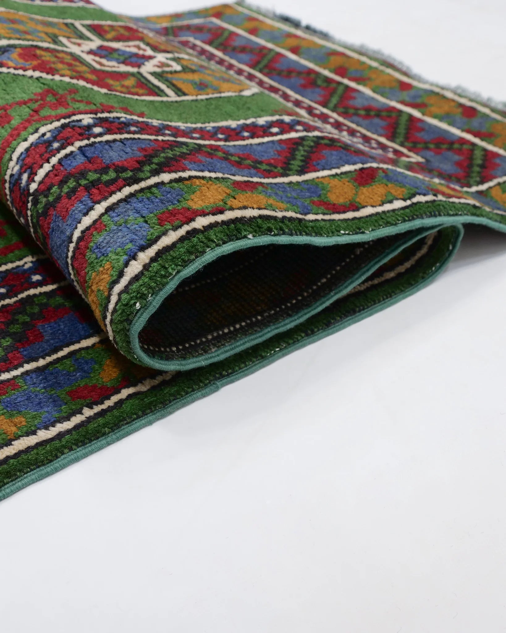 The green base is balanced with red, mustard yellow and muted blue tones to create a modern and warm atmosphere.