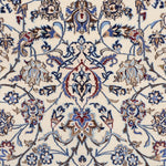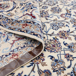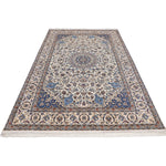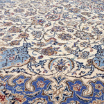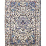 Nain Persian carpets are known for their use of soft wool and intricate patterns delicately outlined in silk, giving the designs a three-dimensional appearance. Featuring a calming color palette centered around beige, with accents of blue, green, and ivory, these carpets blend effortlessly with a wide range of interior styles.