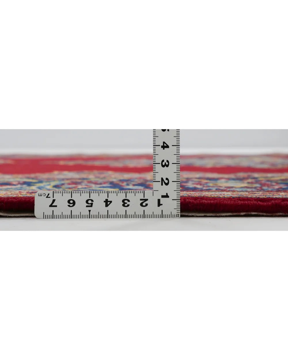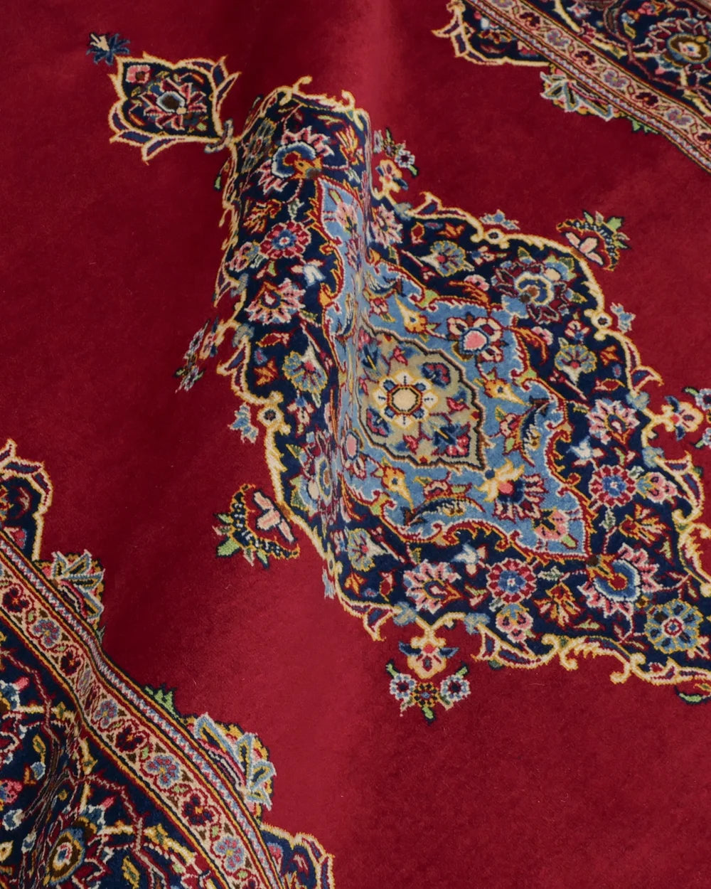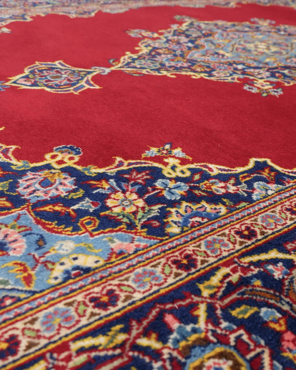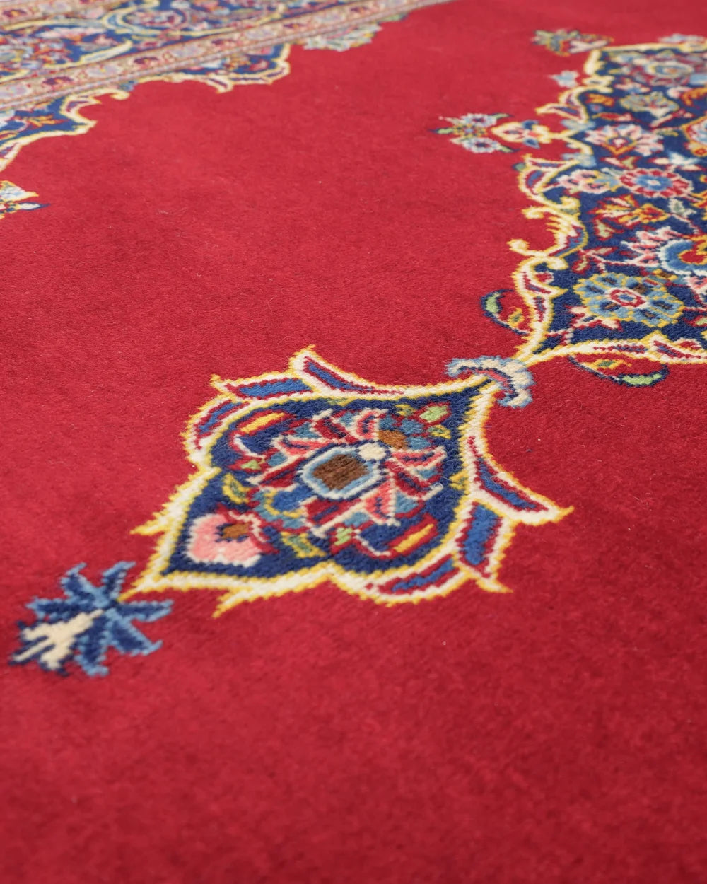 The field (ground) is woven in a deep red color, making the central medallion stand out even more. The four corners feature a "medallion & corner" design, in which the medallion is divided into four parts and rotated.