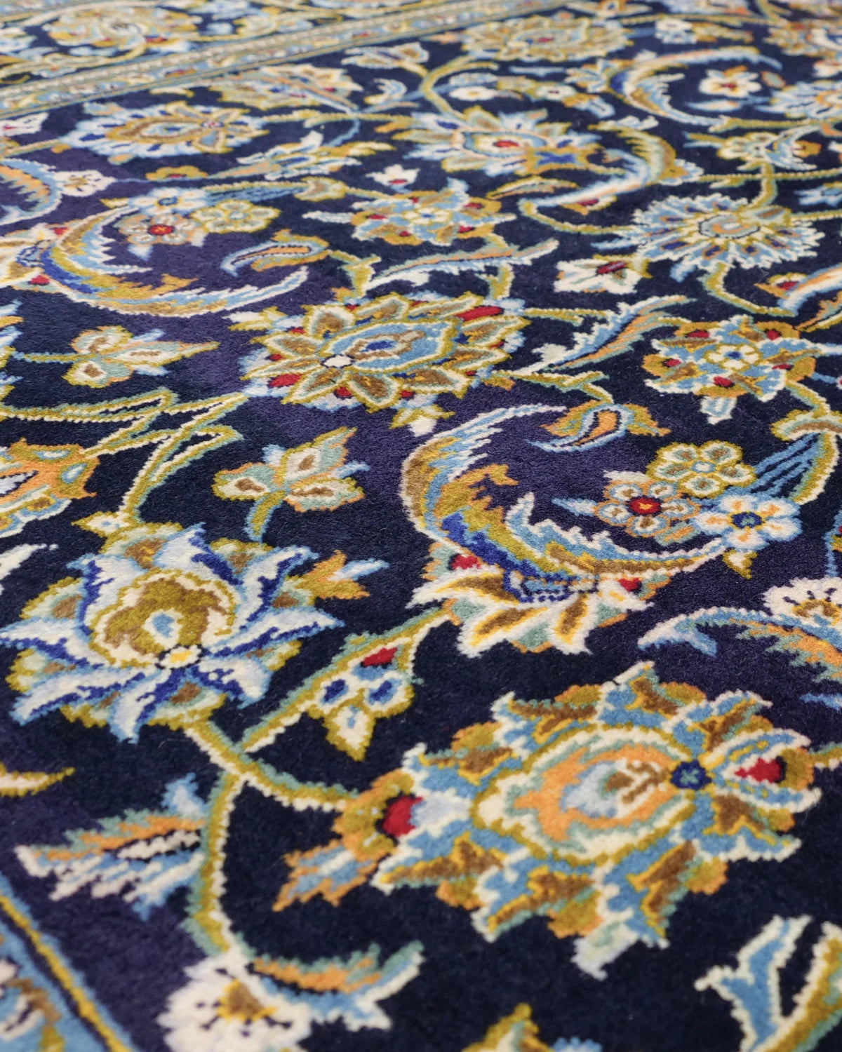 濃紺の地に広がるカシャーン産 ペルシャ絨毯 アフシャーンデザイン