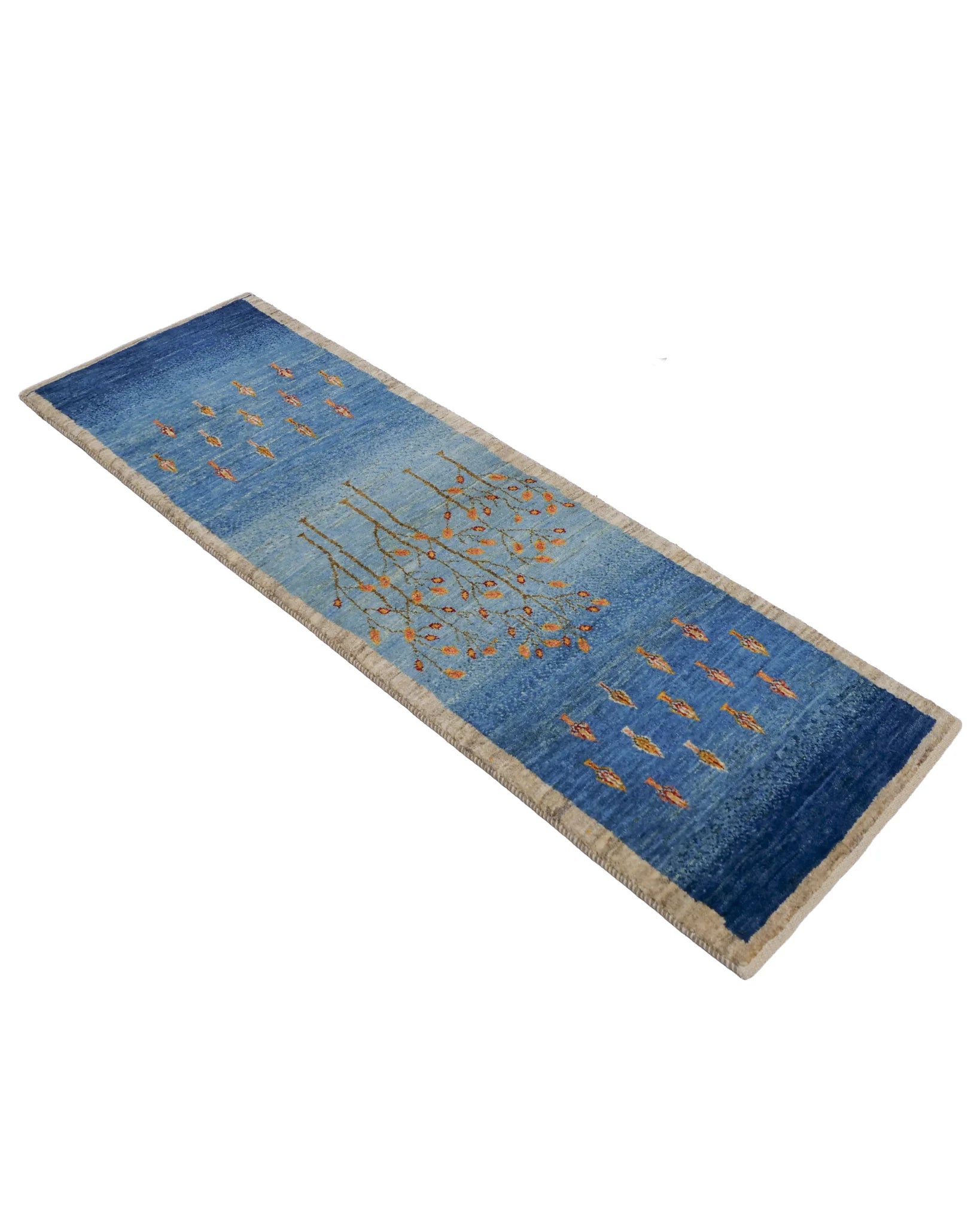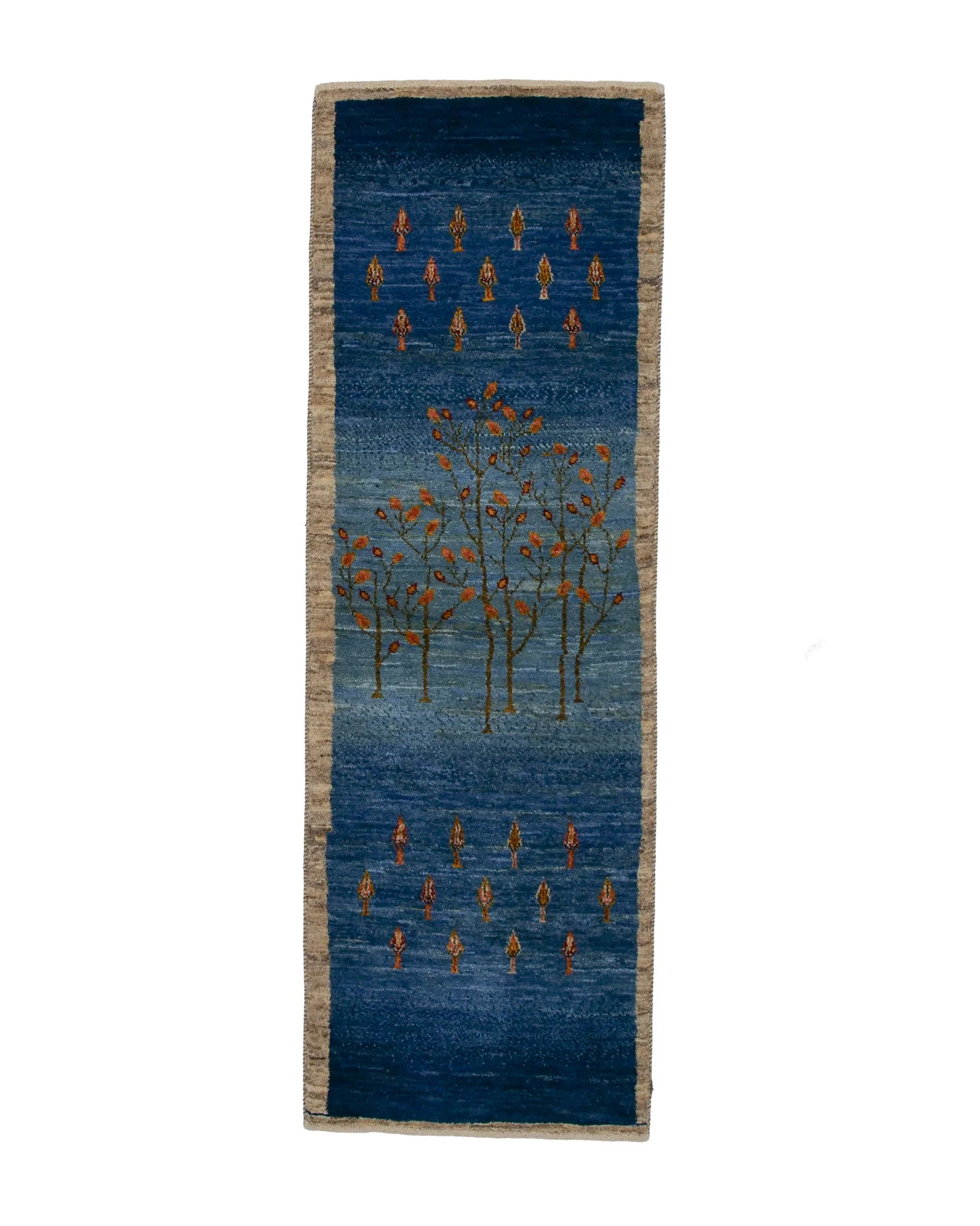 シーラーズ産ファインギャッベ。最高級ウールで細かく織られ、藍色の背景に花咲く木と糸杉文様が描かれたランナーサイズの手織り絨毯(50×150cm)