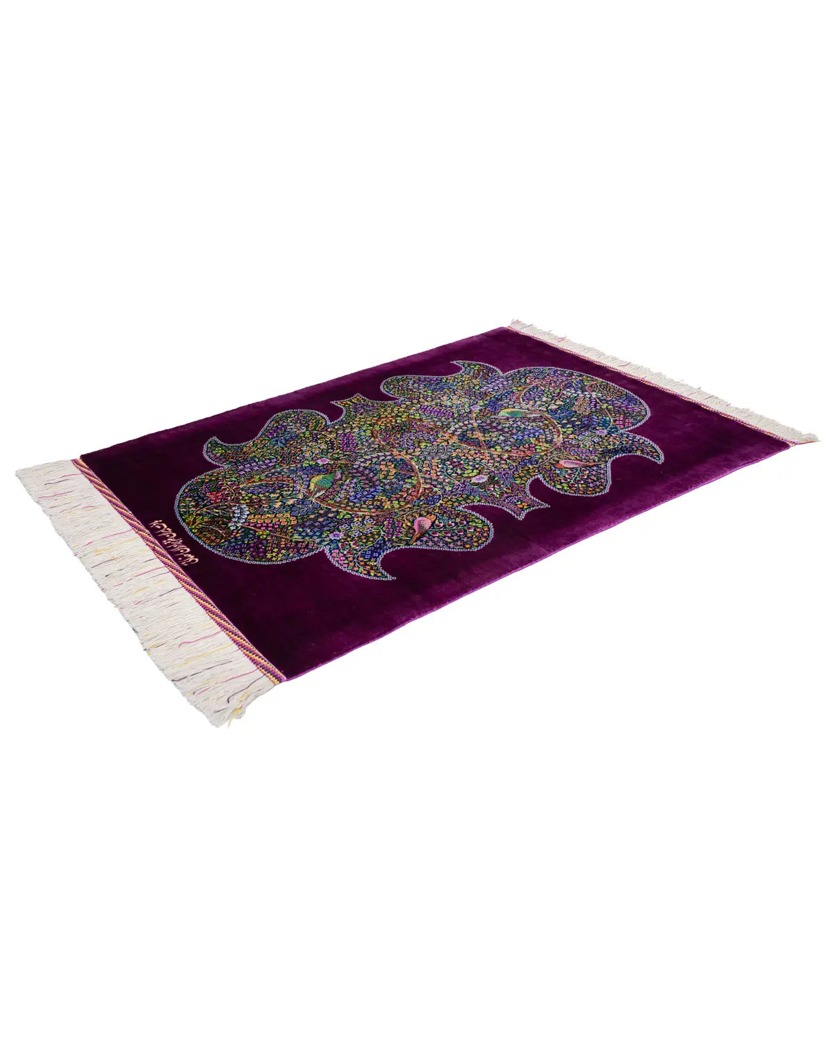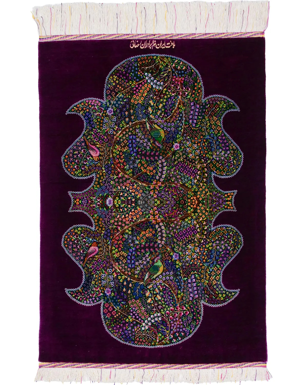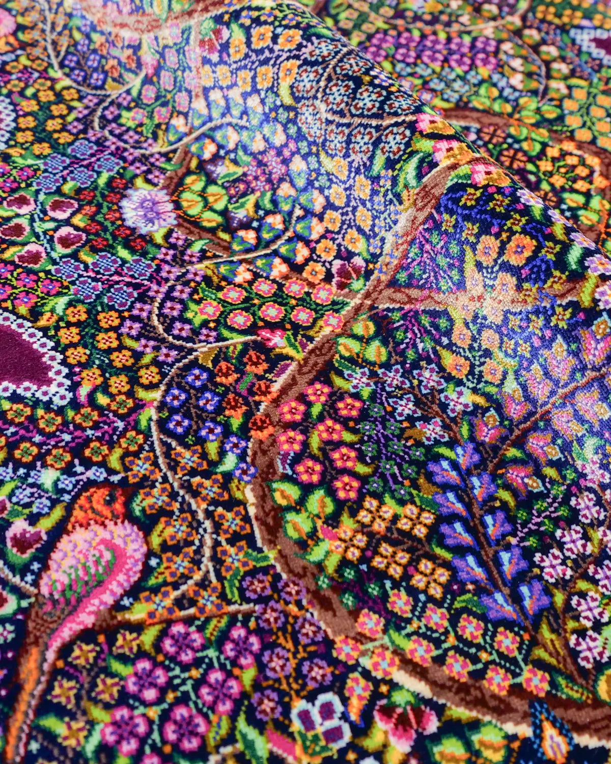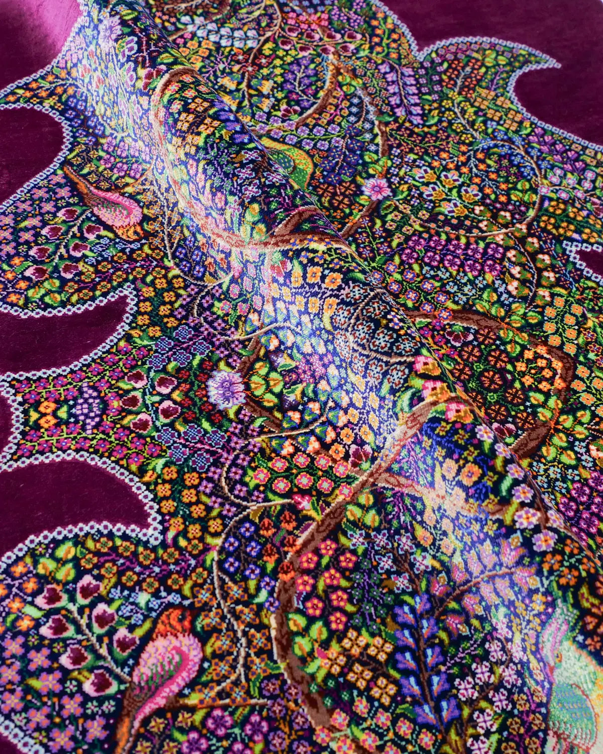 深みのある紫の外枠が全体を静かに引き締め、内側に広がる花と鳥が息づく楽園の情景を細部まで精緻に織り上げています。