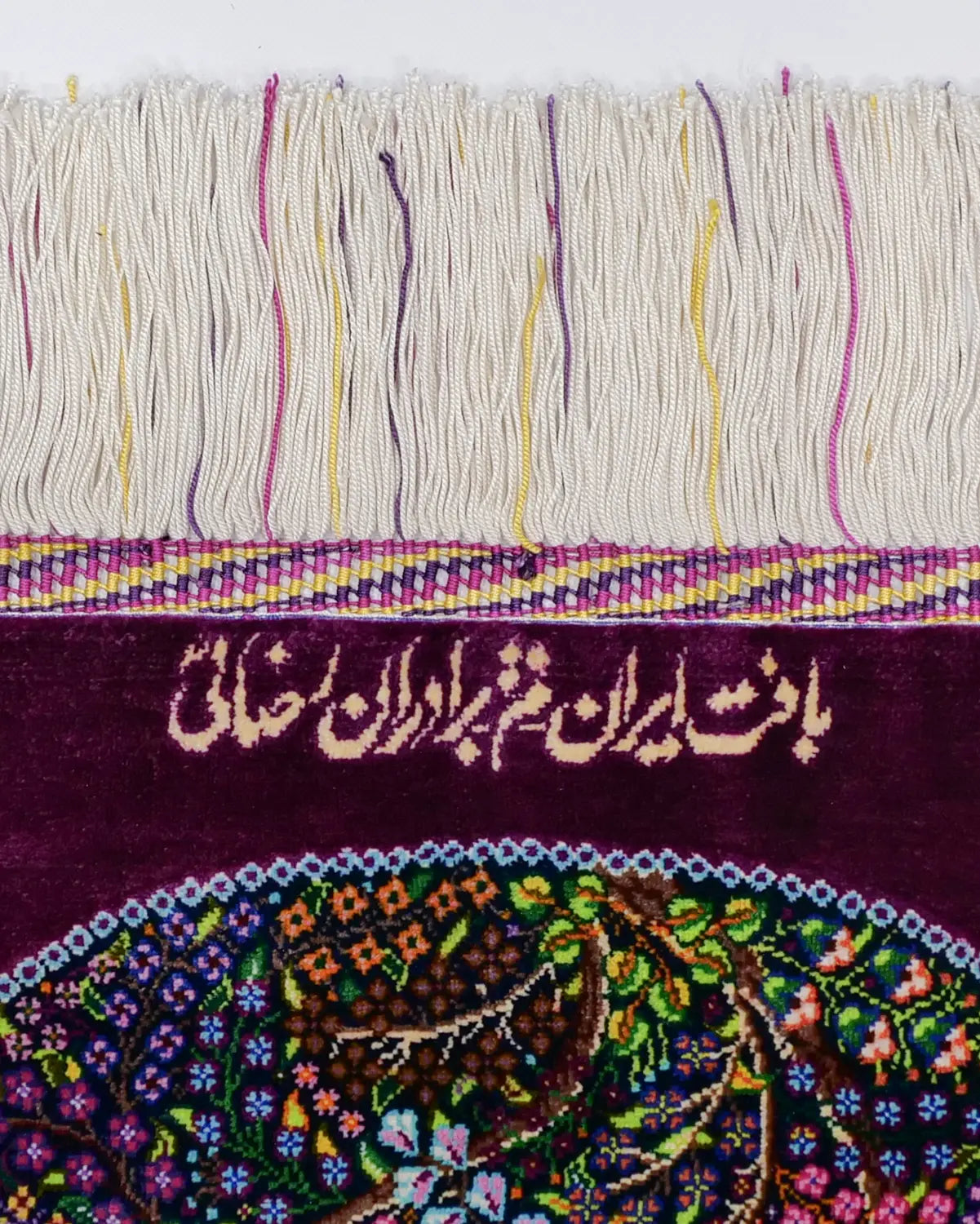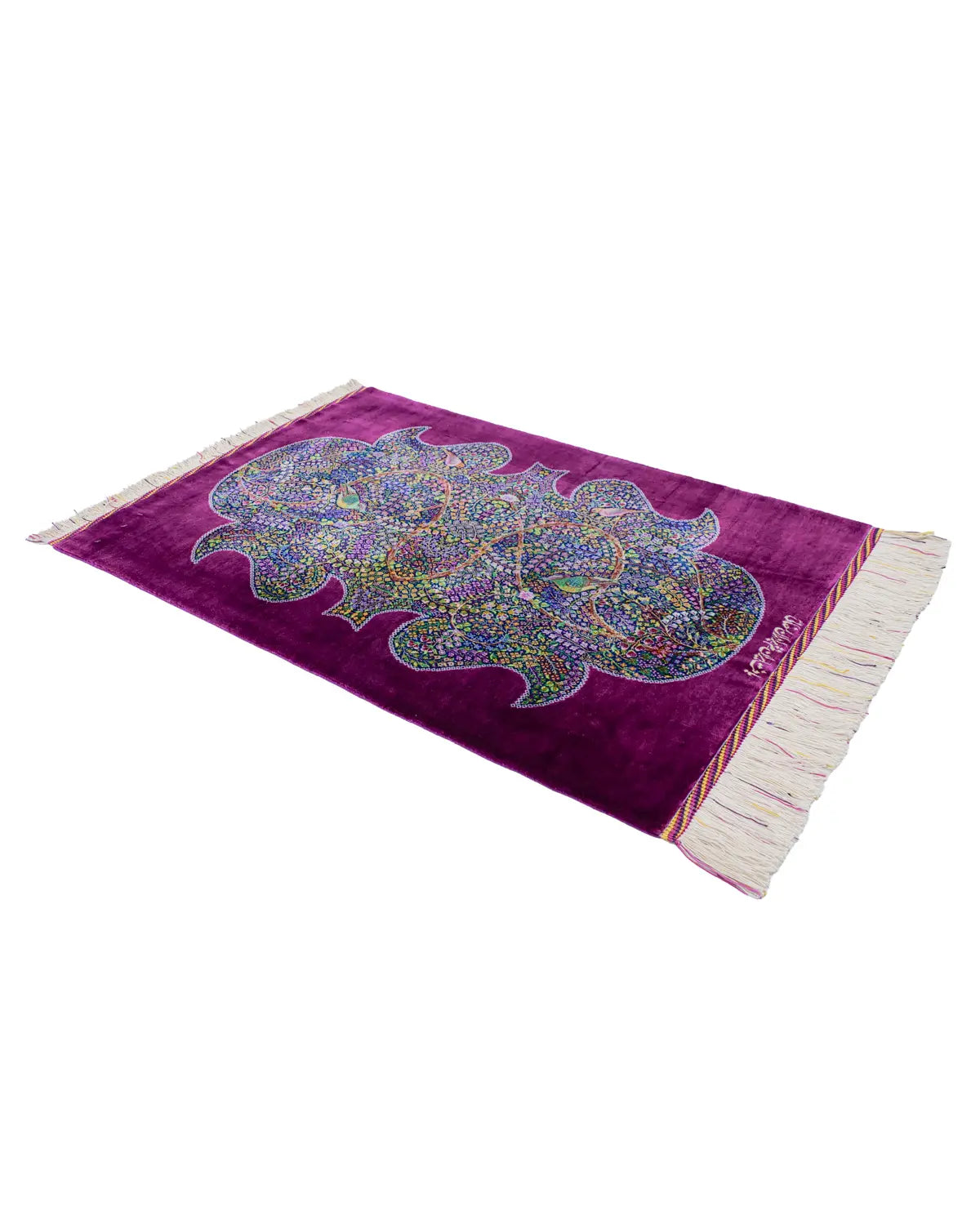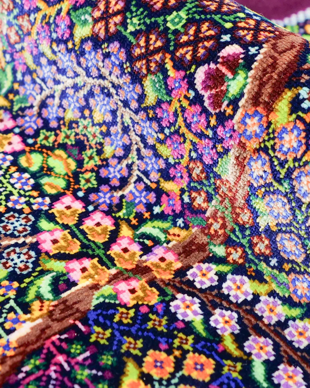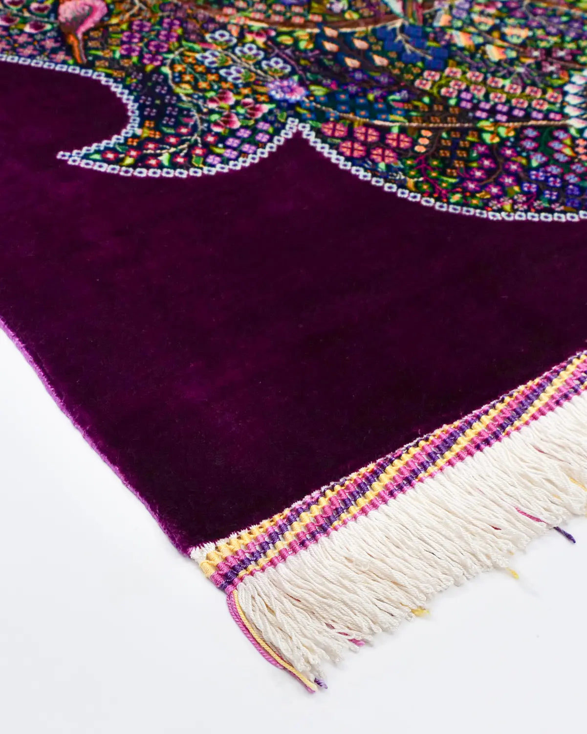 深みのある紫の外枠が全体を静かに引き締め、内側に広がる花と鳥が息づく楽園の情景を細部まで精緻に織り上げています。