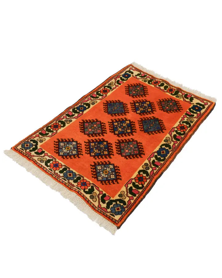 밝은 오렌지색이 눈길을 끄는, 시라즈산의 페르시아 양탄자 야라메입니다.