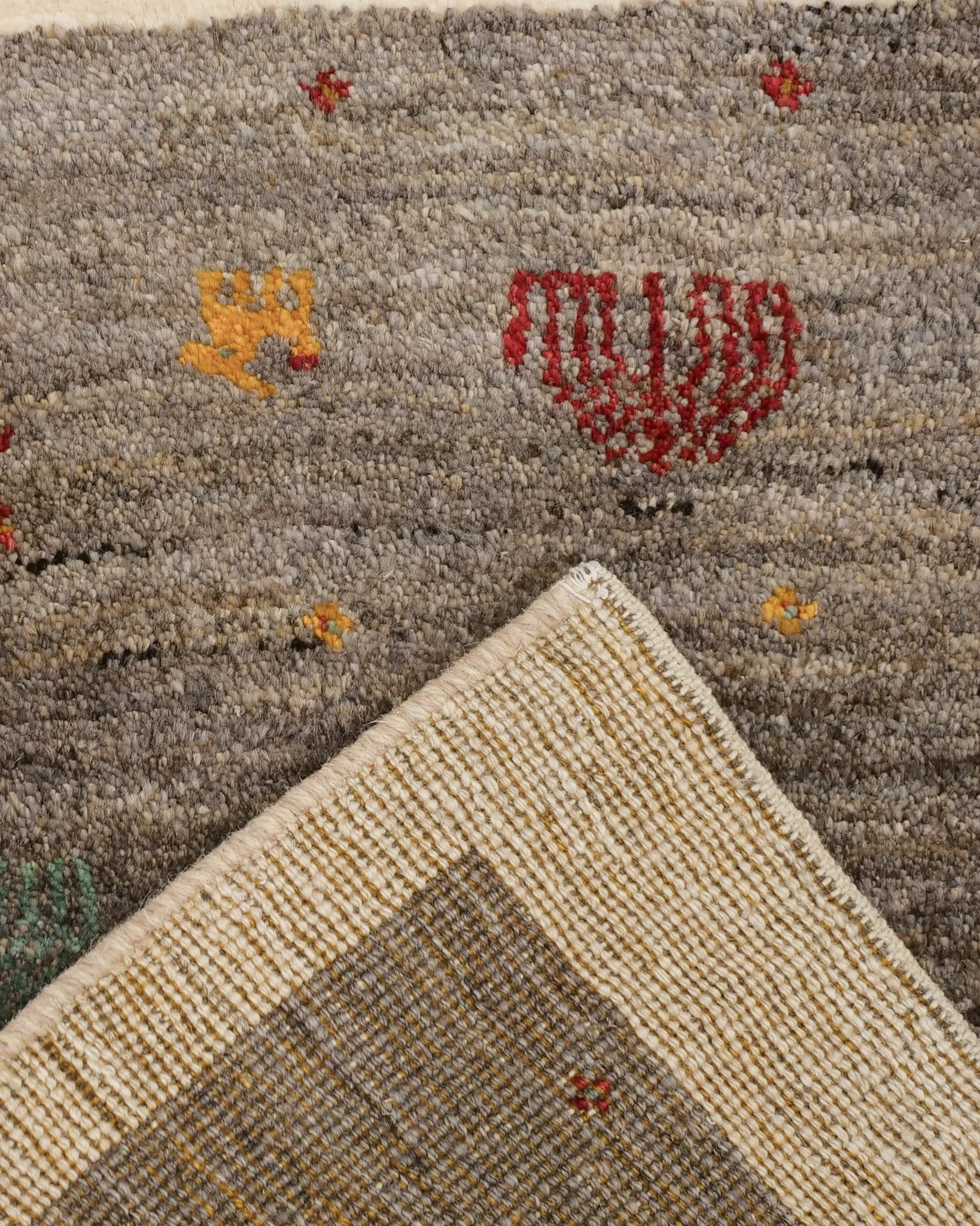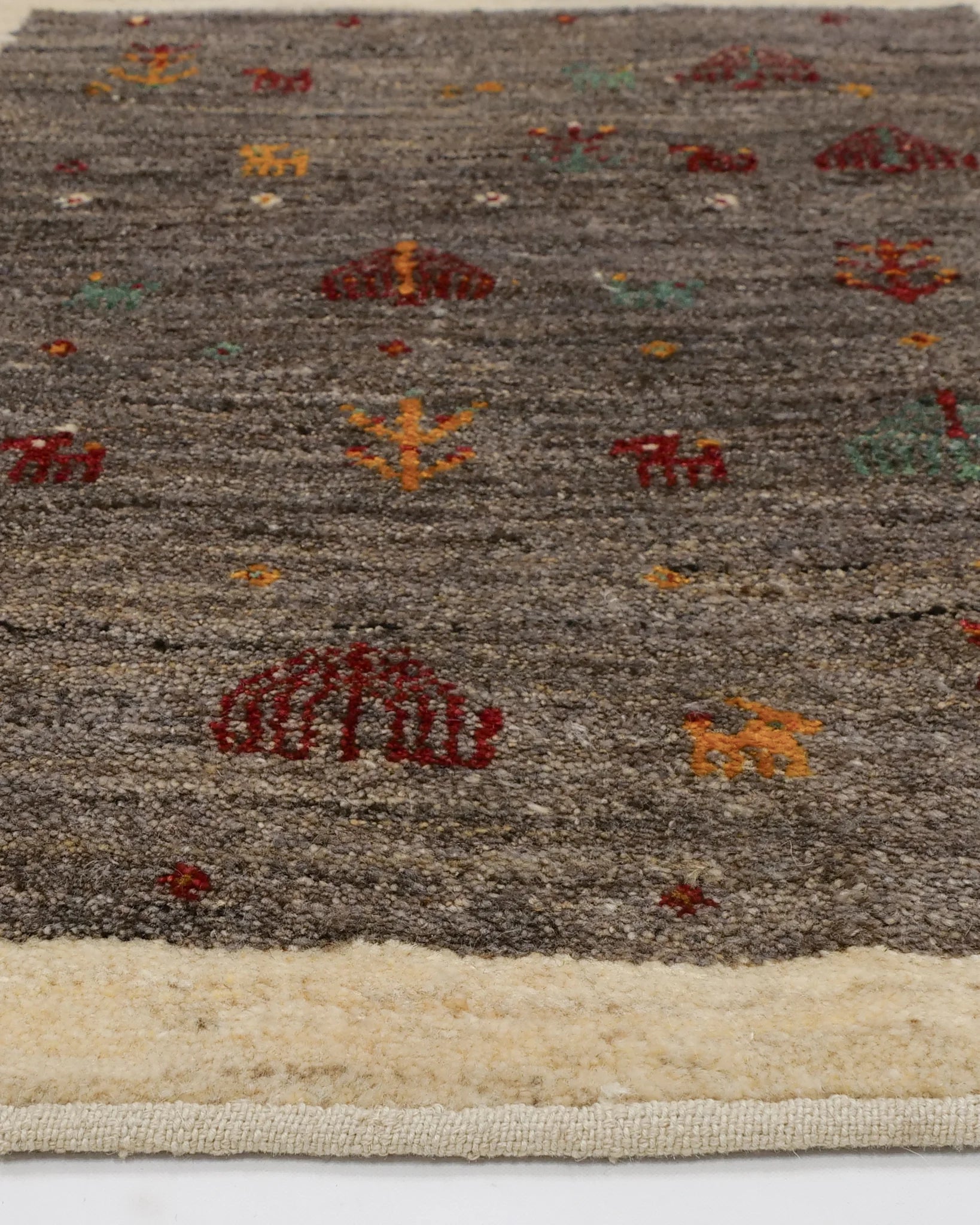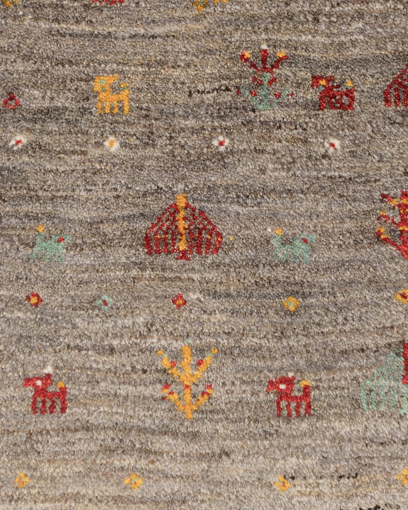 小さな木や花、動物、鳥など、愛らしい民族モチーフが自由にちりばめられ、遊牧民の日々の情景がそのまま織り込まれたような素朴で温かな味わいが魅力です。
