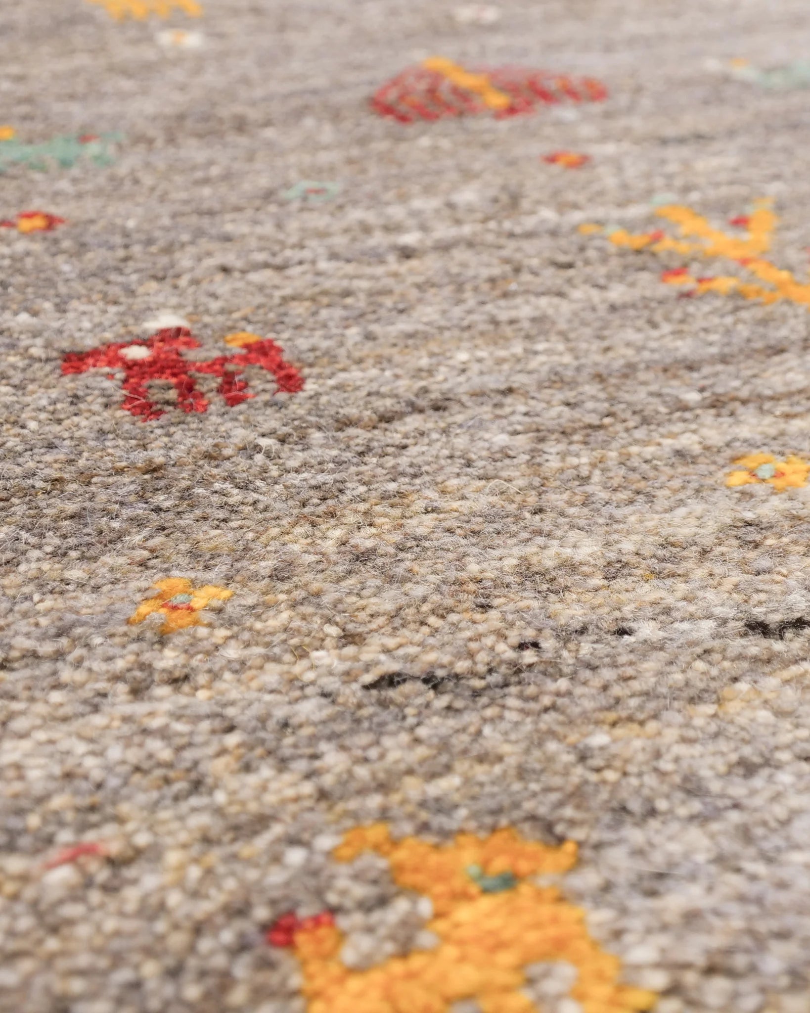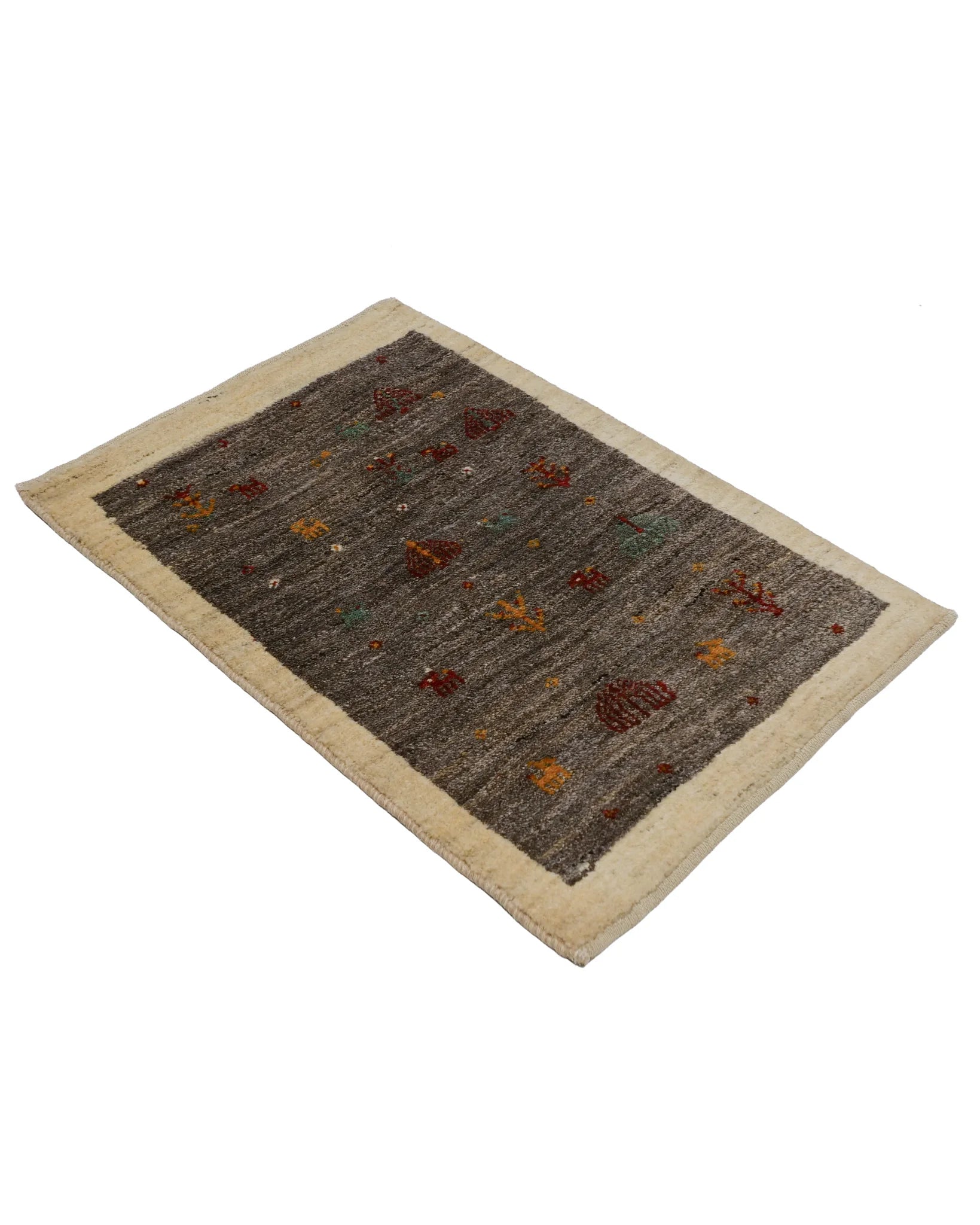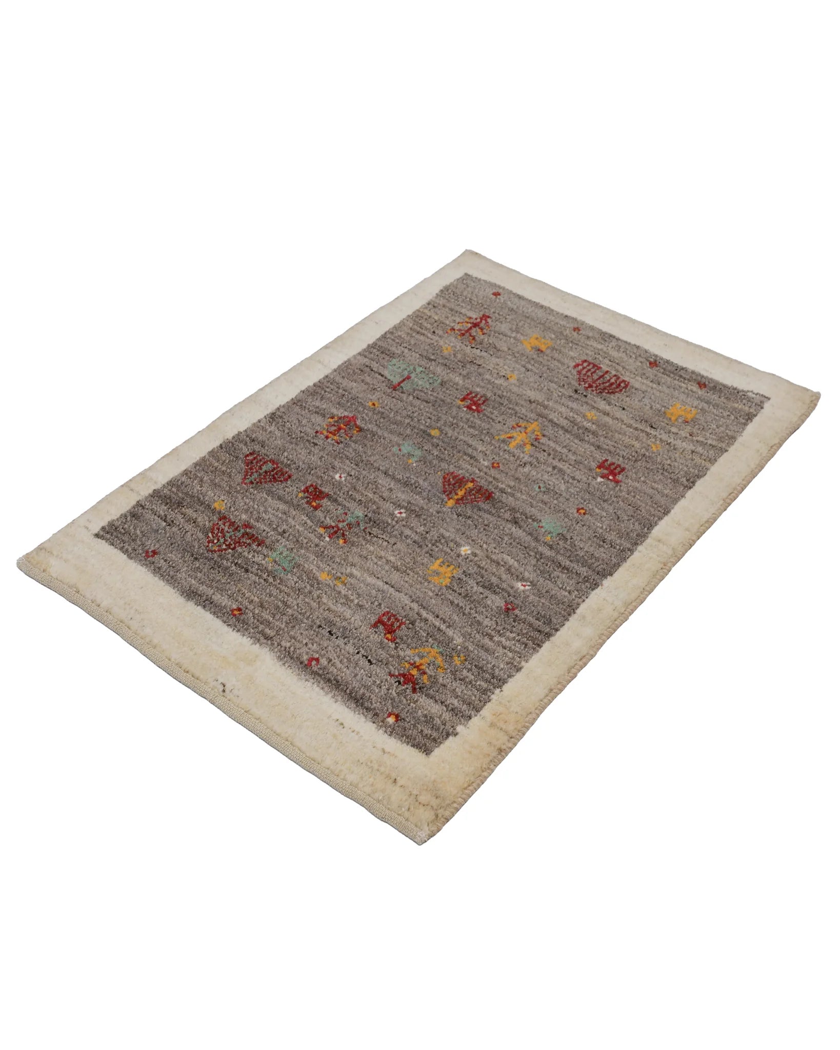 小さな木や花、動物、鳥など、愛らしい民族モチーフが自由にちりばめられ、遊牧民の日々の情景がそのまま織り込まれたような素朴で温かな味わいが魅力です。