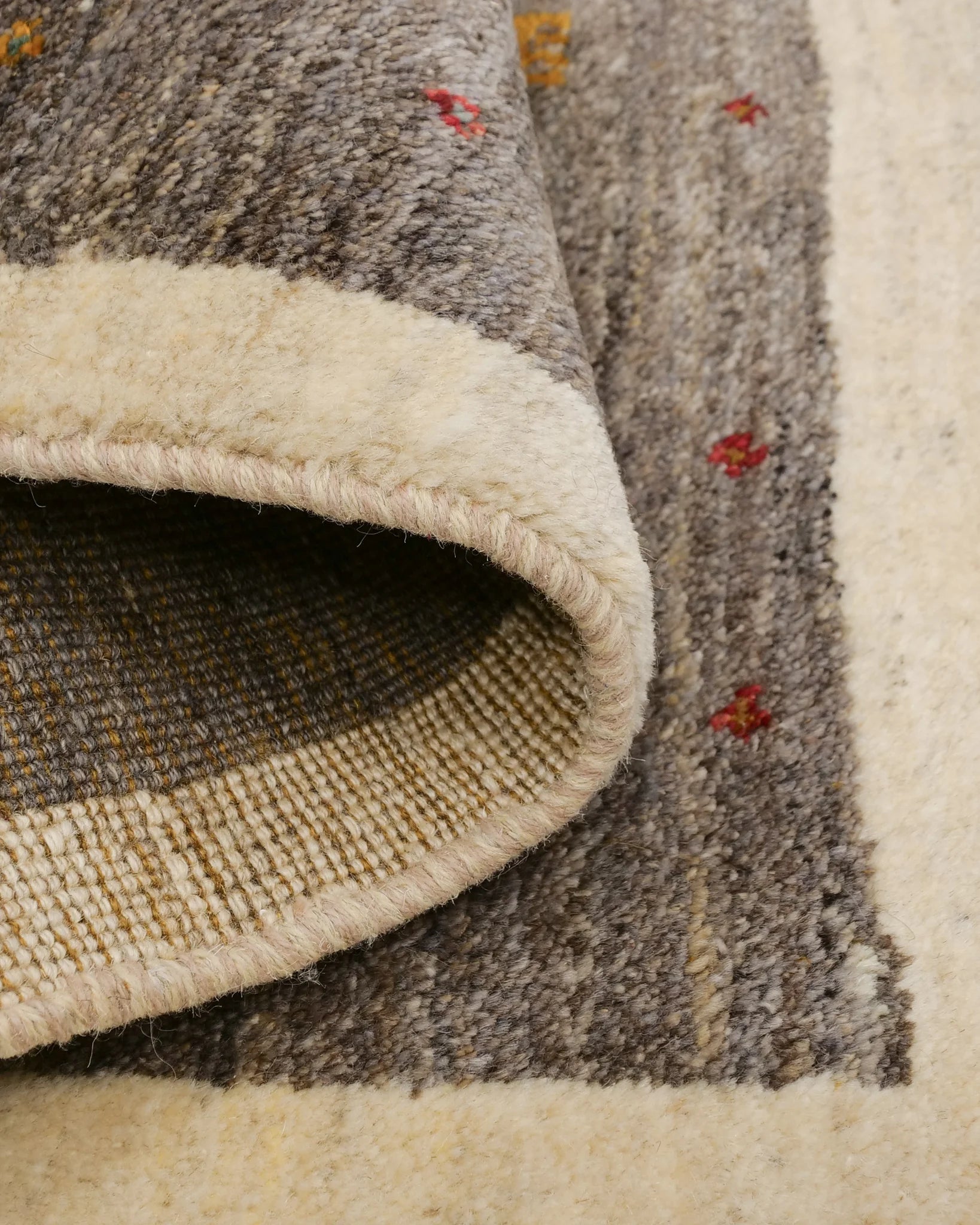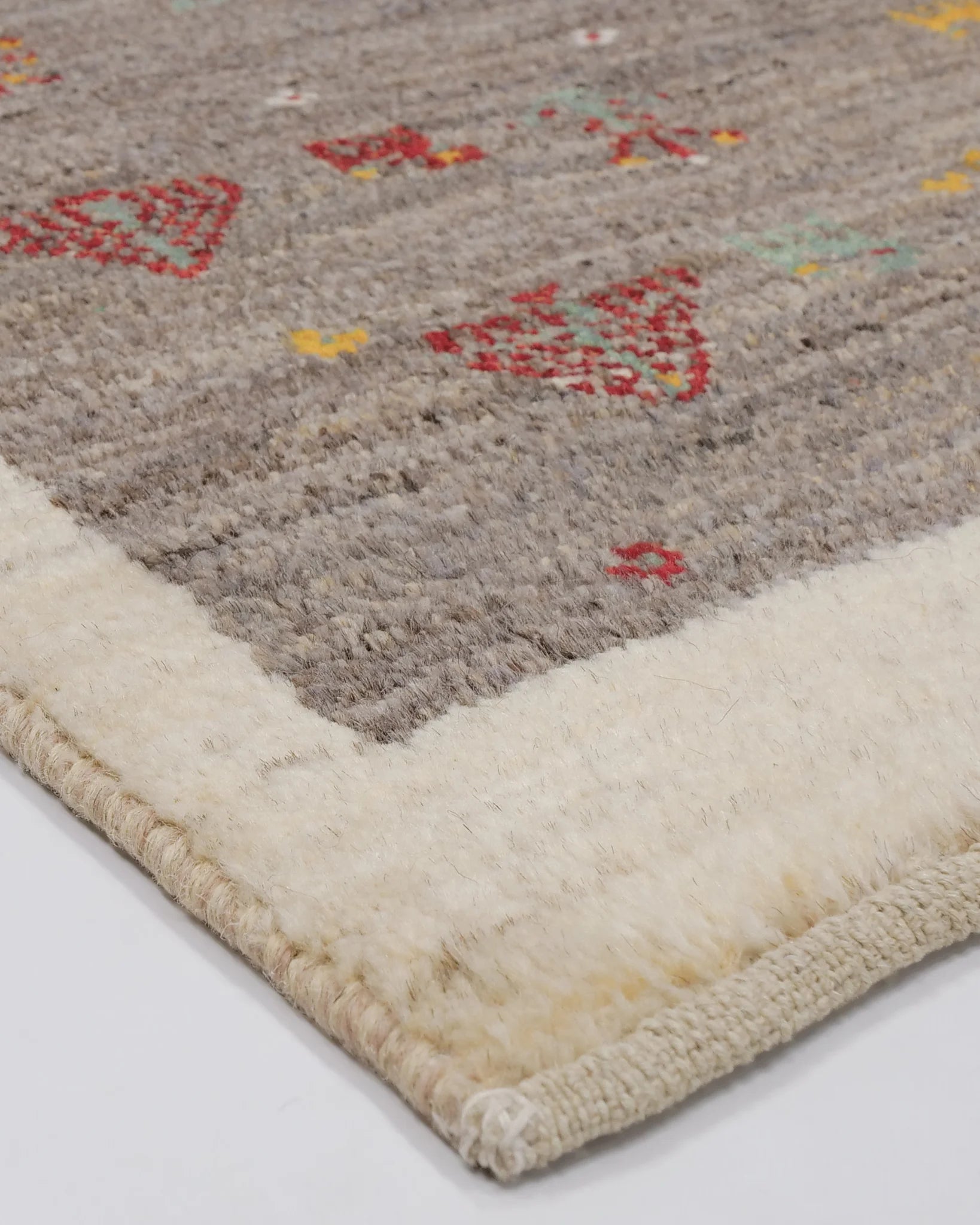 ペルシャギャッベはイラン南西部に住む遊牧民が織る伝統的な絨毯で、厚みがあり、羊を撫でているようなモコモコとした肌触りが特徴です。良質な羊毛を使用しており、柔らかくクッション性に優れ、冬は暖かく夏は涼しいため、1年を通して快適に使用できます。