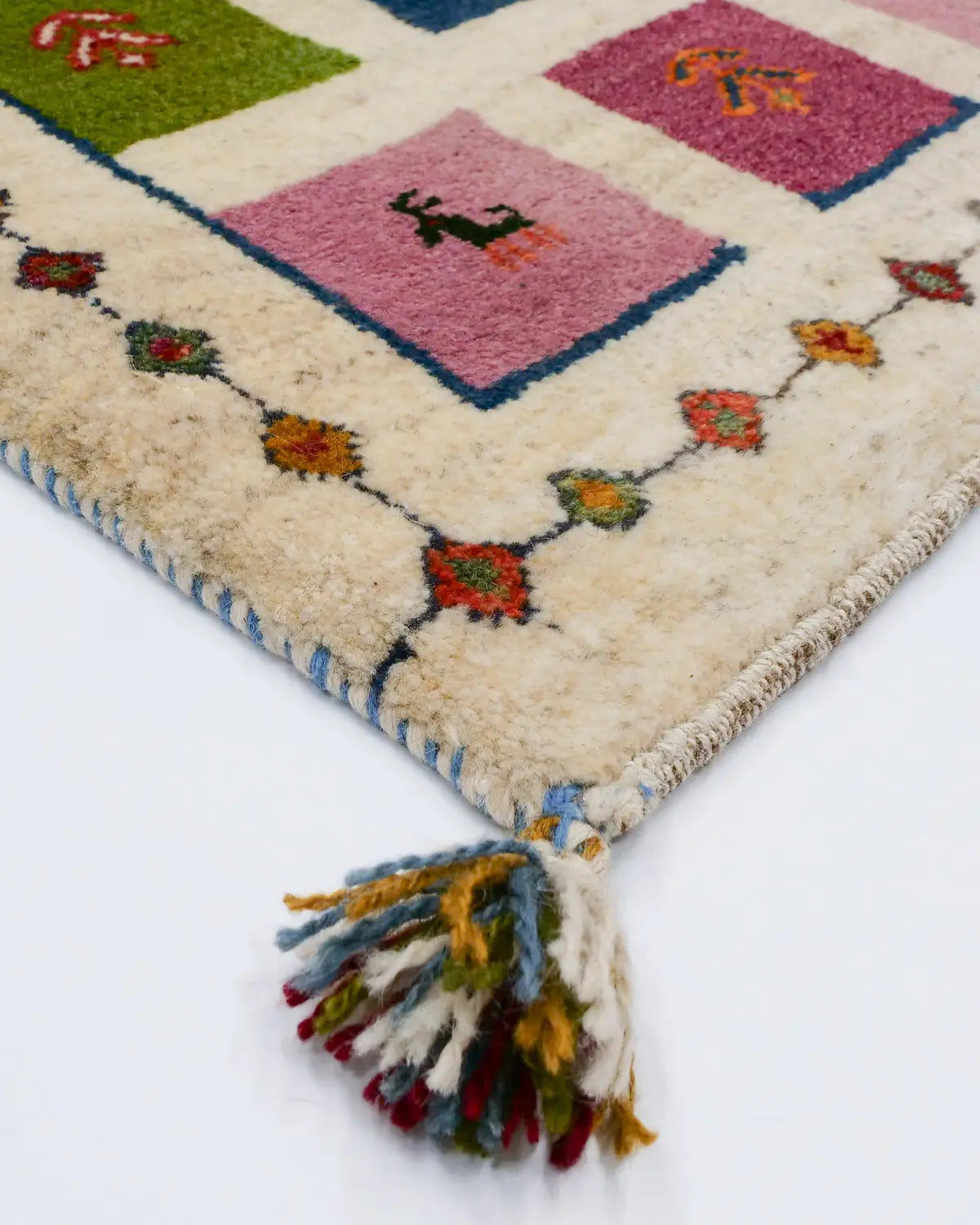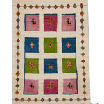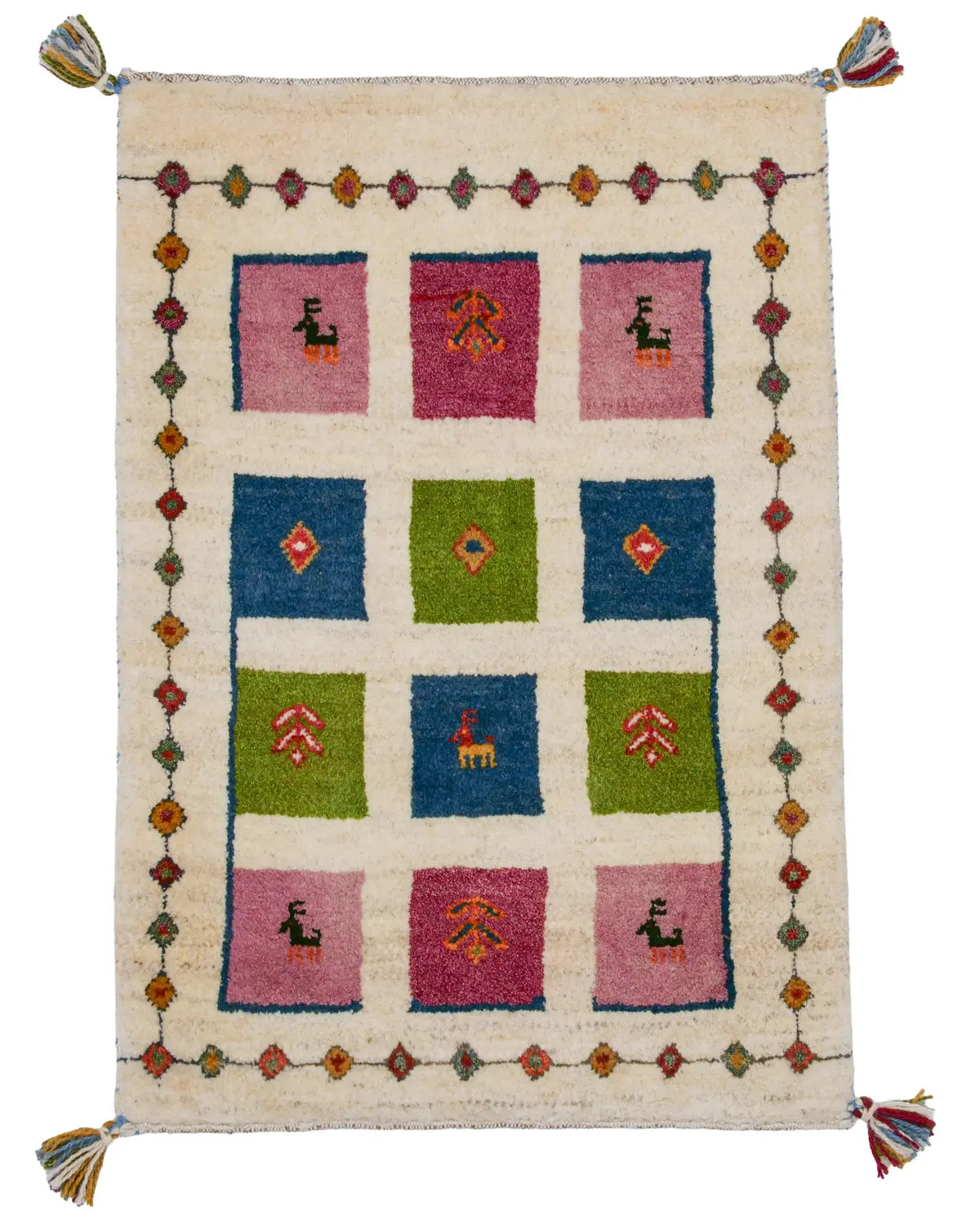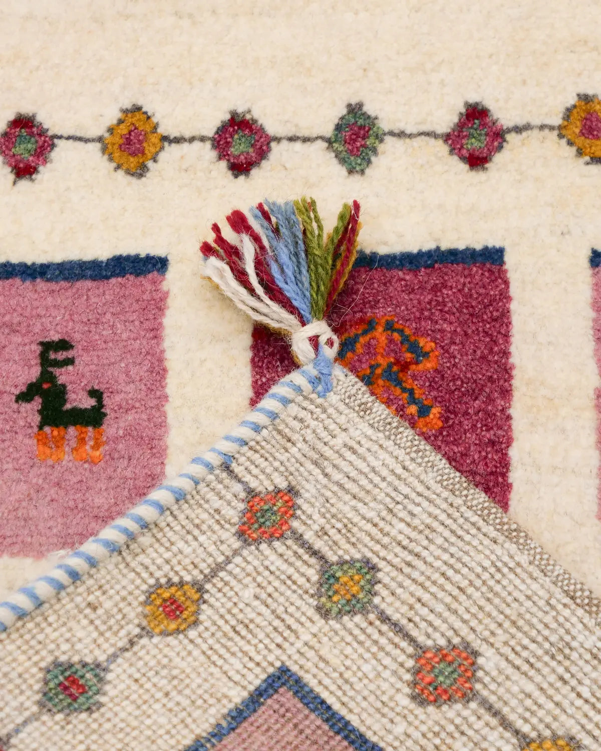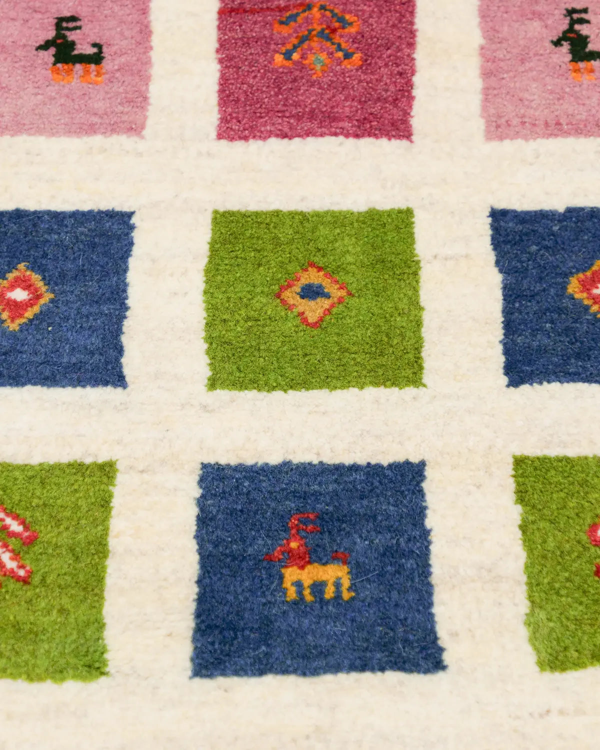 アイボリーを基調に、ピンク・ブルー・グリーンの四角が並び、ヤギや、生命の樹が織り込まれた一枚。