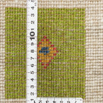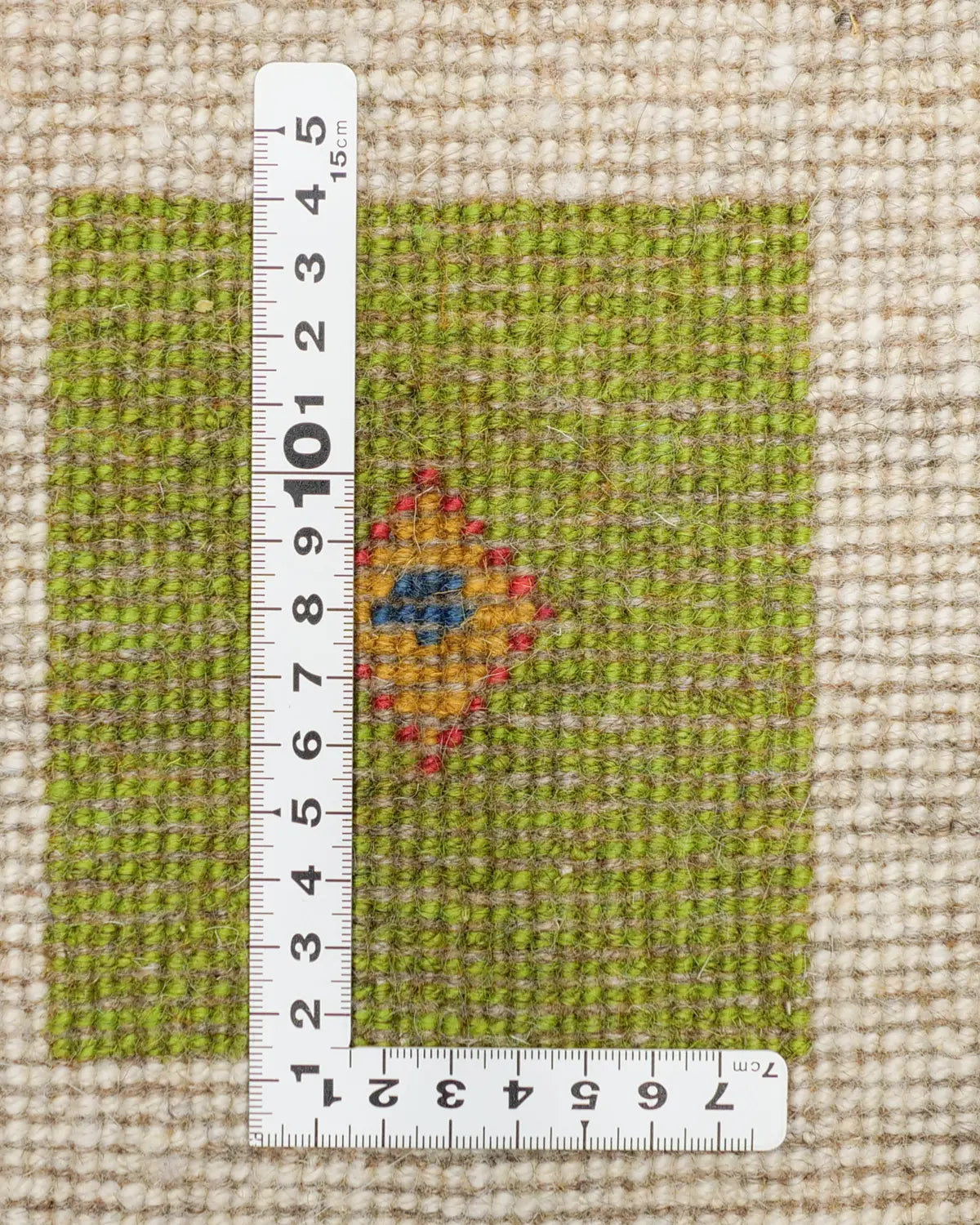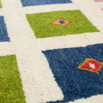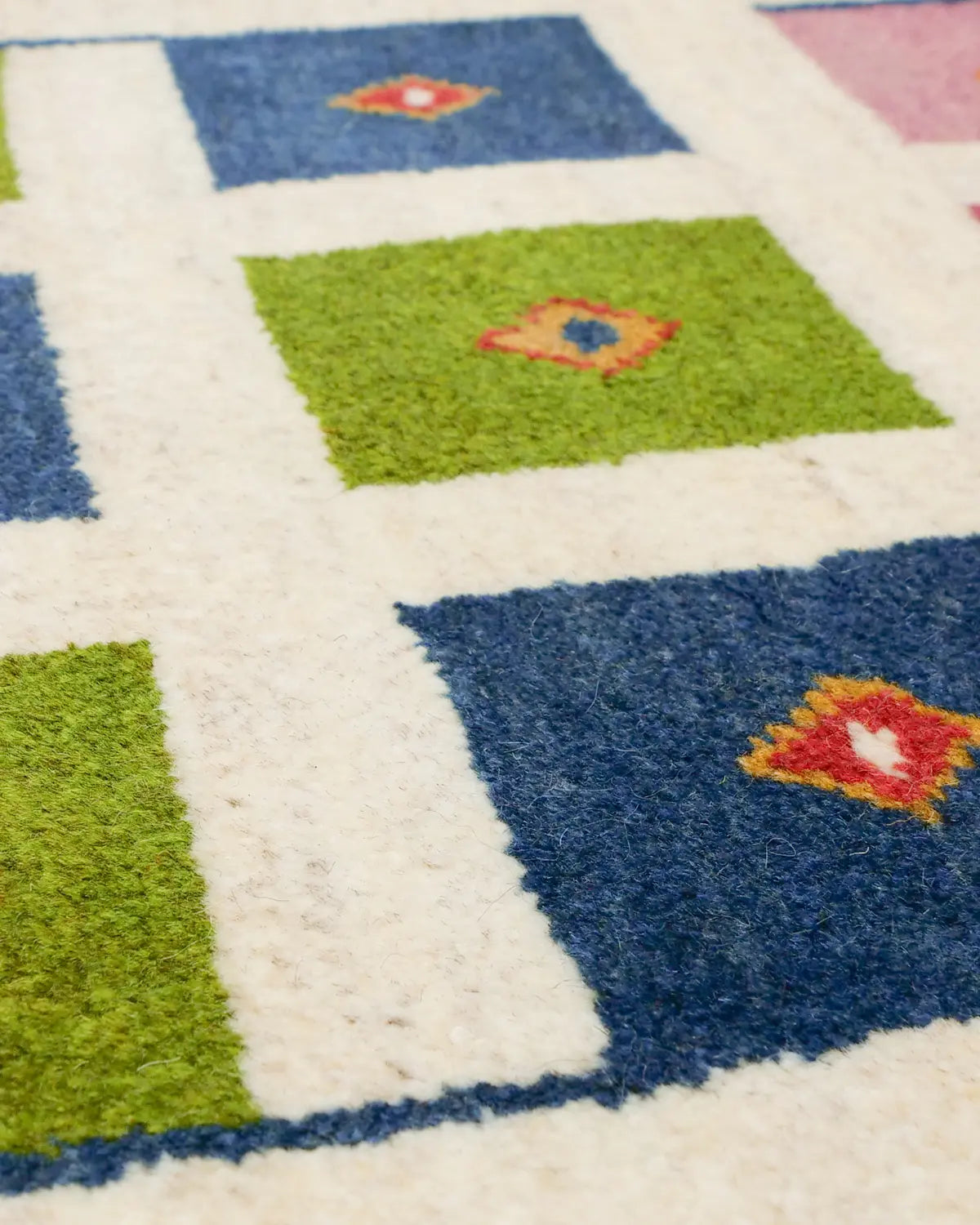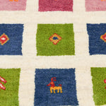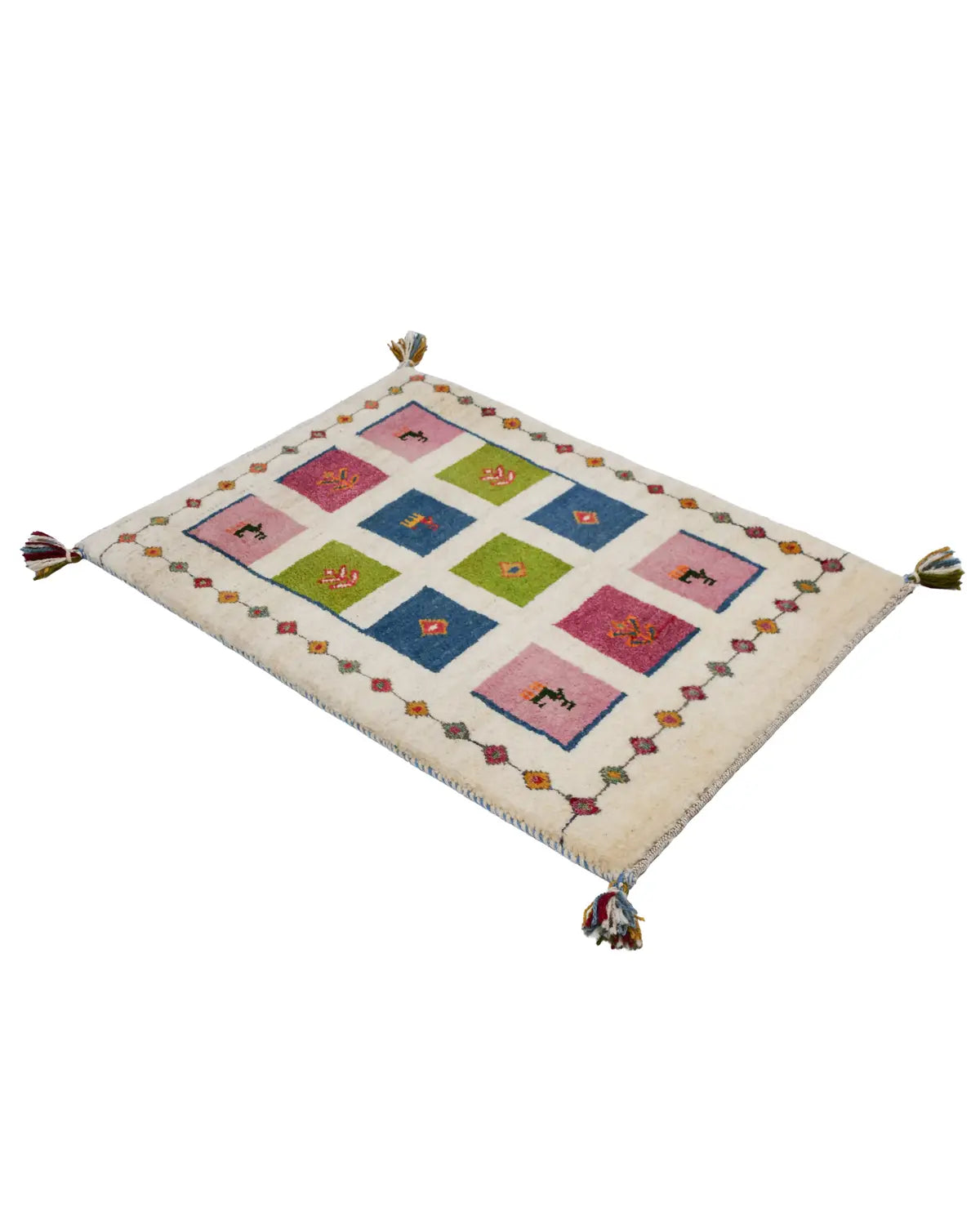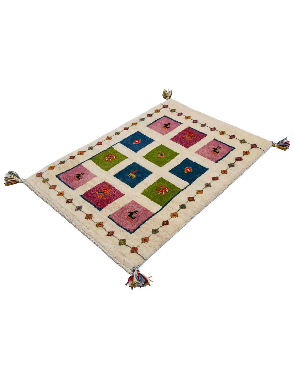 アイボリーを基調に、ピンク・ブルー・グリーンの四角が並び、ヤギや、生命の樹が織り込まれた一枚。