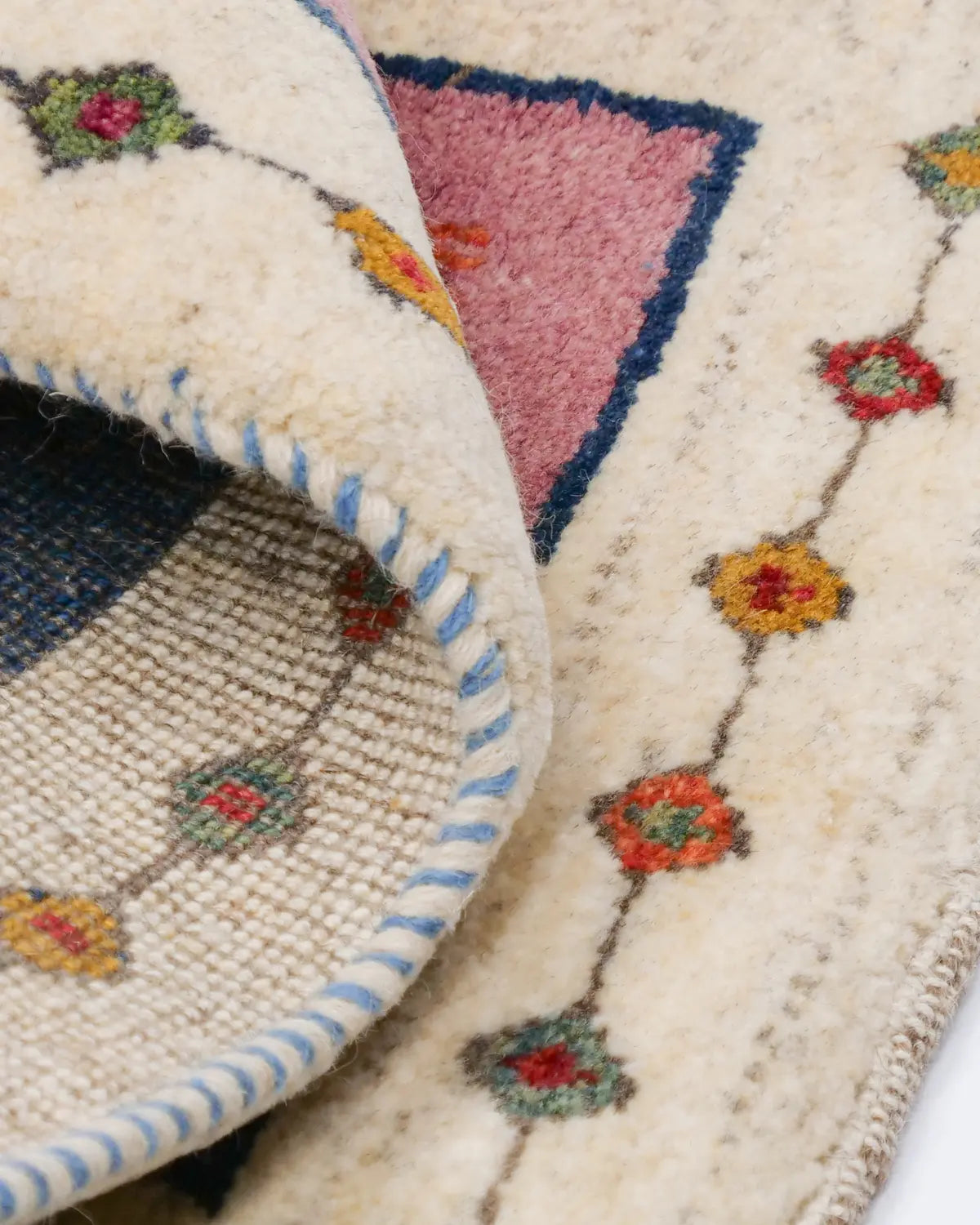 ペルシャギャッベはイラン南西部に住む遊牧民が織る伝統的な絨毯で、厚みがあり、羊を撫でているようなモコモコとした肌触りが特徴です。良質な羊毛を使用しており、柔らかくクッション性に優れ、冬は暖かく夏は涼しいため、1年を通して快適に使用できます。