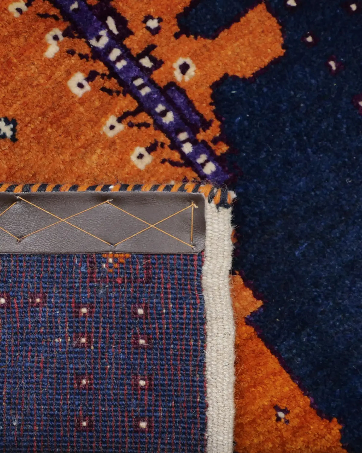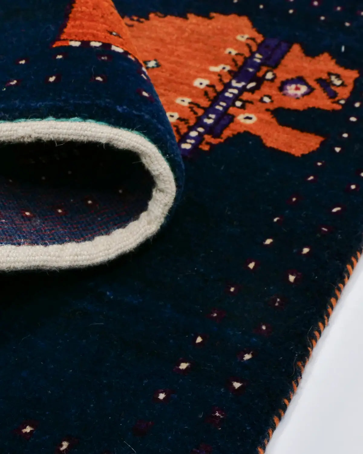 深いネイビーをベースに、鮮やかなオレンジのライオンが織り込まれた存在感たっぷりの一枚。