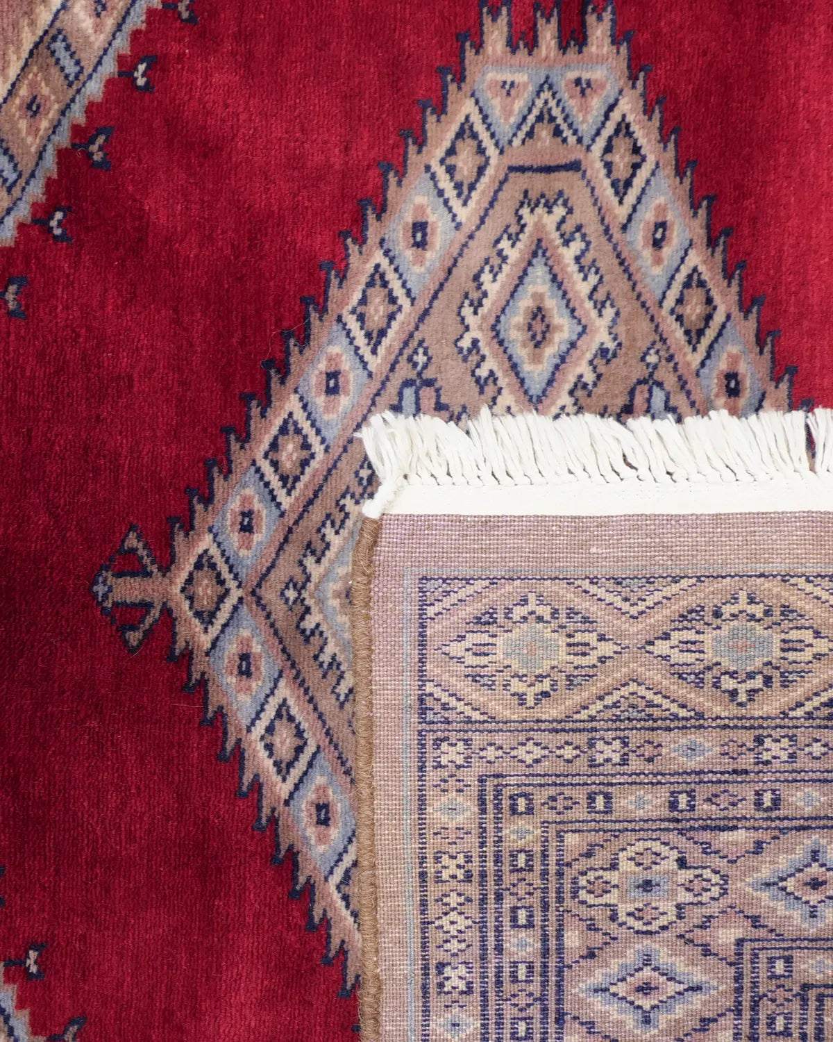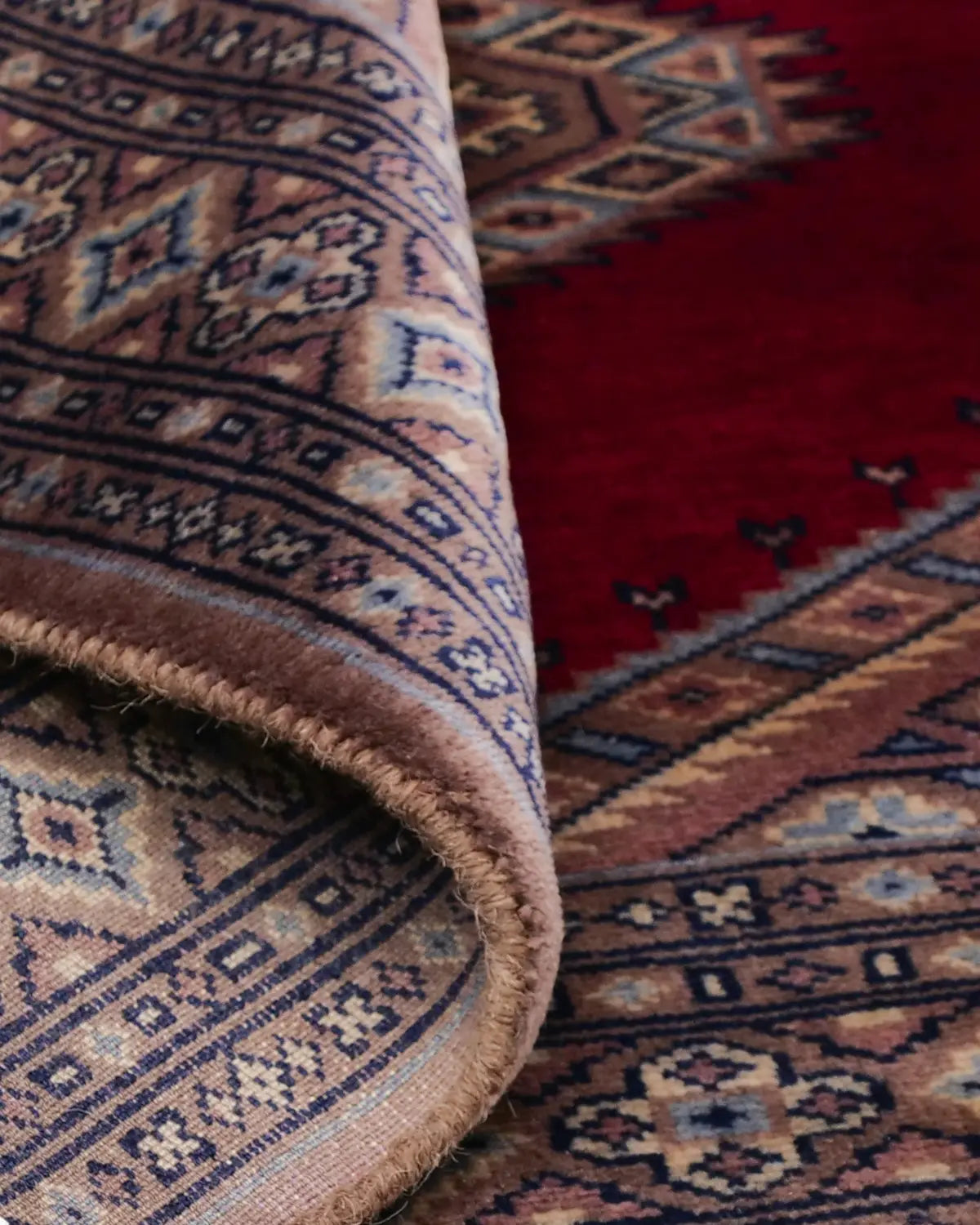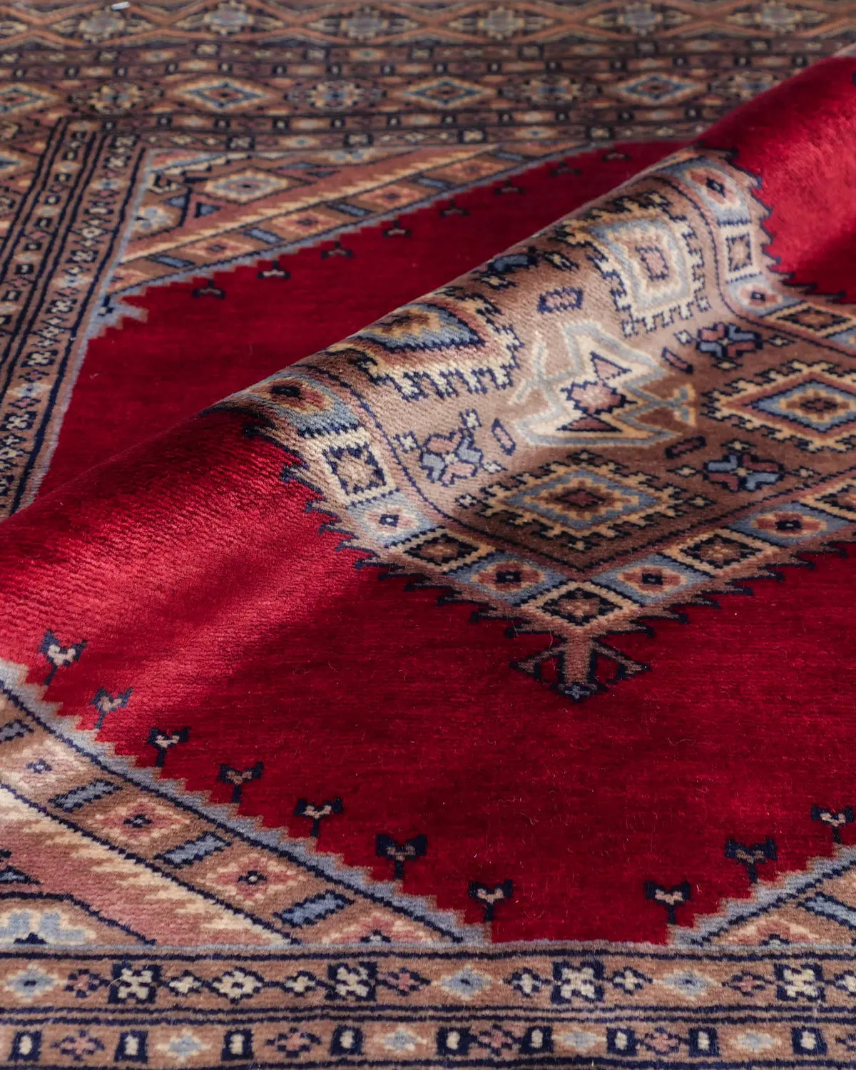 深みのある赤を基調とした中央フィールドに、精緻な幾何学模様のメダリオンが織り込まれた、クラシックで洗練されたデザインが特徴です。
