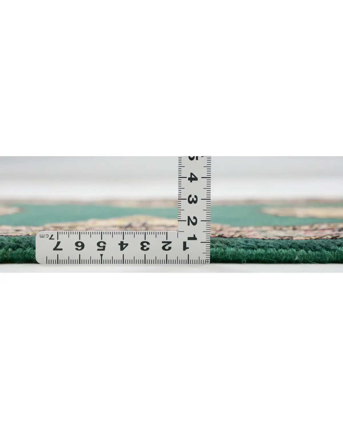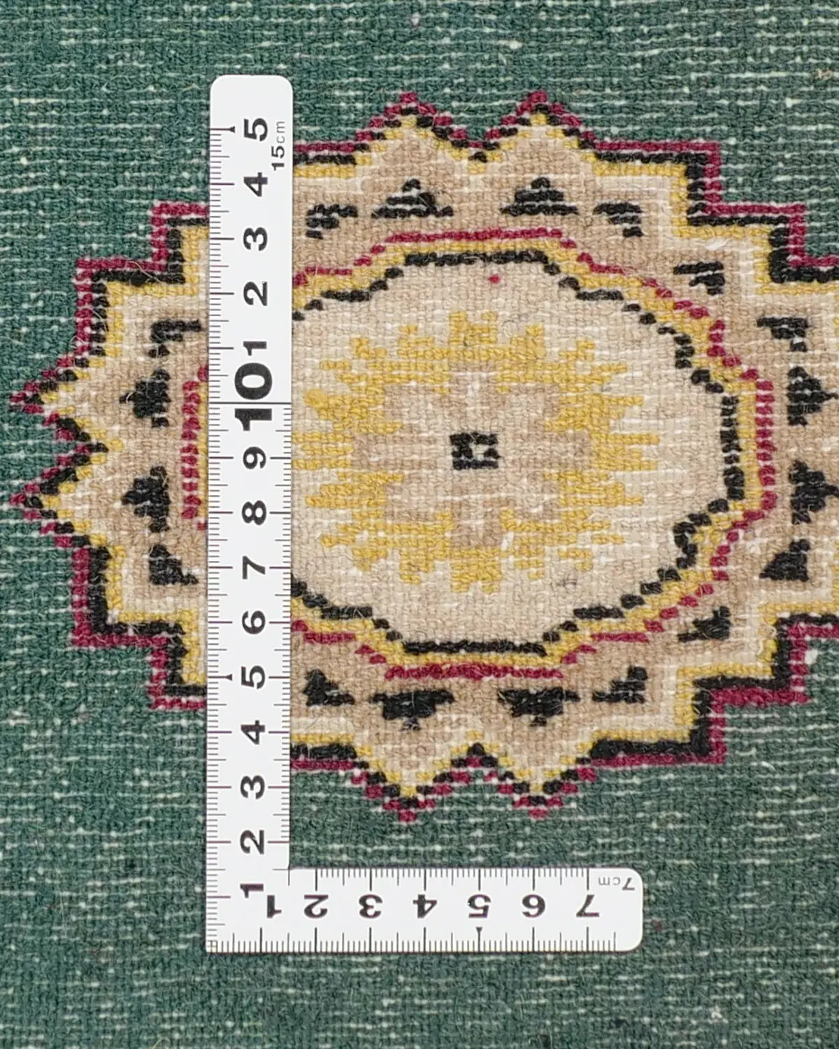 深みのあるグリーンに、花のモチーフのメダリオンが織り込まれています。