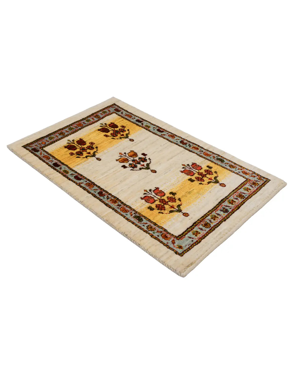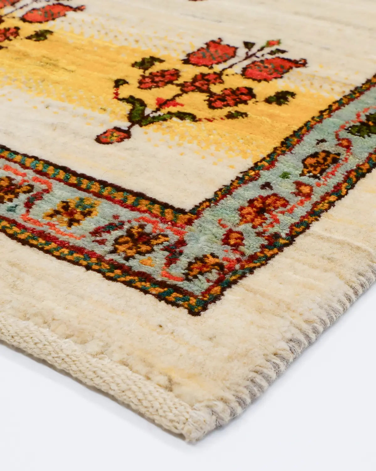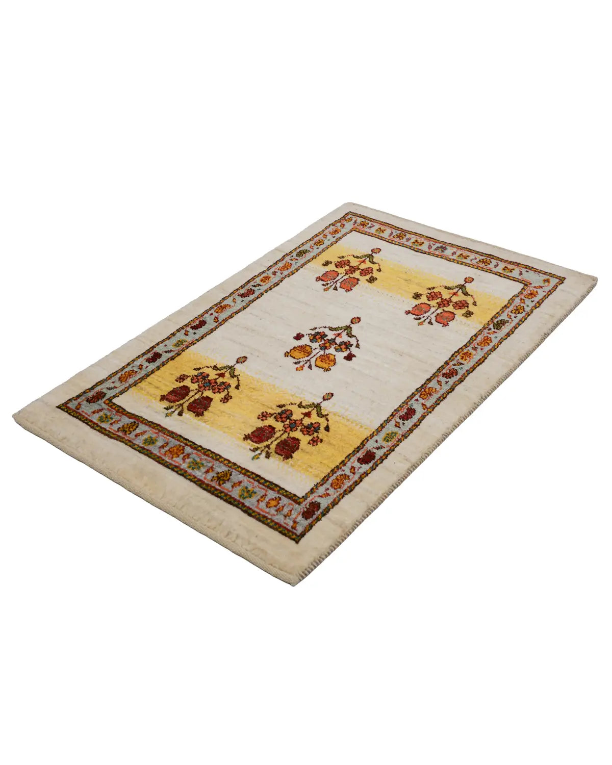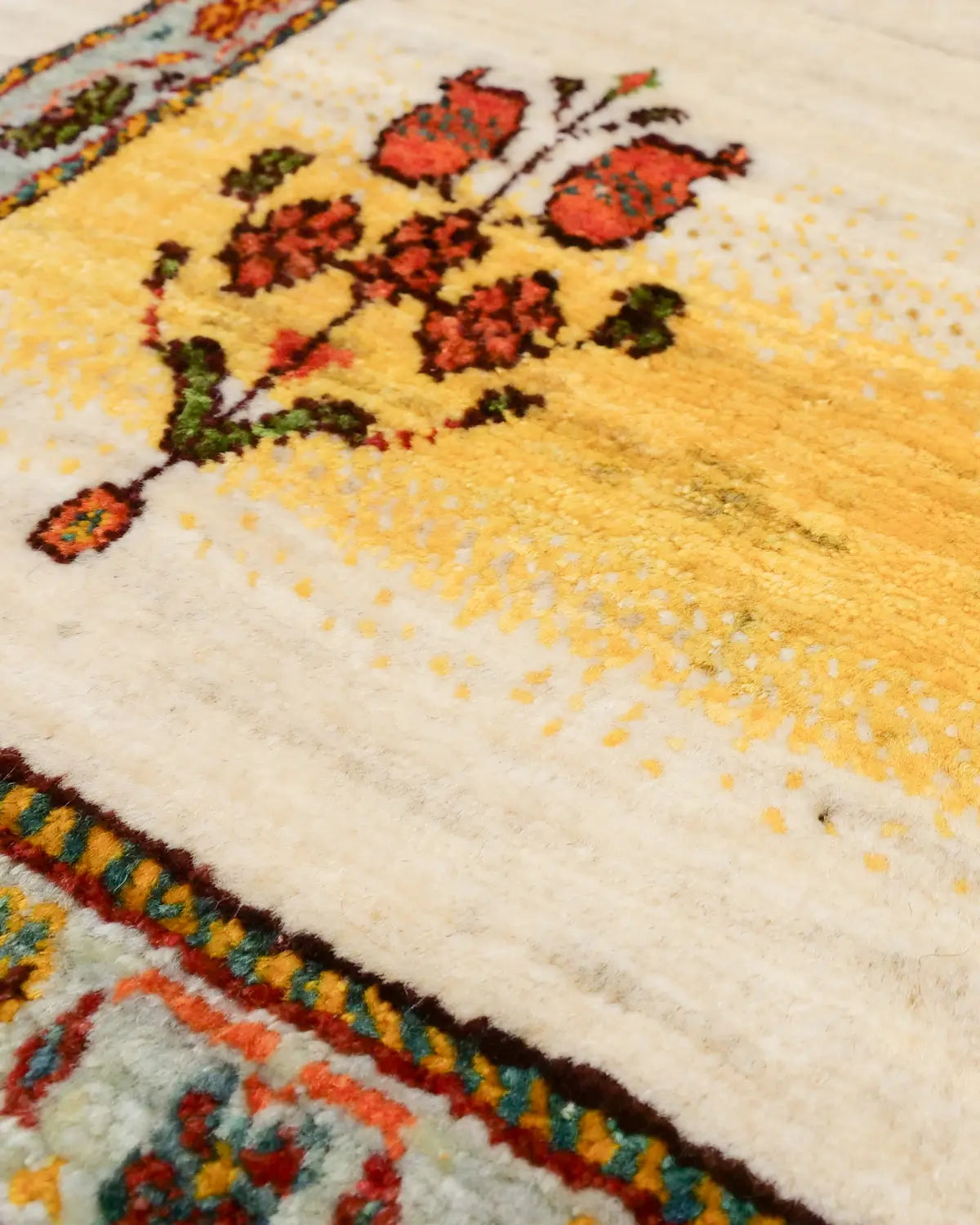 This Persian Gabbeh from Shiraz features a soft color base with pomegranate flowers woven into it.