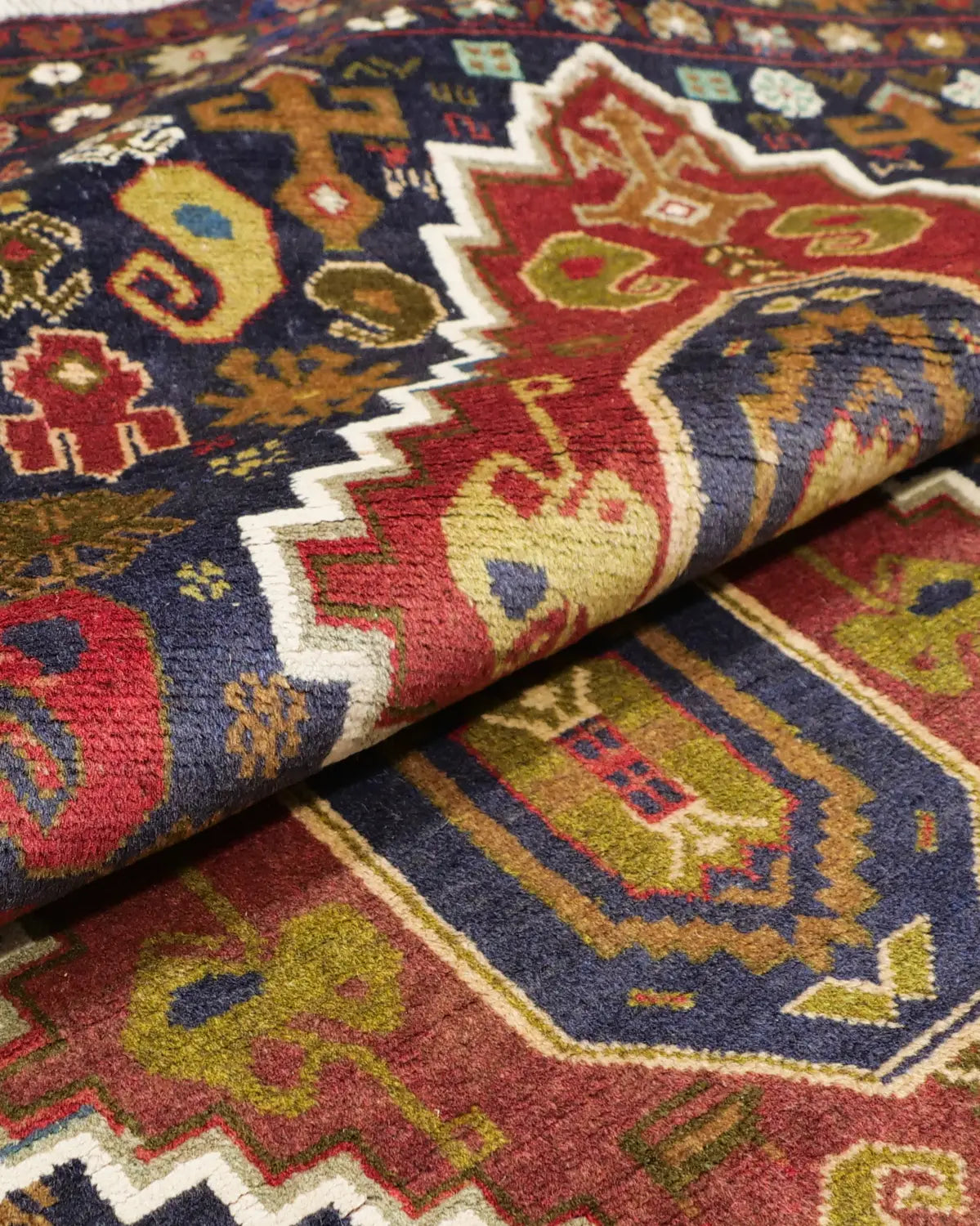 The rug has two large medallions at its center and a paisley pattern woven around it, giving it the presence of a typical tribal rug.