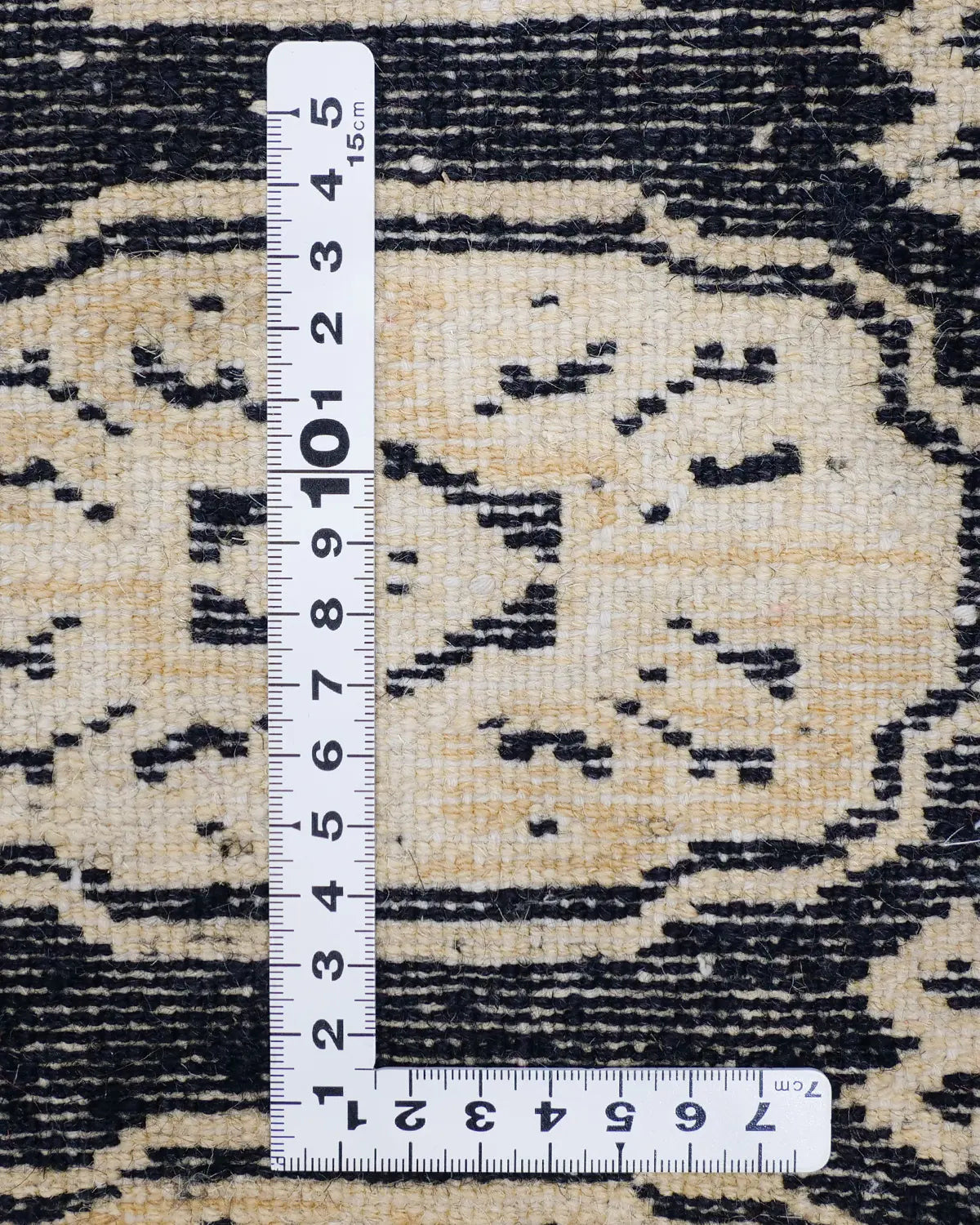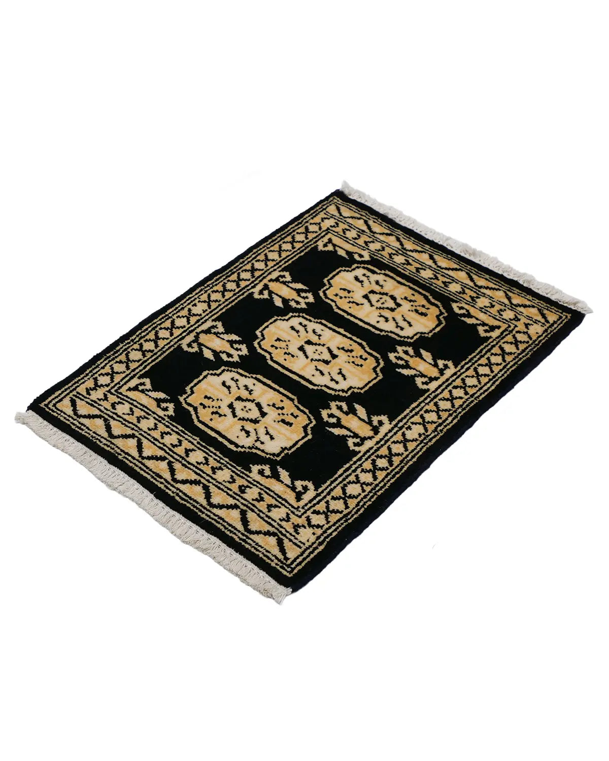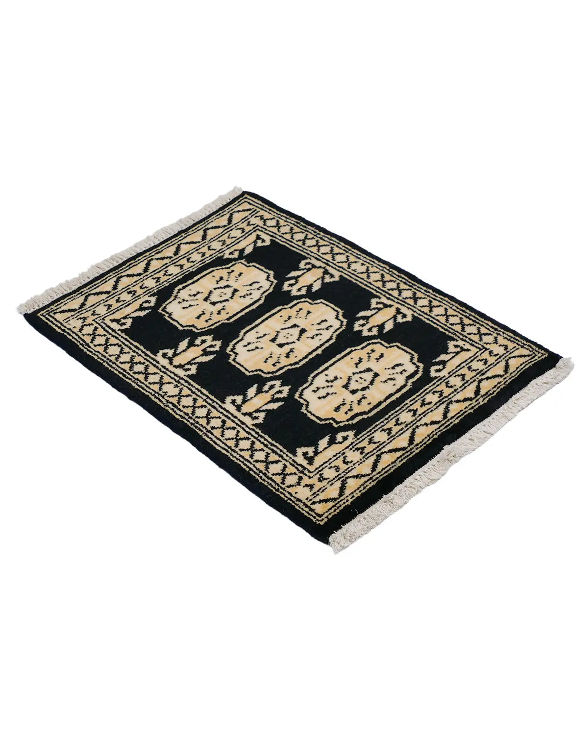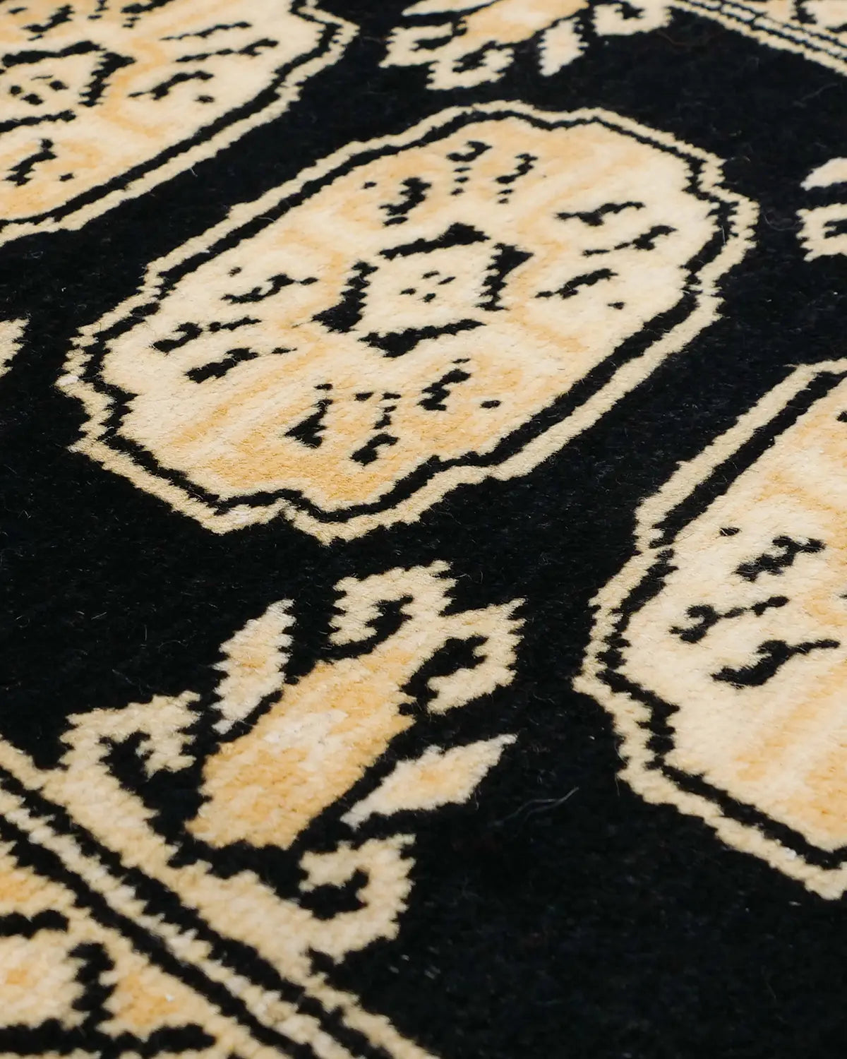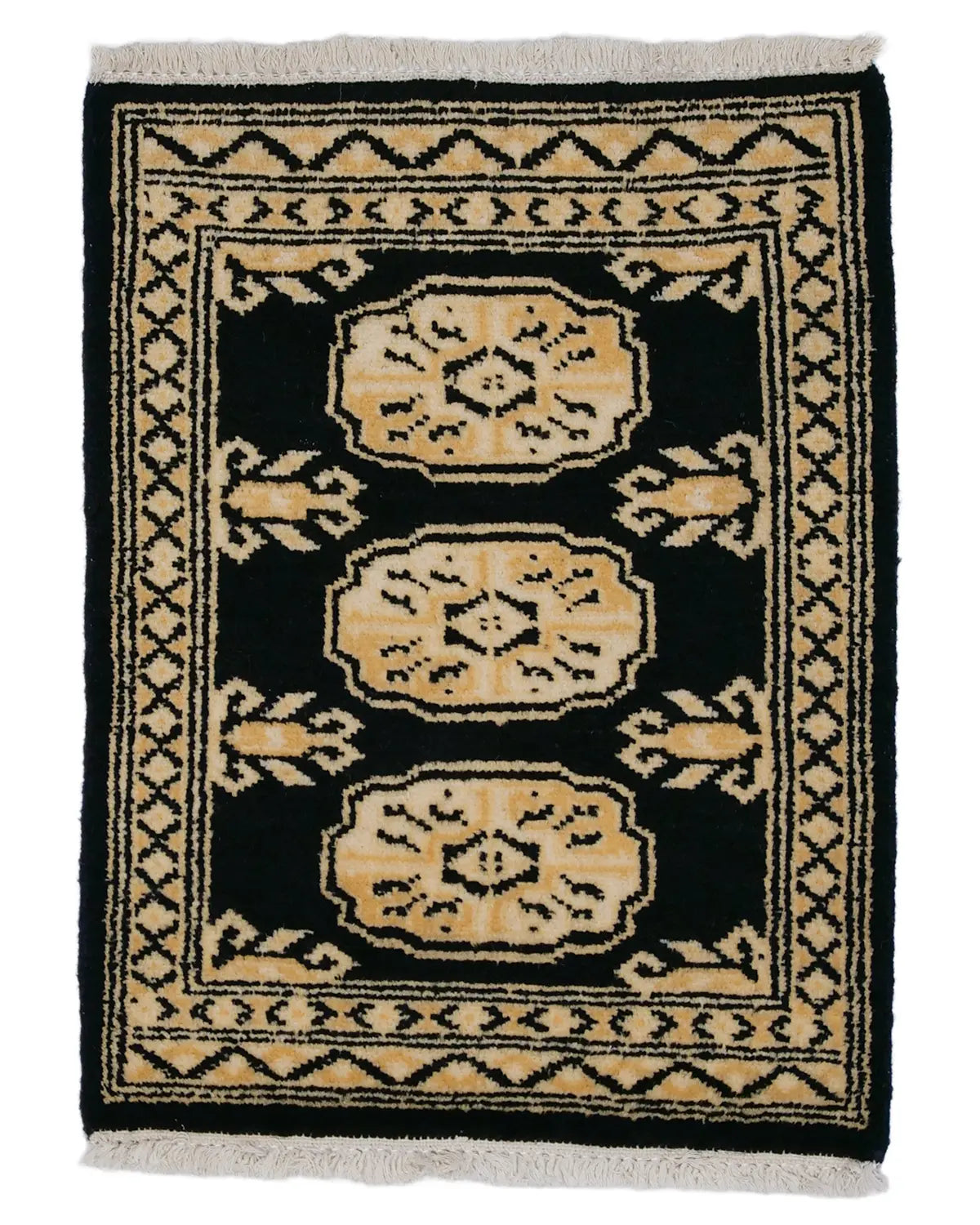 This Pakistani carpet from Lahore features three Bokhara patterns with elephant footprints as the motif.