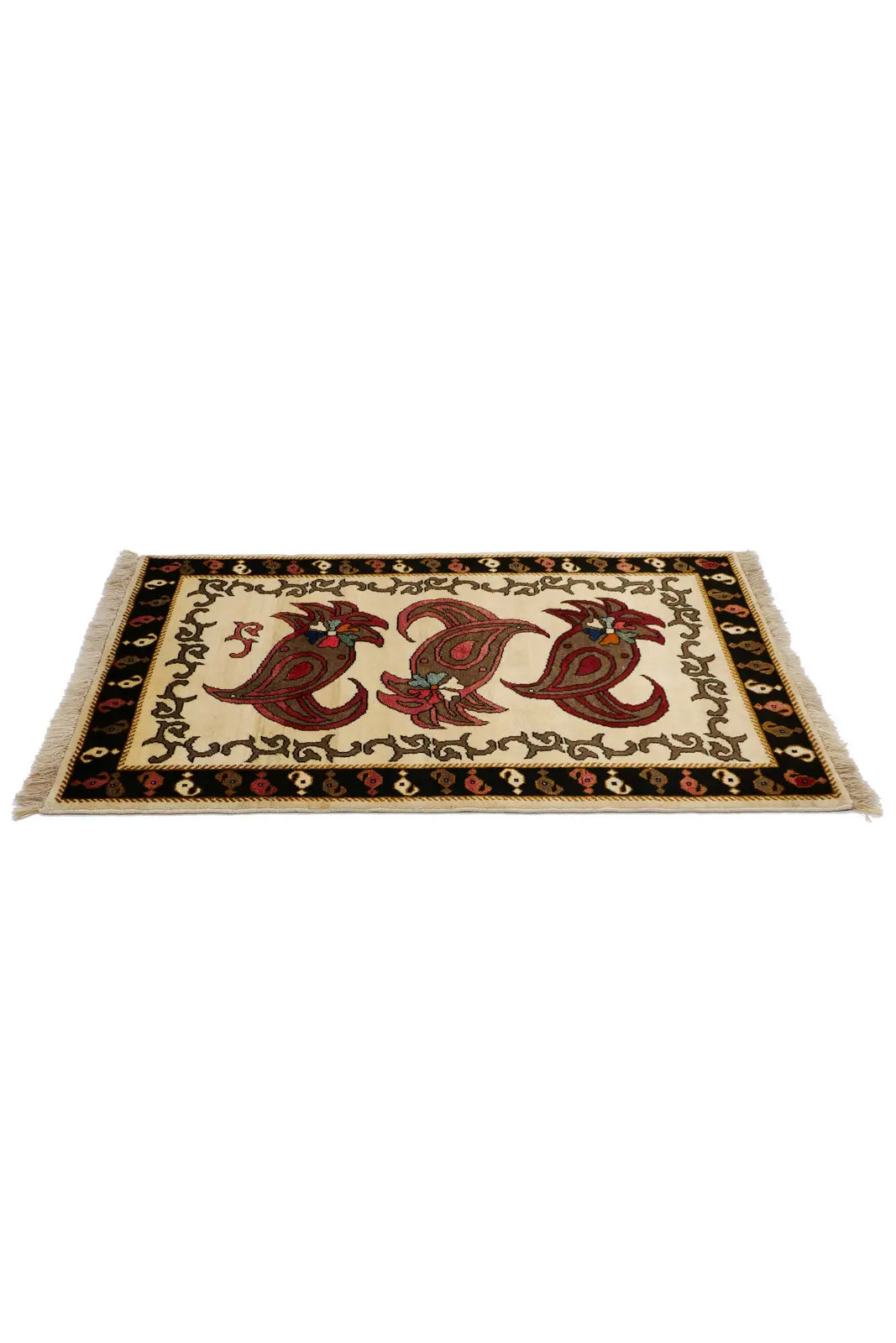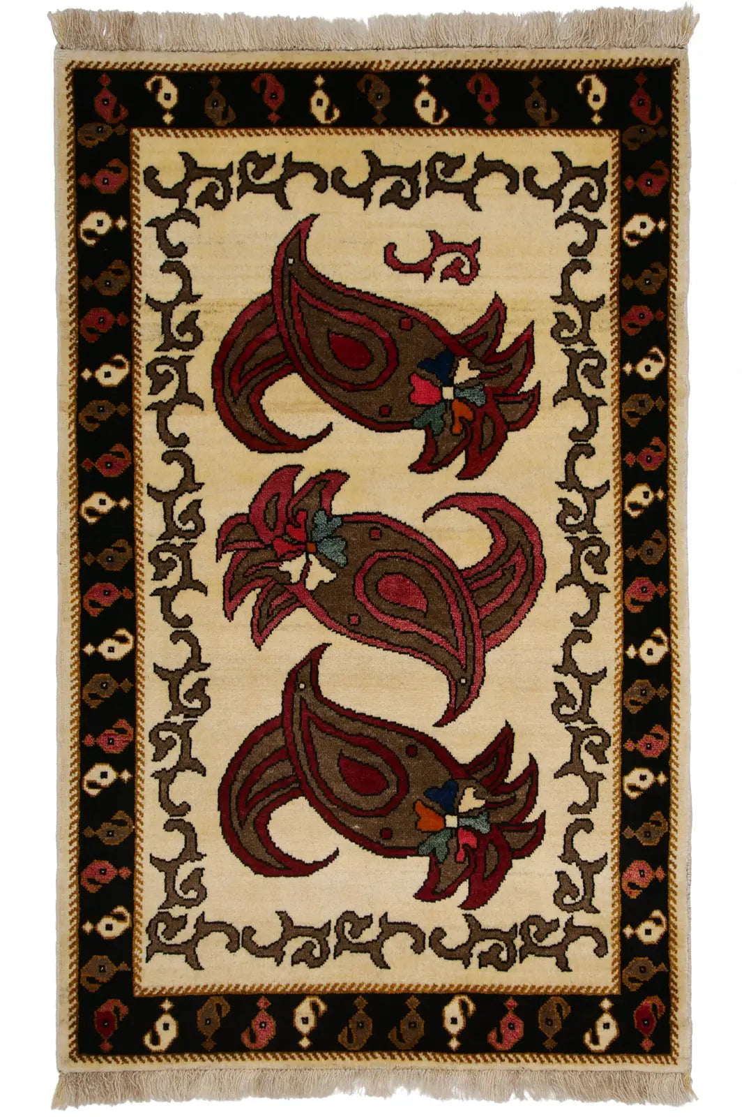 シーラーズ産ギャッベ。唐辛子の形を思わせるボテ(ペイズリー)文様が3つ織り込まれた手織りラグ