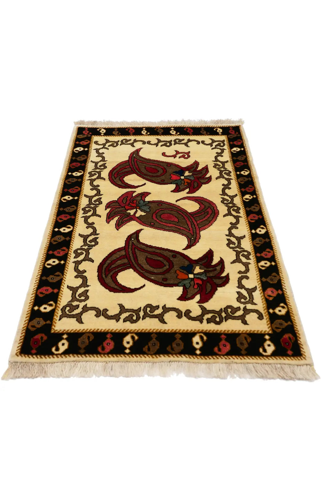 シーラーズ産ギャッベ。生成りベースに赤と茶のペイズリー文様が映える美しいラグ